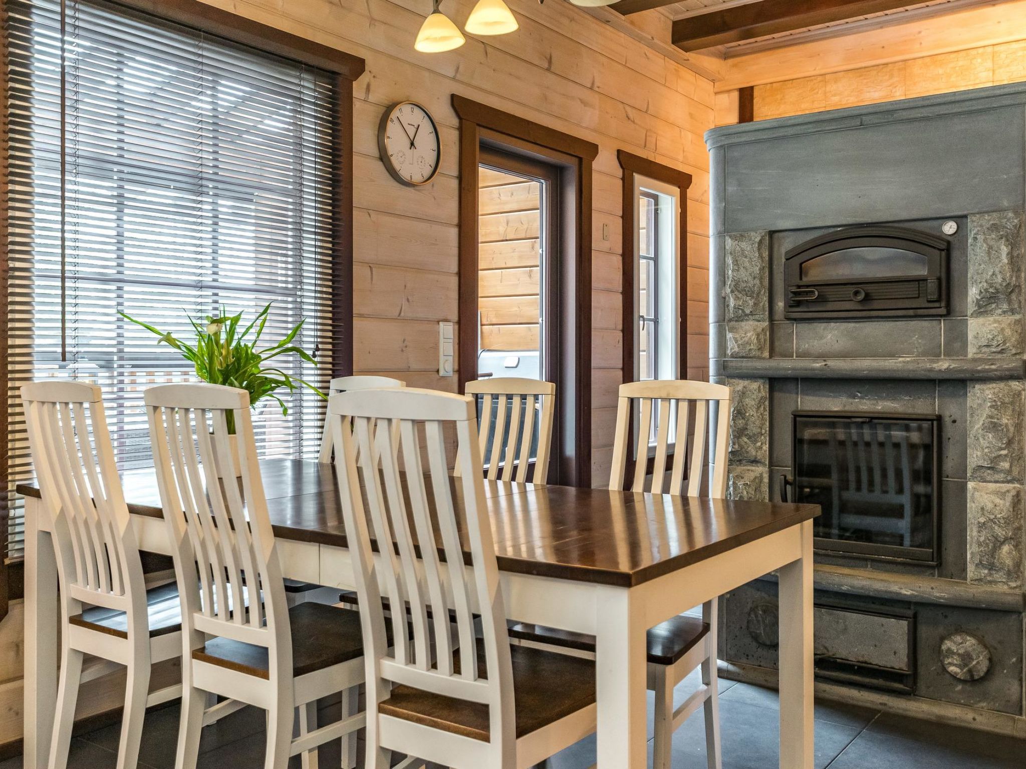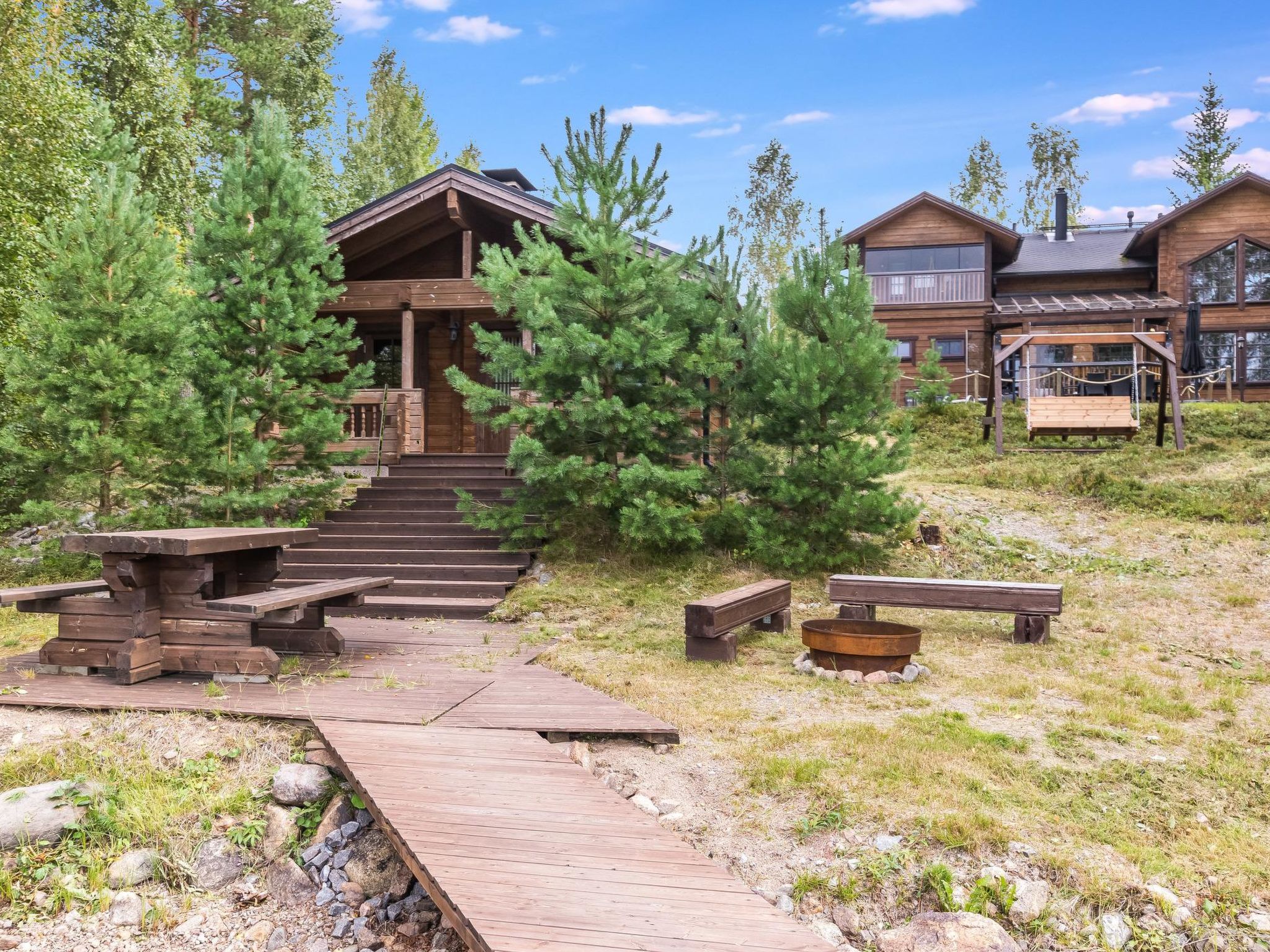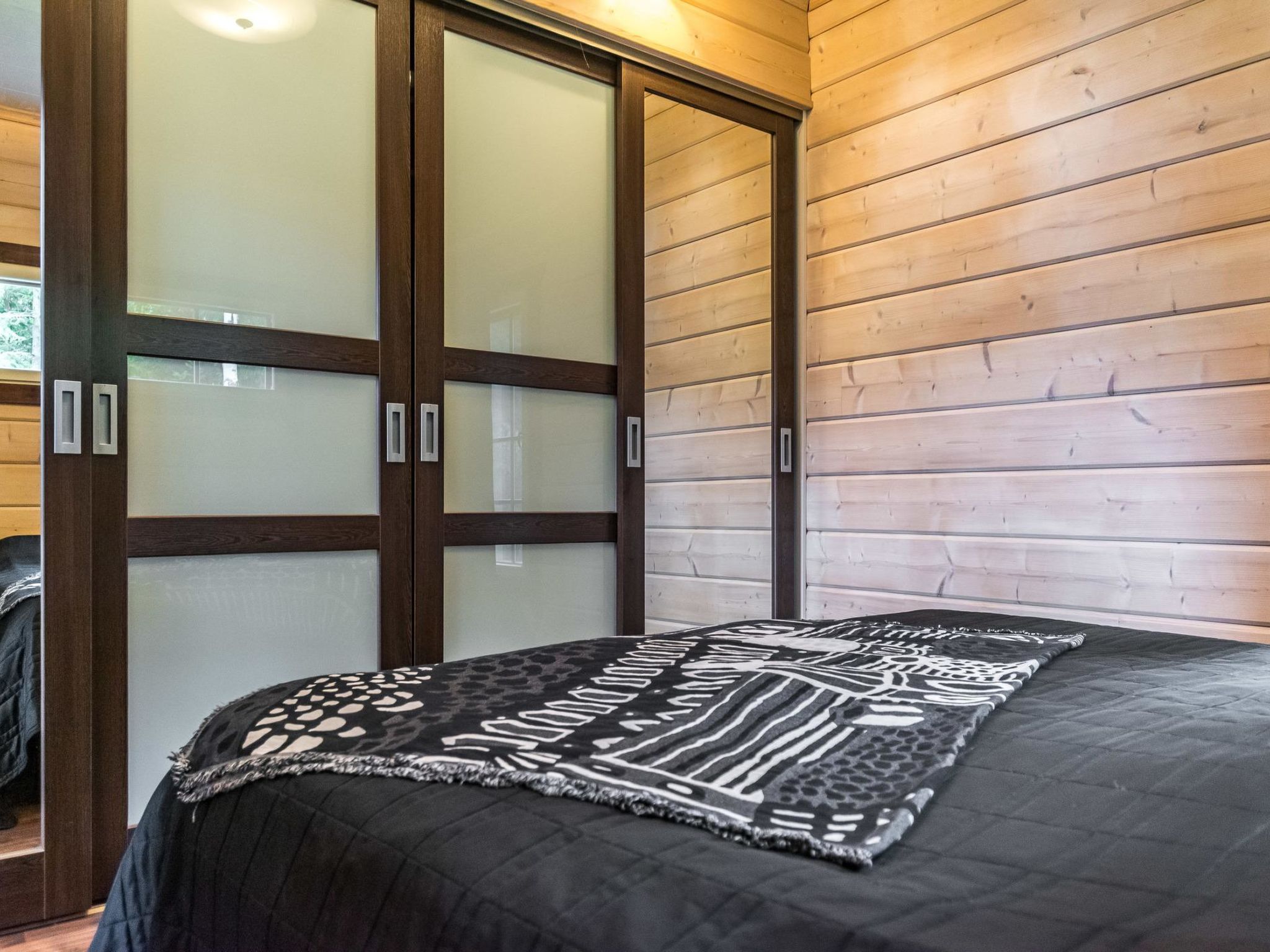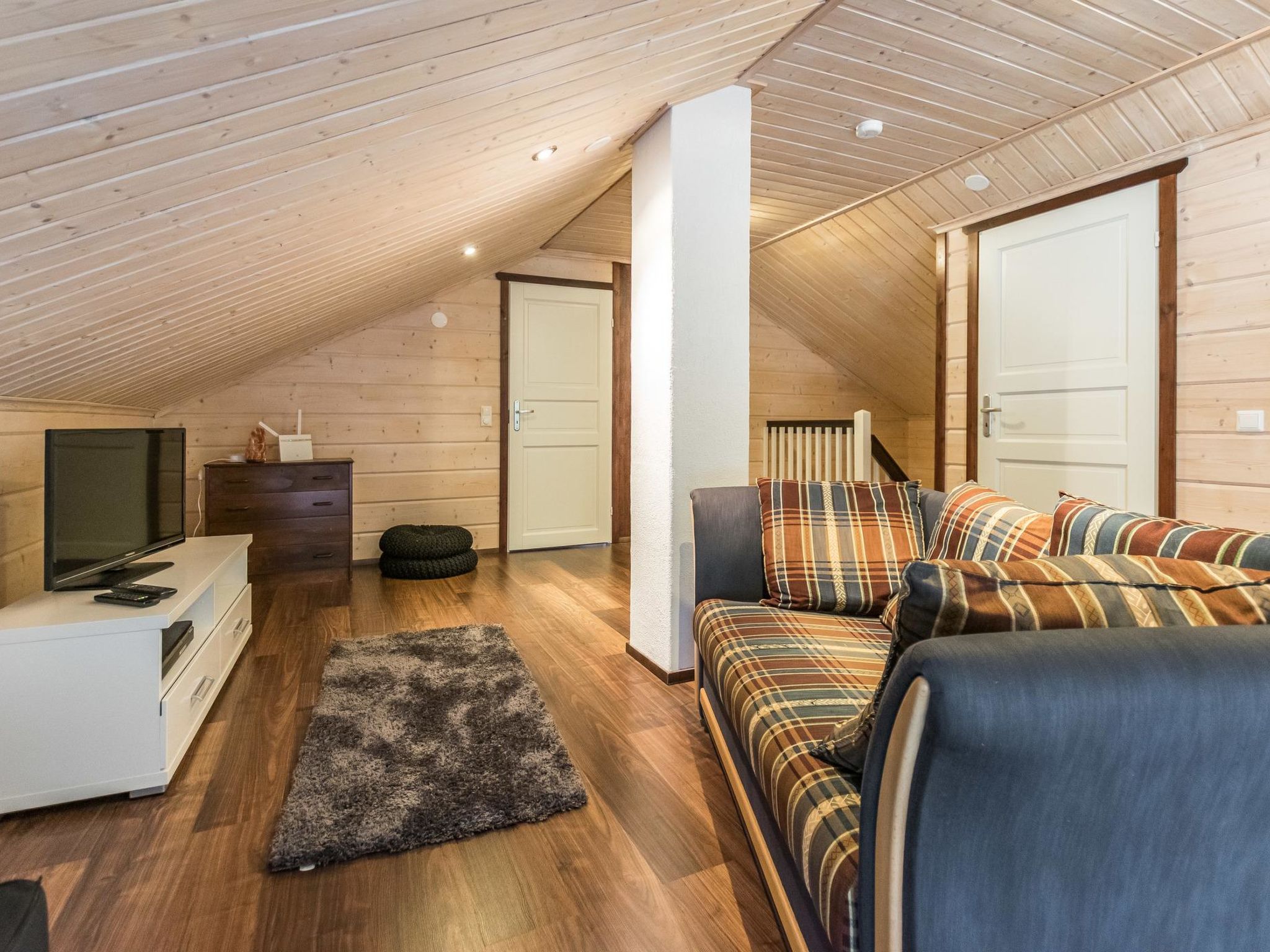 Mäntyranta ist ein geräumiges Haus, das für eine größere Gruppe oder zwei Familien geeignet ist. Das Haus bietet gute Angelmöglichkeiten am See Rutajärvi. Der Leivonmäki-Nationalpark liegt in der Nähe und ist am gegenüberliegenden Ufer des Sees zu sehen. Das Haus ist modern, gut ausgestattet und gemütlich, ideal für den Urlaub. 45 km südlich von Jyväskylä, See Rutajarvi 30 m (Länge 5 km, Breite 2,3 km), zuerst flacher Kiesstrand, dann schnell tiefer werdend, eigener Pier, Ruderboot, Außenbordmotor zu mieten. Große Blockhausvilla (2008). Im Erdgeschoss Küche, Hauswirtschaftsraum, Wohnzimmer, Schlafzimmer 1: Doppelbett 180x200 cm, WC, Sauna (sogenannter Elektrosaunaofen), Waschraum (3 Duschen) mit Hydromassage-Badewanne. Verglaste Terrasse mit grosser, nicht überdachte Terrasse davor. Im Obergeschoss, WC, drei Schlafzimmer (1. Schlafzimmer: 1 Bett 120x200 cm, 2. Schlafzimmer: 2 Betten 80x200 cm, 3. Schlafzimmer: 2 Betten 90x200 cm), Vorraum mit Schlafcouch (Länge 196 cm) und TV. Garage und Carport auf dem Hof. Der Carport steht dem Mieter zur Verfügung, aber nicht die Garage. Separate Seesauna mit Strom, Elektroheizung, Schlafsofa (140x190 cm) als Bettalternative. Waschraum mit Kessel zur Warmwasserbereitung, Saunaraum mit holzbeheiztem Saunaofen. Wasser in die Sauna muss mit einem Eimer aus dem See gebracht werden. Vor der Sauna befindet sich Lagerfeuerplatz, mit herrlichem Blick auf den See. Dieses Reiseziel bietet Platz für bis zu 8 Personen, einschließlich Kinder. Das Objekt ist am Anreisetag ab 17.00 Uhr verfügbar. Das Haus verfügt über Überwachungskamerasystem, welcher jedoch nicht verwendet wird, wenn sich Mieter im Haus befinden. Sonniges Hanggrundstück, das zum Strand hin abfällt. Toller Blick auf den See vom Haus und Hof. Gemütliche verglaste Terrasse, die Sie auch bei kühlerem Wetter genießen können. Nationalpark Leivonmäki 16 km, Jyväskylä 55 km, Leivonmäki 5 km, Bäckerei und Restaurant Karoliinan kahvimylly (in Leivonmäki) 6 km.