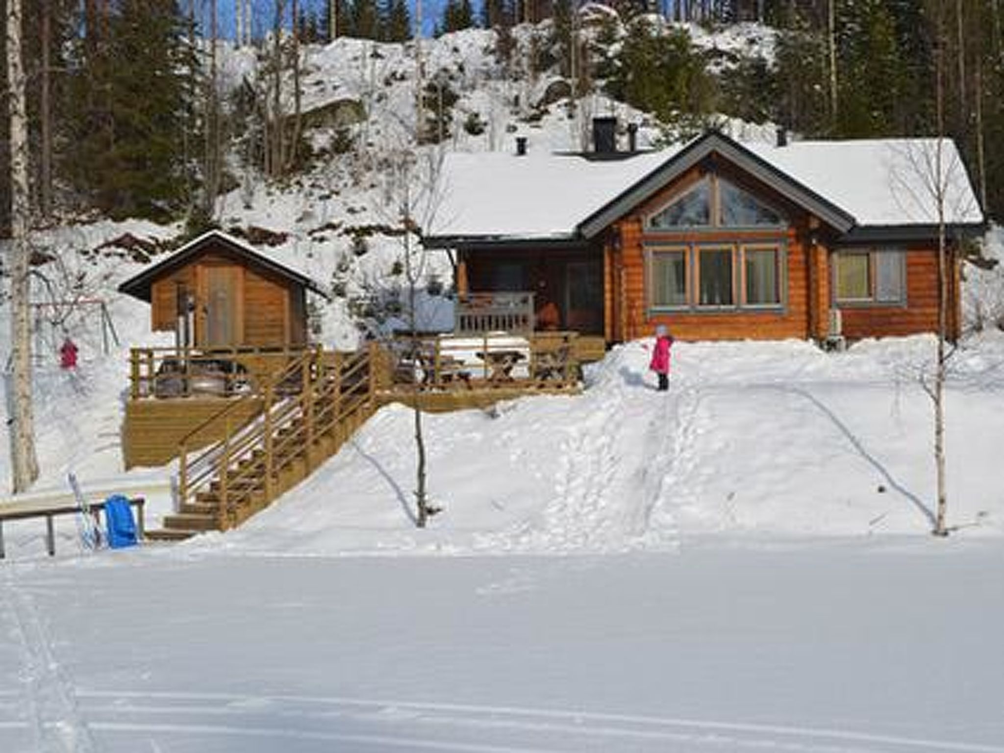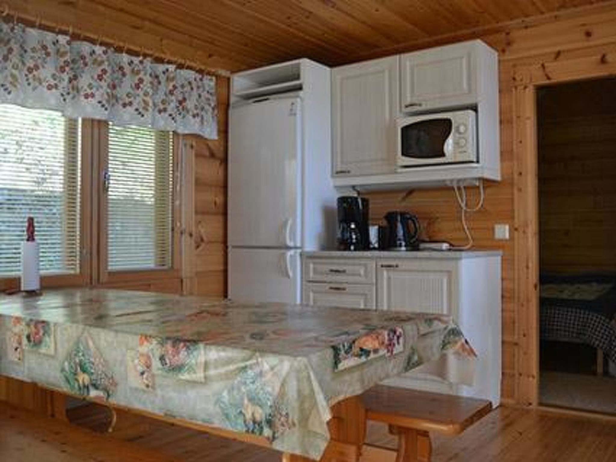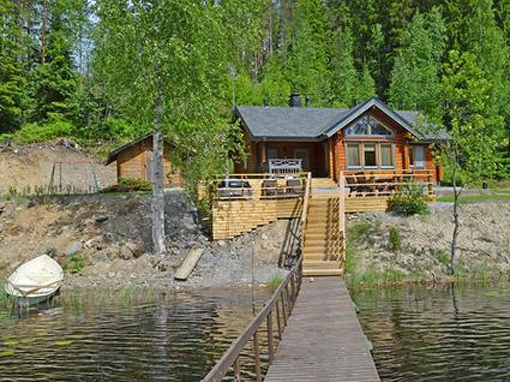64 km westlich von Tampere, See Suodenjärvi 20 m (Länge 2 km, Breite 200 m), tiefer und weicher Lehm-/Schlammboden, eigene Anlegestelle und Boot. Blockferienhaus, Baujahr 2005, Wohnküche mit Schlafsofa, 2 Schlafzimmer mit je 1 Doppelbett, Schlafboden mit 4 Zustellbetten (steile Treppe zum Dachboden, niedrige Decke), Waschraum, Ankleidezimmer, Sauna, Veranda. Es gibt eine Luftwärmepumpe. Whirlpool auf der Terrasse kann gemietet werden (€ 120/Buchungszeitraum, Kunde heizt ihn selbst mit Holz auf, Zahlung direkt an den Eigentümer). Die Wanne kann nicht gemietet werden, wenn das Winterwetter sehr kalt ist. Blockhaus am kleinen See. Fischarten: Zander, Barsch und Hecht. Der Hofbereich ist eben und hell, im Hinterhof gibt es steilen Hang. Für Kinder Schaukel und Sandkasten verfügbar. In der Nähe befinden sich Naturpfade, Aussichtsturm, sowie ein 4 km entfernter Suomu-Angelplatz, wo Sie nach Regenbogenforellen fischen können. Der Eigentümer verkauft Genehmingungen. Auf dem Bio-Bauernhof des Eigentümers gibt es Ziegen und Hühner. Geschäft und Restaurant in Suodenniemi 5 km, Eden Spa Nokia und Ikaalinen Spa 50 km, Skigebiet Ellivuori 37 km, im Winter (wenn die Schneebedingungen dies zulassen) bereitet der Eigentümer Skipisten zum See vor, Vammala 35 km, Tampere und Pori 60 km.