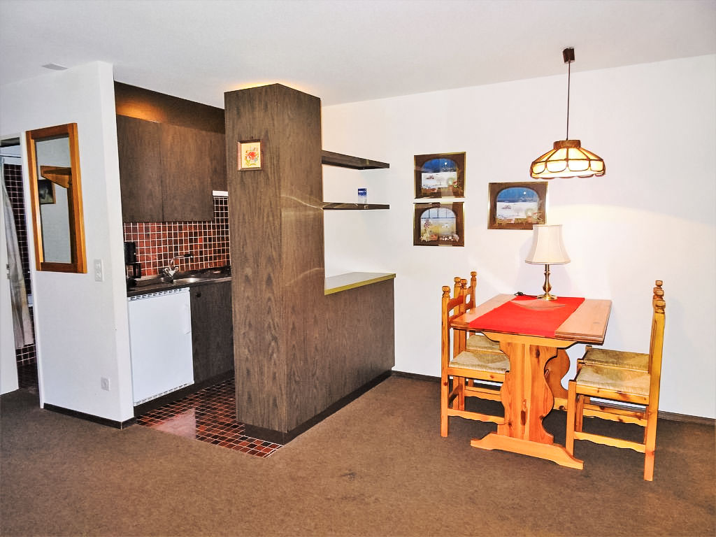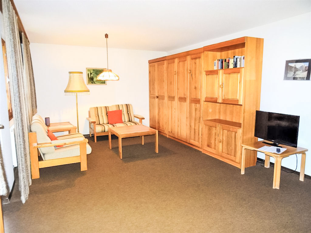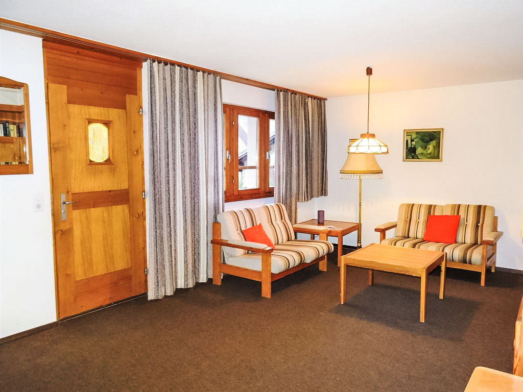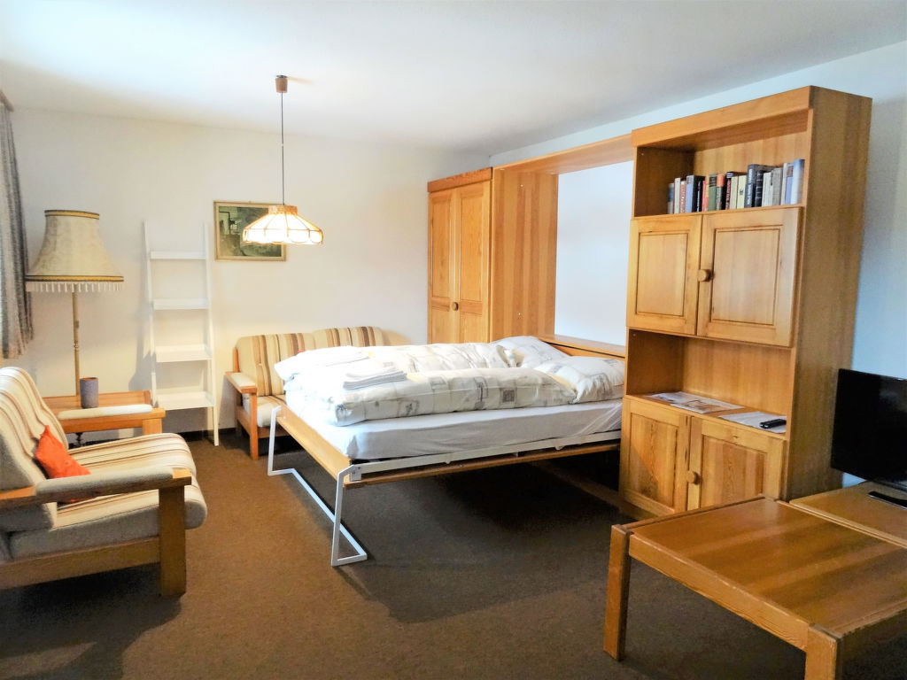 2-Zimmer-Wohnung 54 m2. Wohn-/Esszimmer mit 1 franz. Wandschrankbett, TV und Radio. 1 Doppelzimmer. Offene Küche (4 Kochplatten, Backofen). Bad/WC. Gartensitzplatz. Terrassenmöbel. Sicht auf die Berge. Zur Verfügung: Internet (Wireless LAN). Bitte beachten: Nichtraucher-Unterkunft. Maximal 1 Haustier/Hund erlaubt.