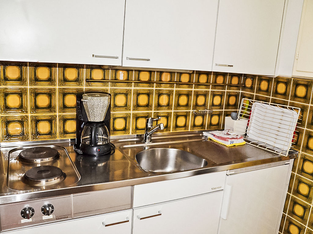 1-Zimmer-Wohnung 29 m2 im 1. Stock, Westlage. Hell, zweckmässig und gemütlich eingerichtet: Wohn-/Esszimmer mit 2 Wandschrankbetten (90 cm, Länge 200 cm), Esstisch, Kabel-TV, Flachbildschirm und Radio. Ausgang zum Balkon. Kochnische im Eingang (2 Kochplatten). Sitzbad/WC. Heizung. Holzböden. Balkon, überdacht. Balkonmöbel. Bitte beachten: Nichtraucher-Unterkunft. Eine Kaffeemaschine von Tassimo kann an der Reception zu einem Mietpreis von CHF 10.- (exclusiv Kapseln) gemietet werden.