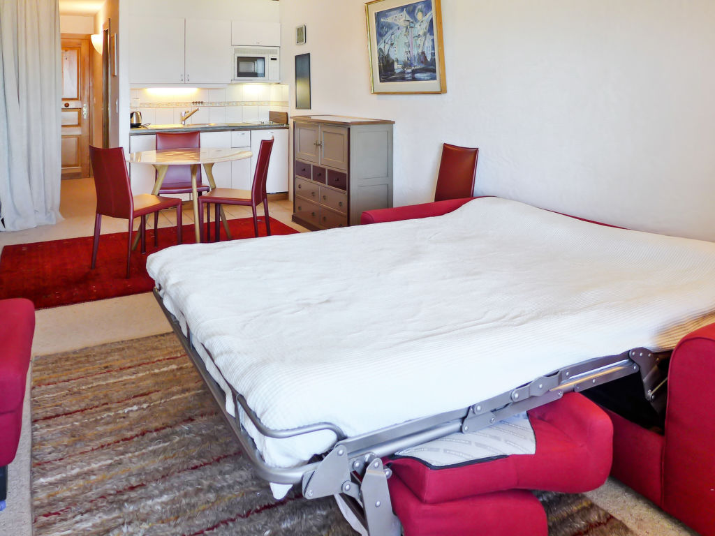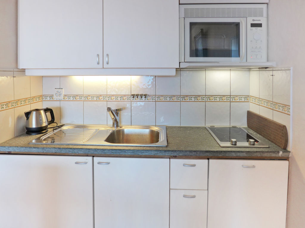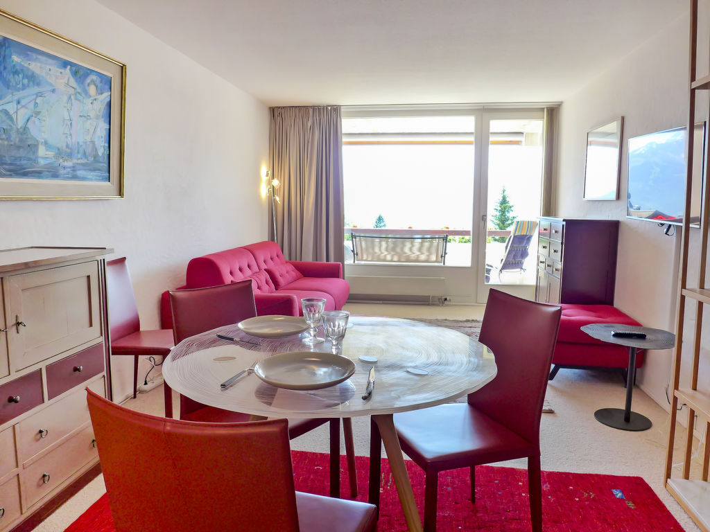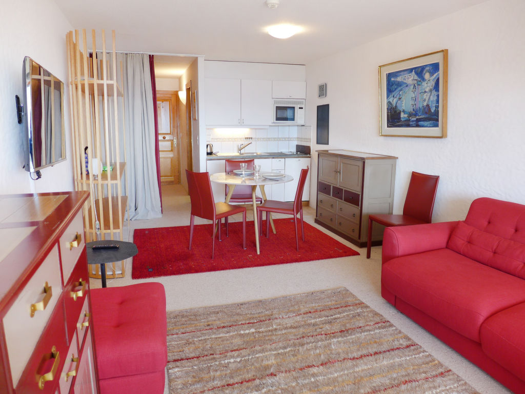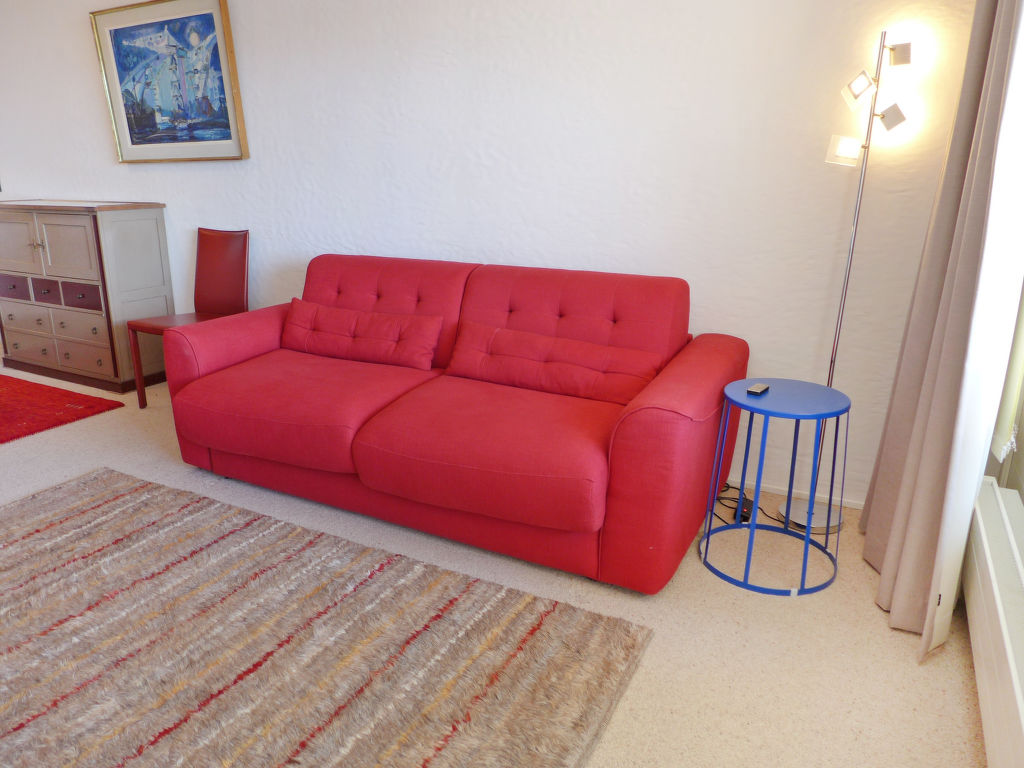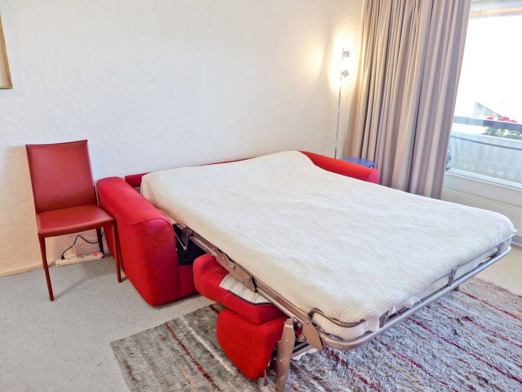 "Panorama", 1-Zimmer-Studio 37 m2 im 3. Stock, Südlage. Teilweise renoviert, schön und modern eingerichtet: Wohn-/Schlafzimmer mit 1 Diwanbett (140 cm), Esstisch, Bad/WC und TV (Flachbildschirm). Ausgang zum Balkon, Richtung Süden. Kochnische (Geschirrspüler, 2 Glaskeramikherd Platten, Mikrowelle, Tiefkühler). Kleiner Balkon, Südlage. Balkonmöbel, Liegestühle. Sehr schöne Sicht auf die Berge. Zur Verfügung: Waschmaschine, Haartrockner. Internet (Wireless LAN, gratis). Parkplatz (1 Auto). Bitte beachten: Nichtraucher-Unterkunft.