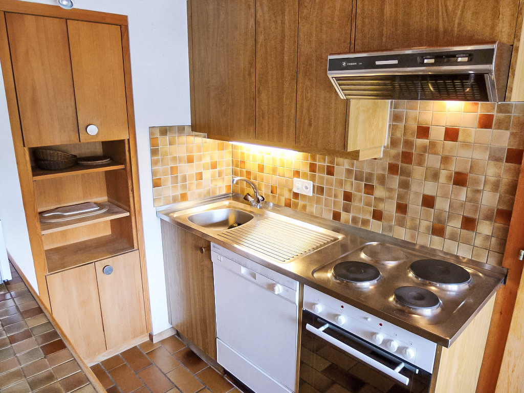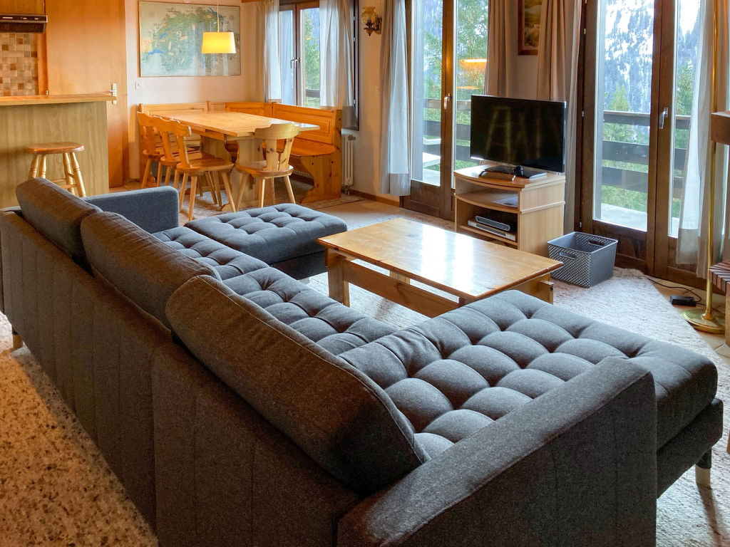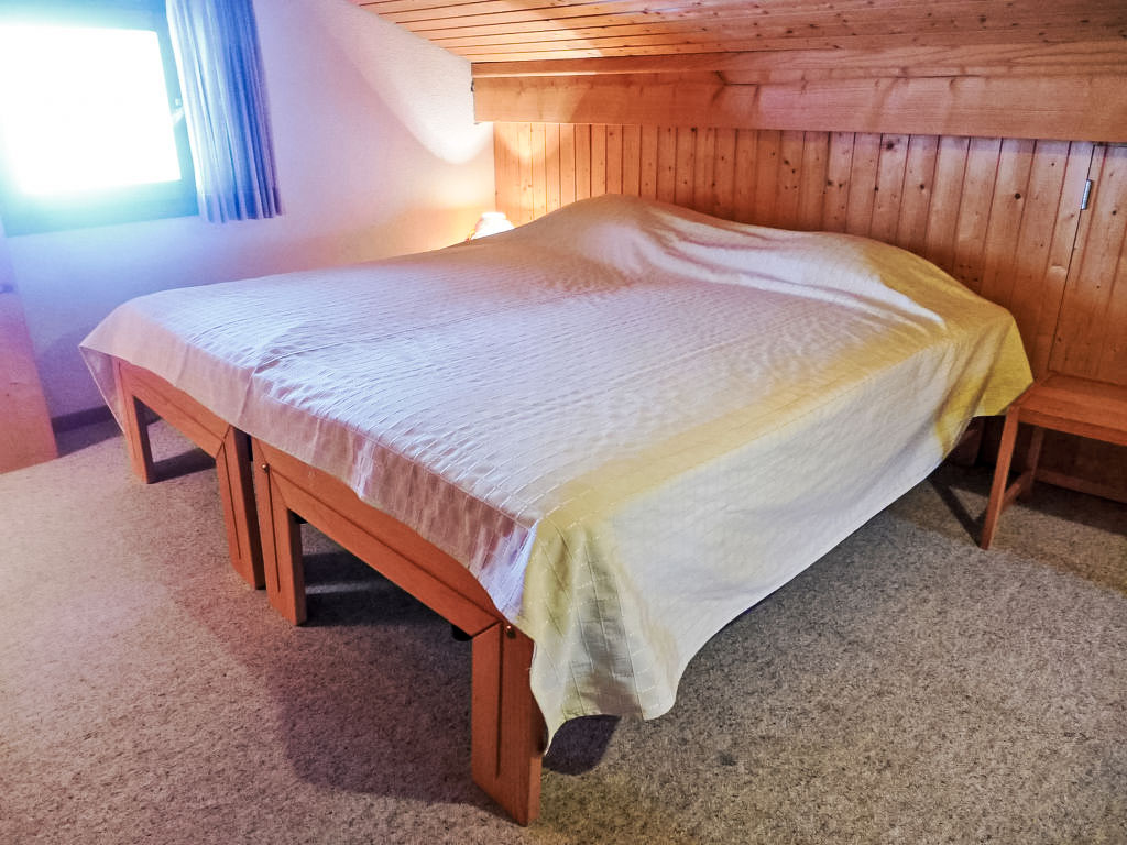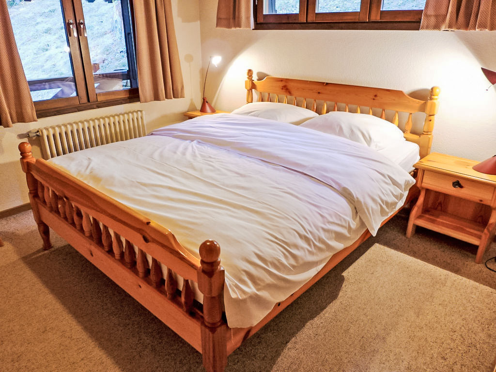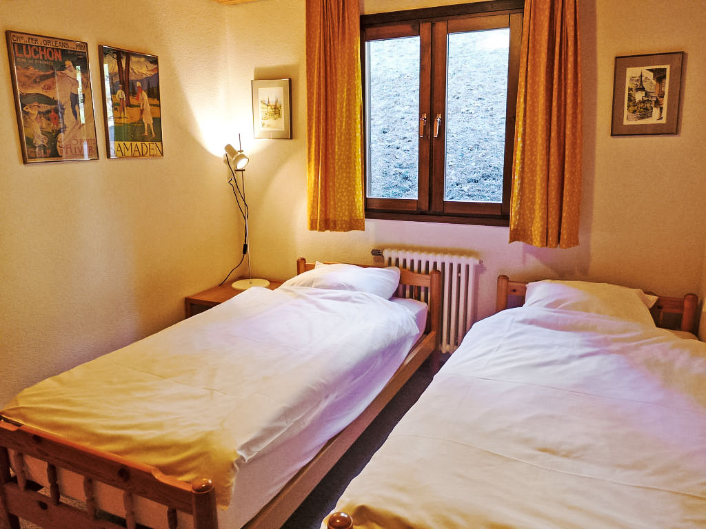4-Zimmer-Wohnung 120 m2 auf 2 Stockwerken im 1. Stock, Südlage. Wohn-/Esszimmer mit offenem Kamin und Sat-TV. 1 Zimmer mit 2 Betten. 1 Doppelzimmer mit 1 franz. Bett (140 cm). Wohnzimmer. Kochnische (3 Kochplatten, Backofen, Geschirrspüler, Fondue Set (Käse)). Bad/WC, Dusche/WC. Obergeschoss: (steile Treppe) Schlafnische mit 2 Betten. Balkon, Südlage. Zur Verfügung: Waschmaschine, Wäschetrockner. Internet (Wireless LAN, gratis). Parkplatz Nr. 66 (überdacht). Bitte beachten: TV nur EN.