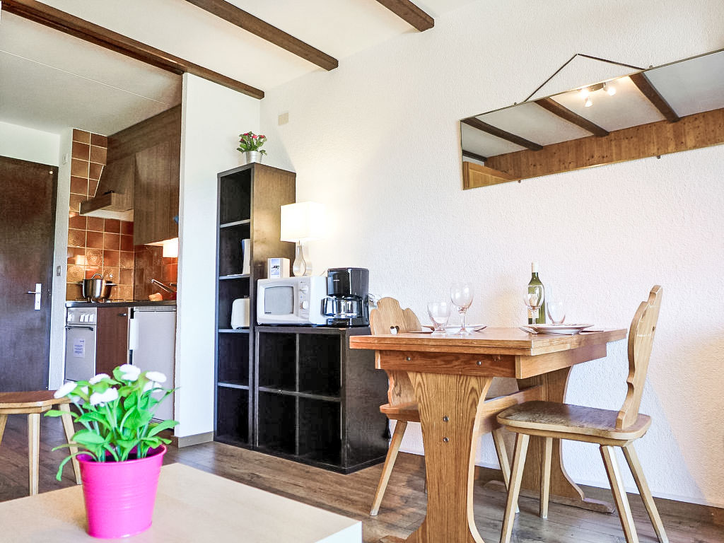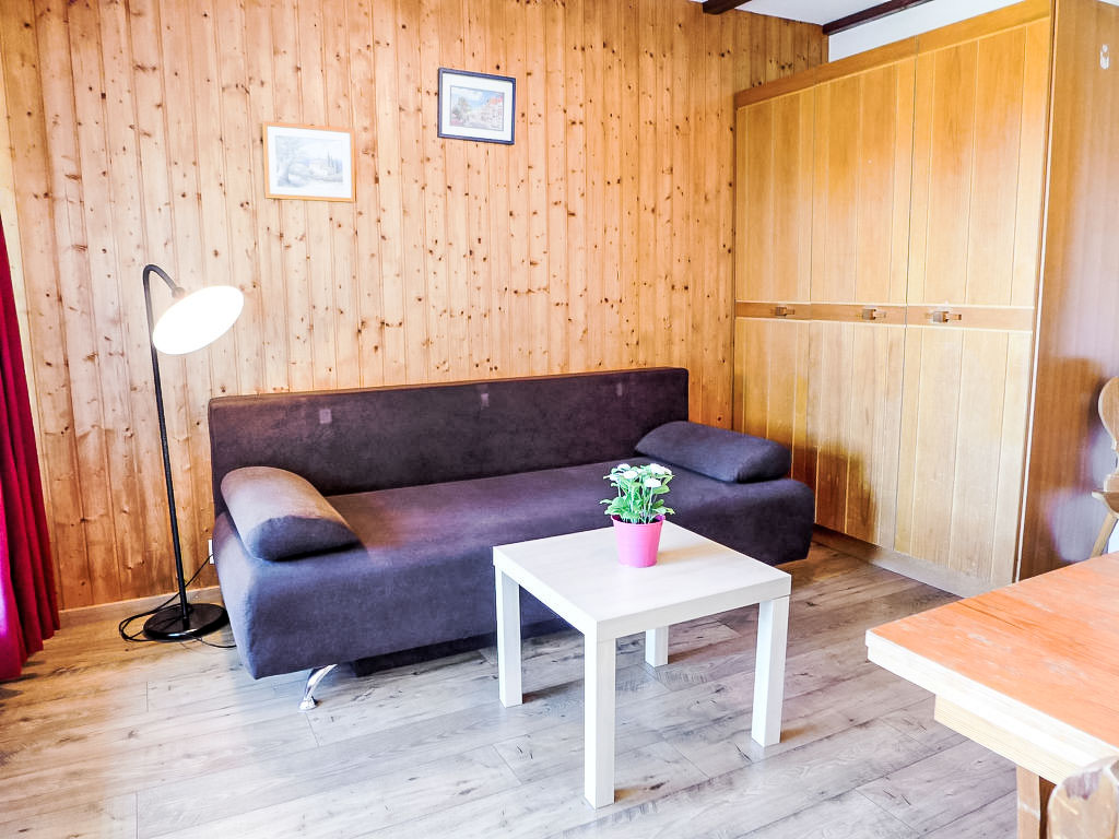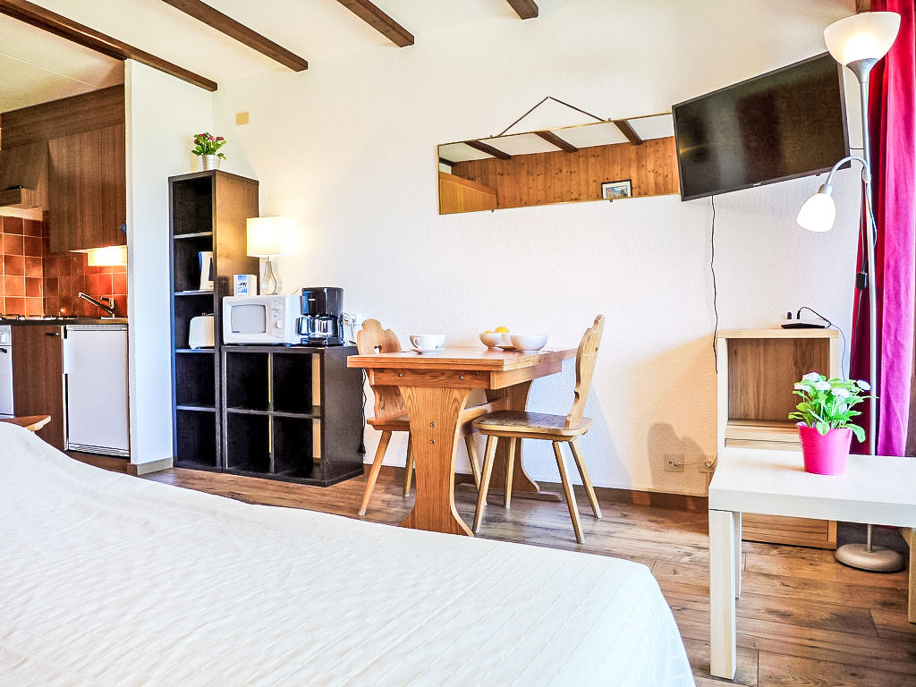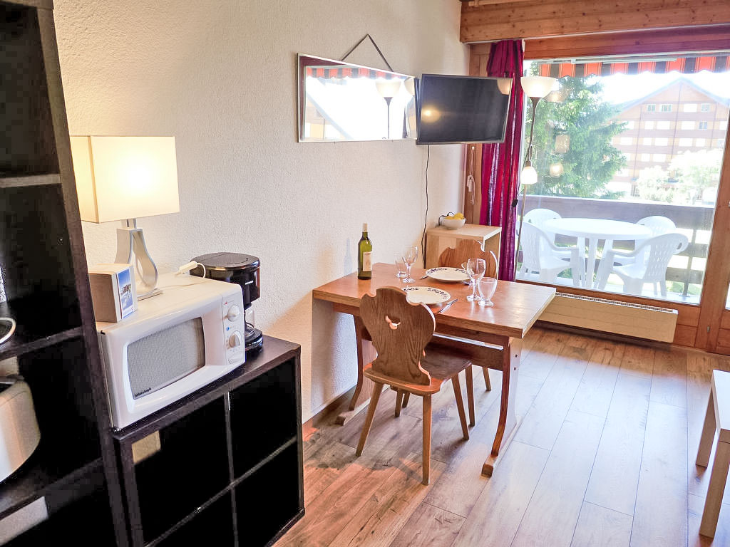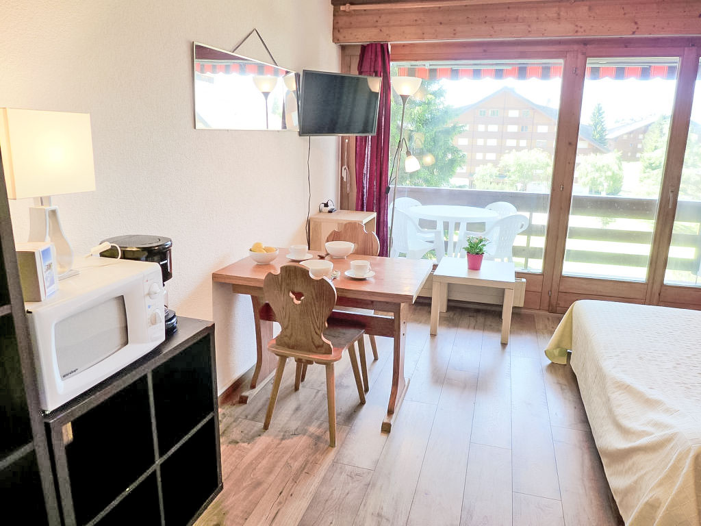 "Emeraude 26", 1-Zimmer-Wohnung 25 m2 im 2. Stock, Südlage. Einfach eingerichtet: Wohn-/Schlafzimmer mit Panoramafenster mit 1 Diwanbett (150 cm, Länge 200 cm), TV (Flachbildschirm). Ausgang zum Balkon. Kochnische im Eingang (3 Kochplatten, Backofen, Mikrowelle). Bad/WC. Balkon 6 m2, Südlage. Terrassenmöbel. Schöne Sicht auf die Landschaft. Bitte beachten: Kühlschrank ohne Gefrierfach. Maximal 1 Haustier/Hund erlaubt.