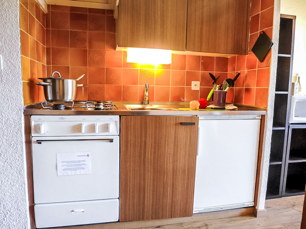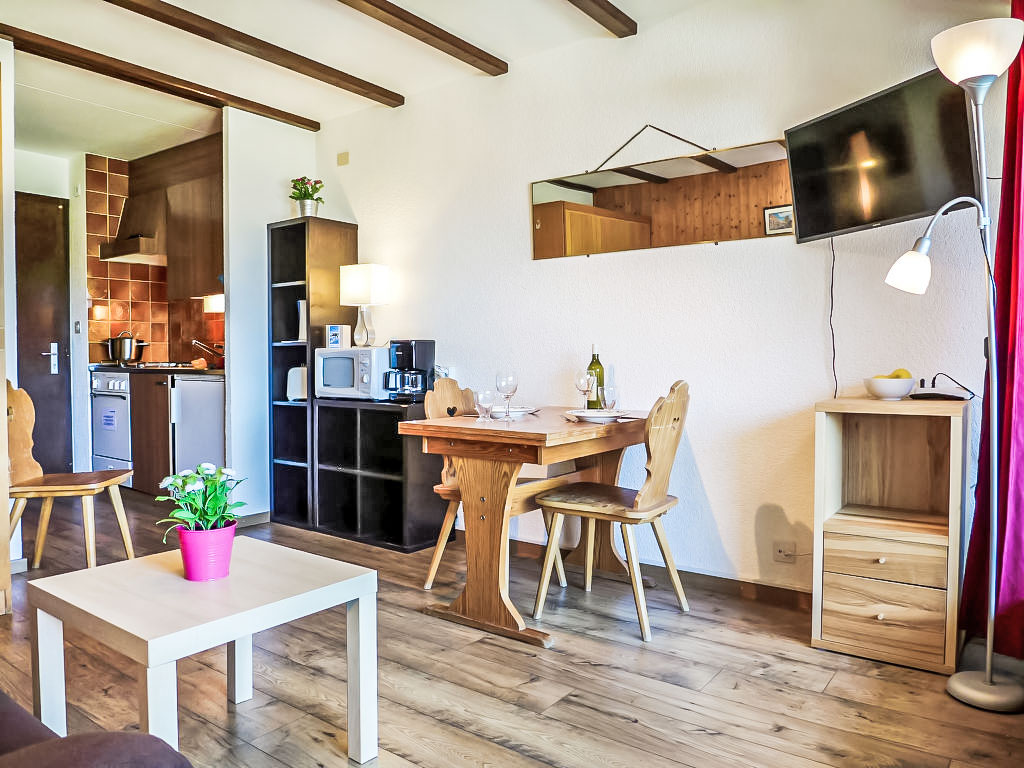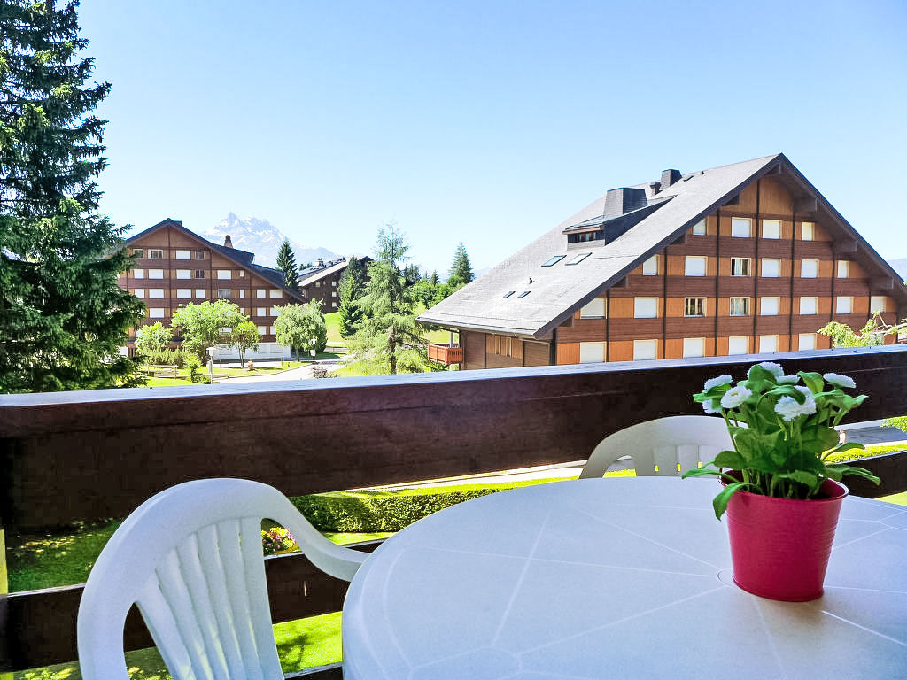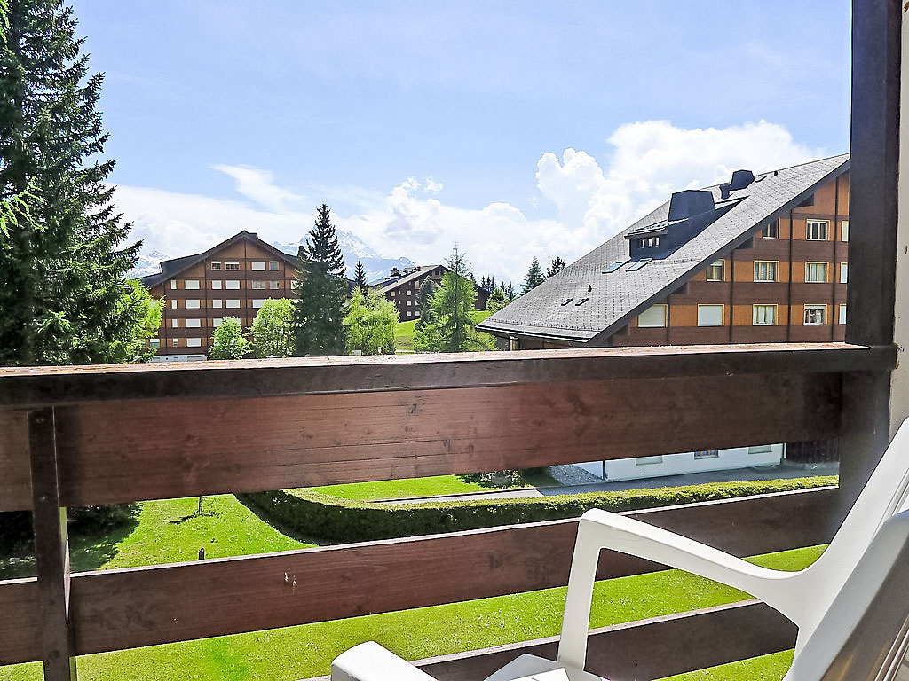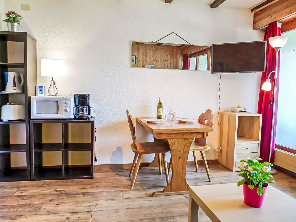 "Emeraude 26", 1-Zimmer-Wohnung 25 m2 im 2. Stock, Südlage. Einfach eingerichtet: Wohn-/Schlafzimmer mit Panoramafenster mit 1 Diwanbett (150 cm, Länge 200 cm), TV (Flachbildschirm). Ausgang zum Balkon. Kochnische im Eingang (3 Kochplatten, Backofen, Mikrowelle). Bad/WC. Balkon 6 m2, Südlage. Terrassenmöbel. Schöne Sicht auf die Landschaft. Bitte beachten: Kühlschrank ohne Gefrierfach. Maximal 1 Haustier/Hund erlaubt.
