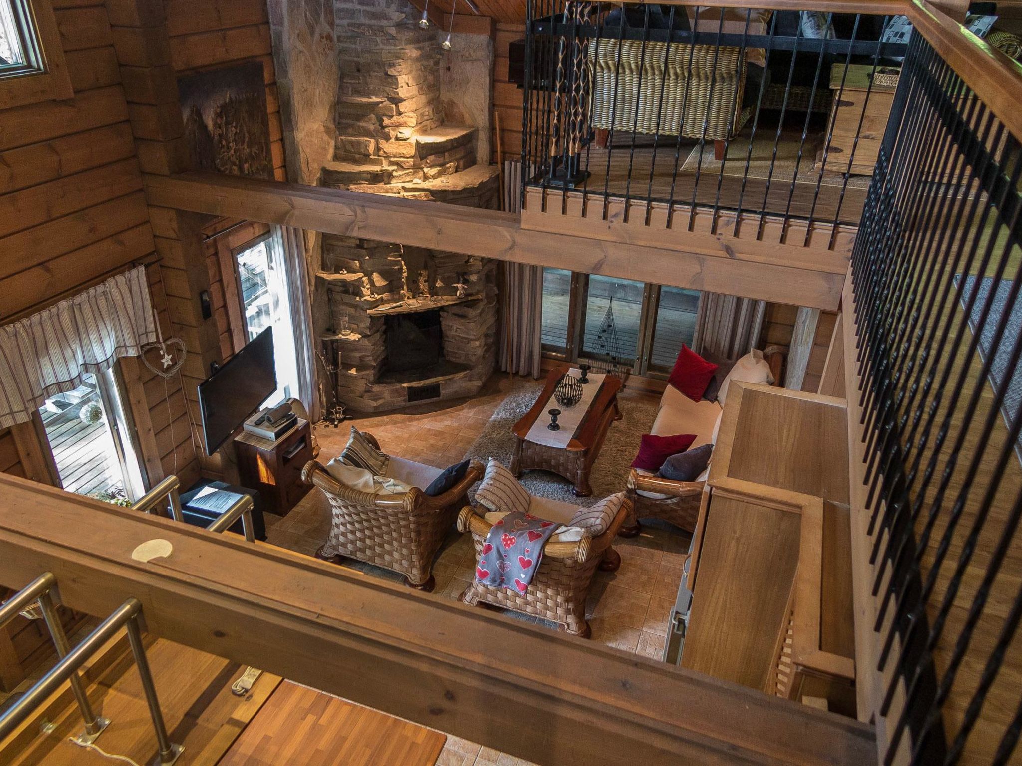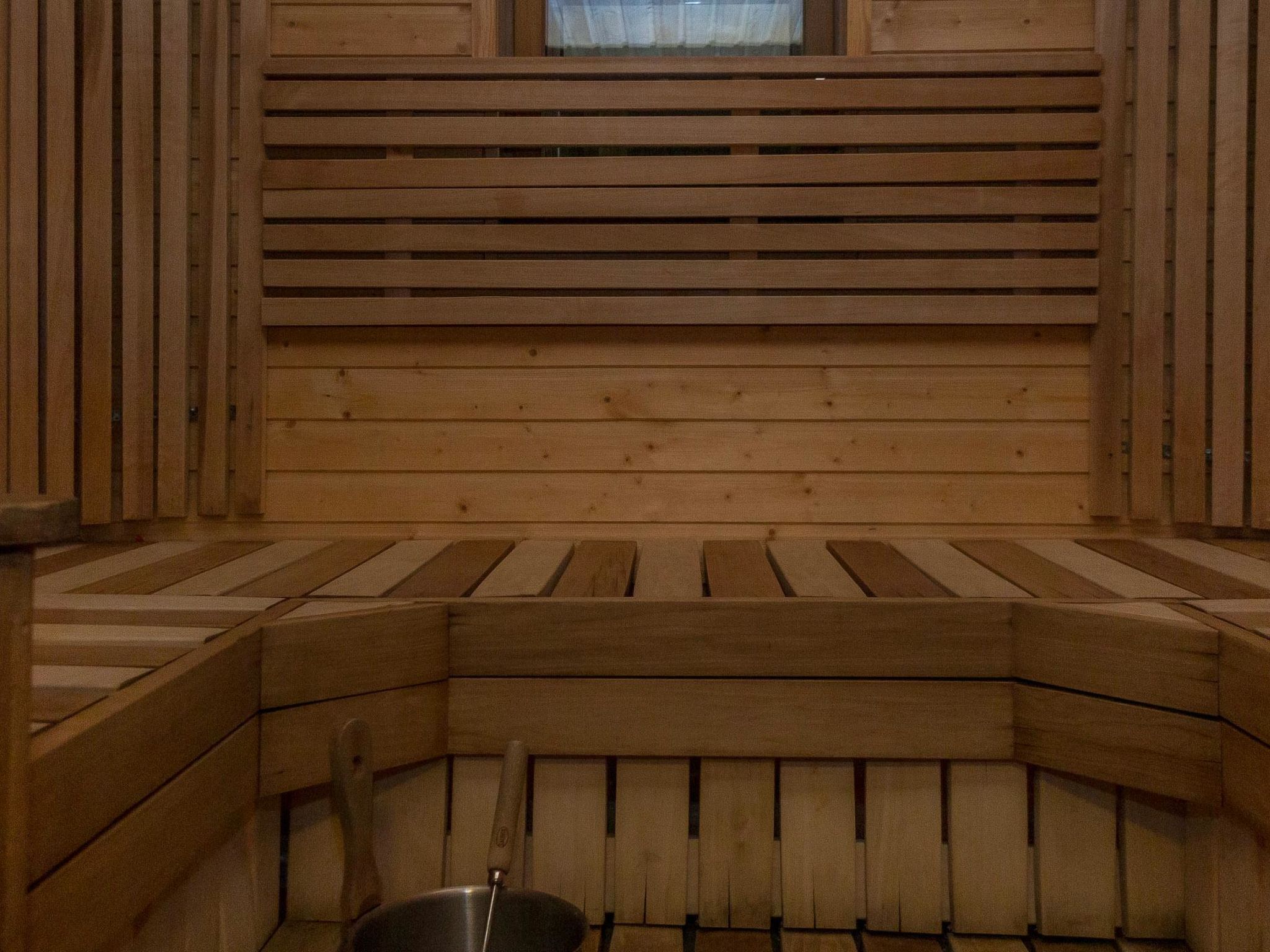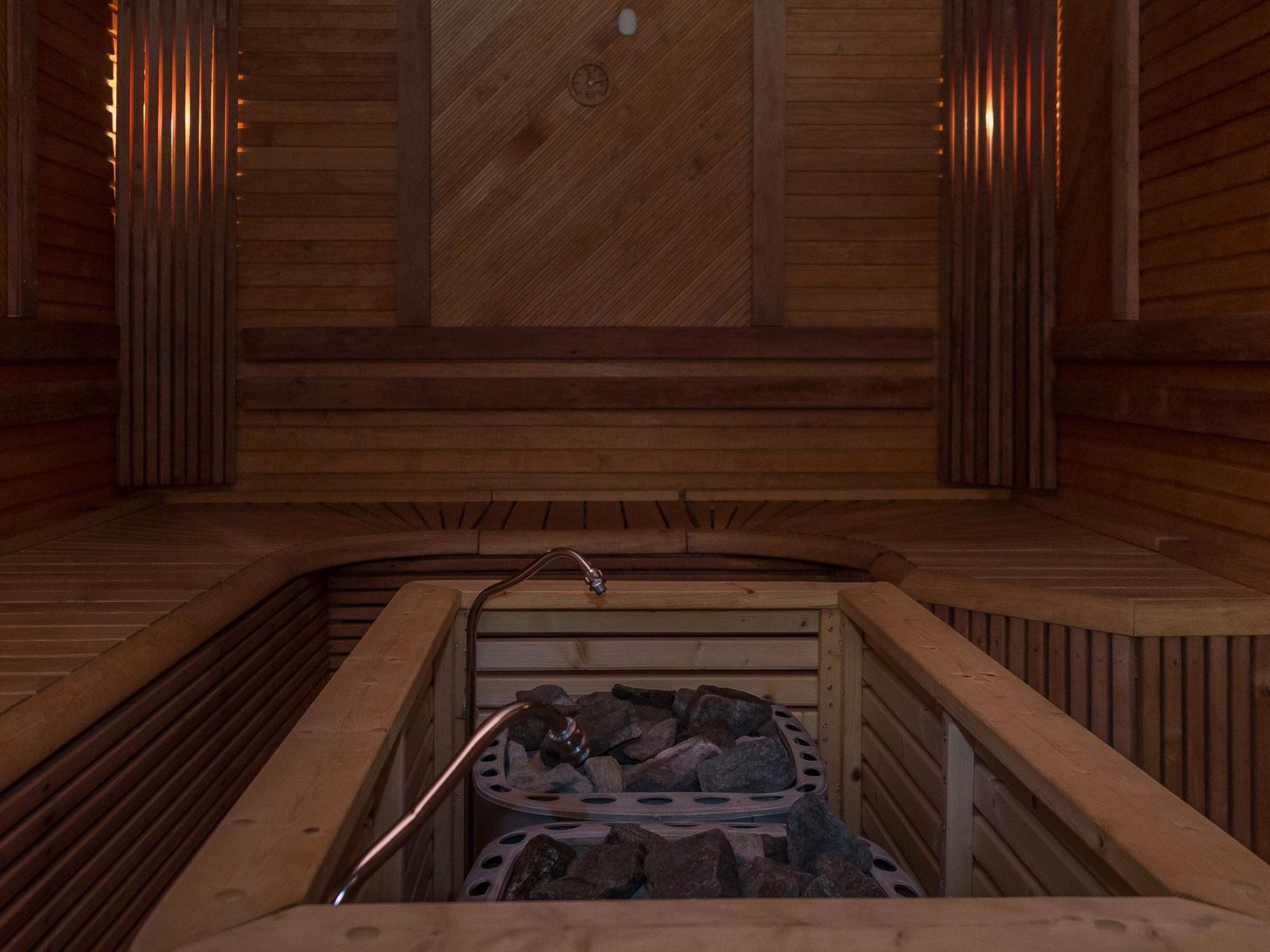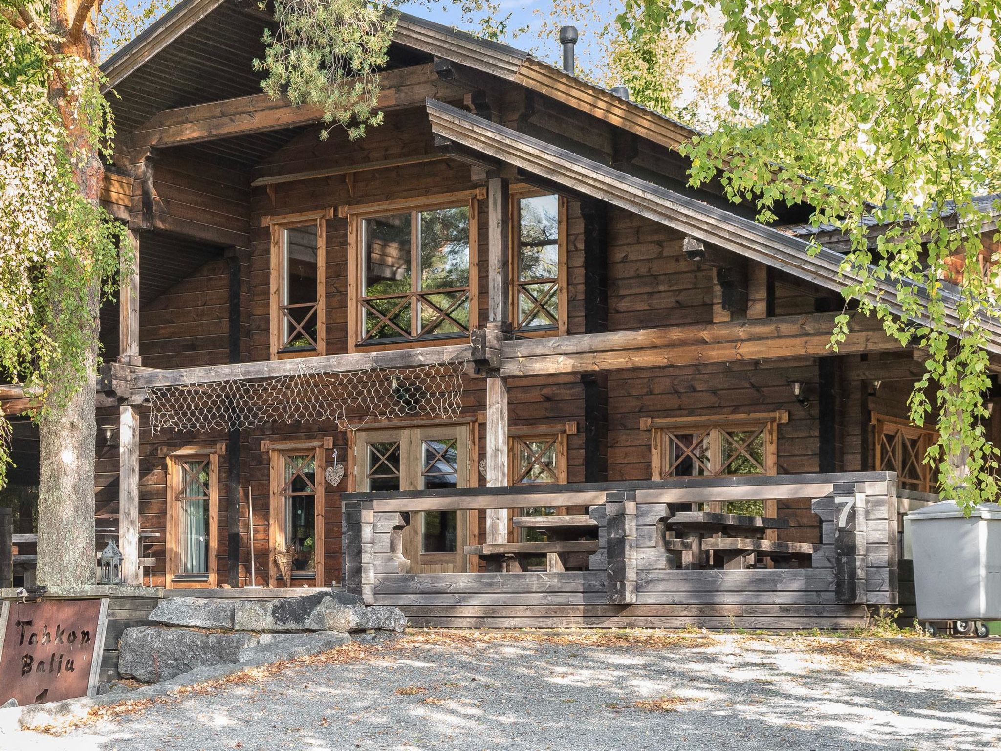 65 km nordöstlich von Kuopio, See Syvärijärvi 300 m, öffentliches Badeufer 1.2 km, kein Boot inbegriffen. Herrliches, isoliertes Chalet im Herzen des Skizentrums Tahkovuori. Tahkonbalju Hauptchalet (170 m²) wurde im Jahr 2005 und der Saunabereich (85 m²) im Jahr 2008 gebaut. Erdgeschoss: Wohnküche, 2 Schlafzimmer mit je 2 Betten (Doppelbetten mit Matratzenauflage), Waschraum, WC, Sauna (Elektroherd). Obergeschoss: 3 Einzelzimmer, Nische mit 2 Betten, Flur mit 2 Betten, WC. Steile Wendeltreppe nach oben. Zwei separate Schlafzimmer mit je 2 Betten, diese Schlafzimmer befinden sich in einem separaten Teil des Chalets und sind über die Veranda zugänglich. Luftwärmepumpe. Separater Saunabereich mit Kaminzimmer (Gasherd), Waschraum (4 Duschen) und grosse Sauna (E-Herd). Ausserhalb des Saunabereichs befindet sich grosser Whirlpool, der im Mietpreis enthalten ist. Es gibt eine Veranda rund um das gesamte Chalet und alle separaten Gebäude befinden sich unter dem gleichen Dach. Vor der Villa befindet sich auch Glaspavillon mit Infrarot-Heizung. Hochwertige Tankonbalju-Ferienvilla, mit einem wunderschönen, waldreichen und flachen Grundstück, im Skigebiet Tahkovuori, in der Nähe eines Golfplatzes. Die Villa verfügt über zwei Saunen, sechs Duschen, "Hot Pot" (heisser Topf), drei Toiletten, zwei Kamine und einen Skiraum. 3 Fernseher, ADSL-Internetverbindung (Geschwindigkeit 1 MB) und Musikanlage in der Hauptvilla, sowie in der Saunaabteilung. Miete der Villa beinhaltet Brennholz, Toilettenpapier, Waschmittel, Gewürze, Sitzbezüge, Folien, Kunststofffolien, Backen, Bratfett und Gasgrill. Nachbarn auf beiden Seiten, die Lage ist trotzdem noch ruhig. Alle Annehmlichkeiten sind zu Fuss erreichbar, Spa 1.1 km, Skipisten, Geschäfte und Restaurants 1.1 km. Golfplatz und Club 600 m. Die Buchungen beginnen am selben Tag um 16:00 Uhr und enden um 16:00 Uhr. Buchungen können nicht am selben Tag beginnen und enden.