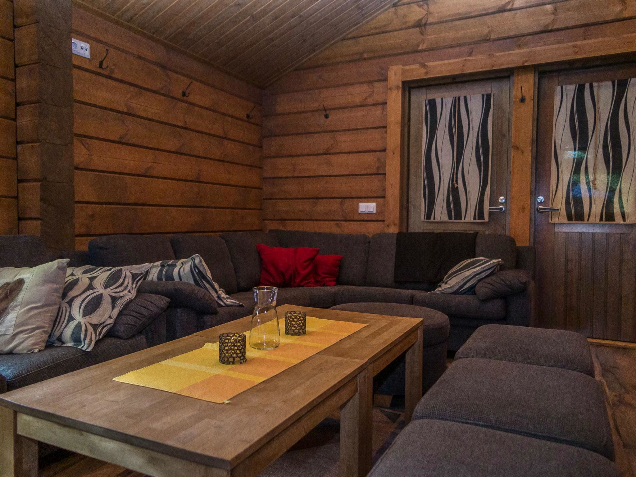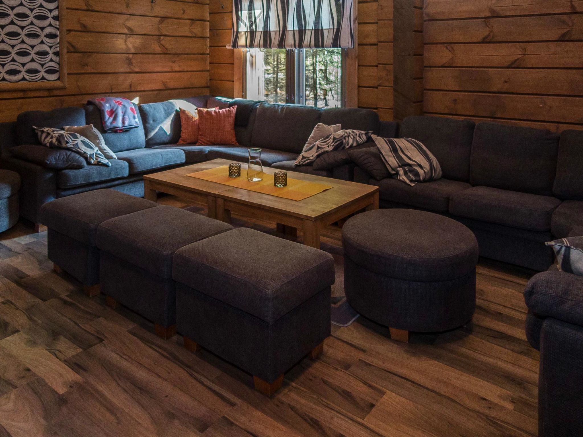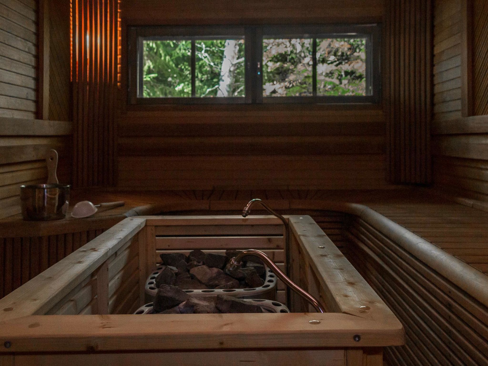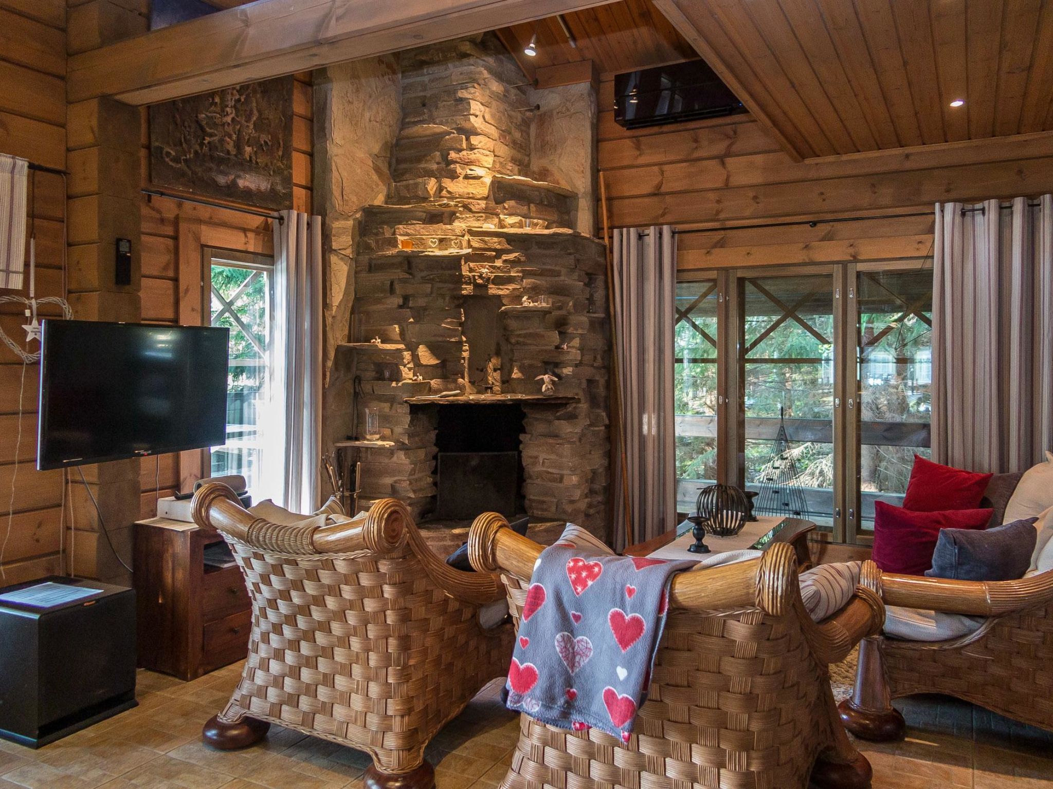 65 km nordöstlich von Kuopio, See Syvärijärvi 300 m, öffentliches Badeufer 1.2 km, kein Boot inbegriffen. Herrliches, isoliertes Chalet im Herzen des Skizentrums Tahkovuori. Tahkonbalju Hauptchalet (170 m²) wurde im Jahr 2005 und der Saunabereich (85 m²) im Jahr 2008 gebaut. Erdgeschoss: Wohnküche, 2 Schlafzimmer mit je 2 Betten (Doppelbetten mit Matratzenauflage), Waschraum, WC, Sauna (Elektroherd). Obergeschoss: 3 Einzelzimmer, Nische mit 2 Betten, Flur mit 2 Betten, WC. Steile Wendeltreppe nach oben. Zwei separate Schlafzimmer mit je 2 Betten, diese Schlafzimmer befinden sich in einem separaten Teil des Chalets und sind über die Veranda zugänglich. Luftwärmepumpe. Separater Saunabereich mit Kaminzimmer (Gasherd), Waschraum (4 Duschen) und grosse Sauna (E-Herd). Ausserhalb des Saunabereichs befindet sich grosser Whirlpool, der im Mietpreis enthalten ist. Es gibt eine Veranda rund um das gesamte Chalet und alle separaten Gebäude befinden sich unter dem gleichen Dach. Vor der Villa befindet sich auch Glaspavillon mit Infrarot-Heizung. Hochwertige Tankonbalju-Ferienvilla, mit einem wunderschönen, waldreichen und flachen Grundstück, im Skigebiet Tahkovuori, in der Nähe eines Golfplatzes. Die Villa verfügt über zwei Saunen, sechs Duschen, "Hot Pot" (heisser Topf), drei Toiletten, zwei Kamine und einen Skiraum. 3 Fernseher, ADSL-Internetverbindung (Geschwindigkeit 1 MB) und Musikanlage in der Hauptvilla, sowie in der Saunaabteilung. Miete der Villa beinhaltet Brennholz, Toilettenpapier, Waschmittel, Gewürze, Sitzbezüge, Folien, Kunststofffolien, Backen, Bratfett und Gasgrill. Nachbarn auf beiden Seiten, die Lage ist trotzdem noch ruhig. Alle Annehmlichkeiten sind zu Fuss erreichbar, Spa 1.1 km, Skipisten, Geschäfte und Restaurants 1.1 km. Golfplatz und Club 600 m. Die Buchungen beginnen am selben Tag um 16:00 Uhr und enden um 16:00 Uhr. Buchungen können nicht am selben Tag beginnen und enden.