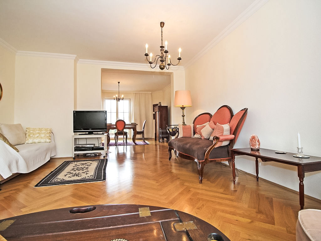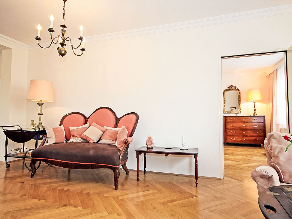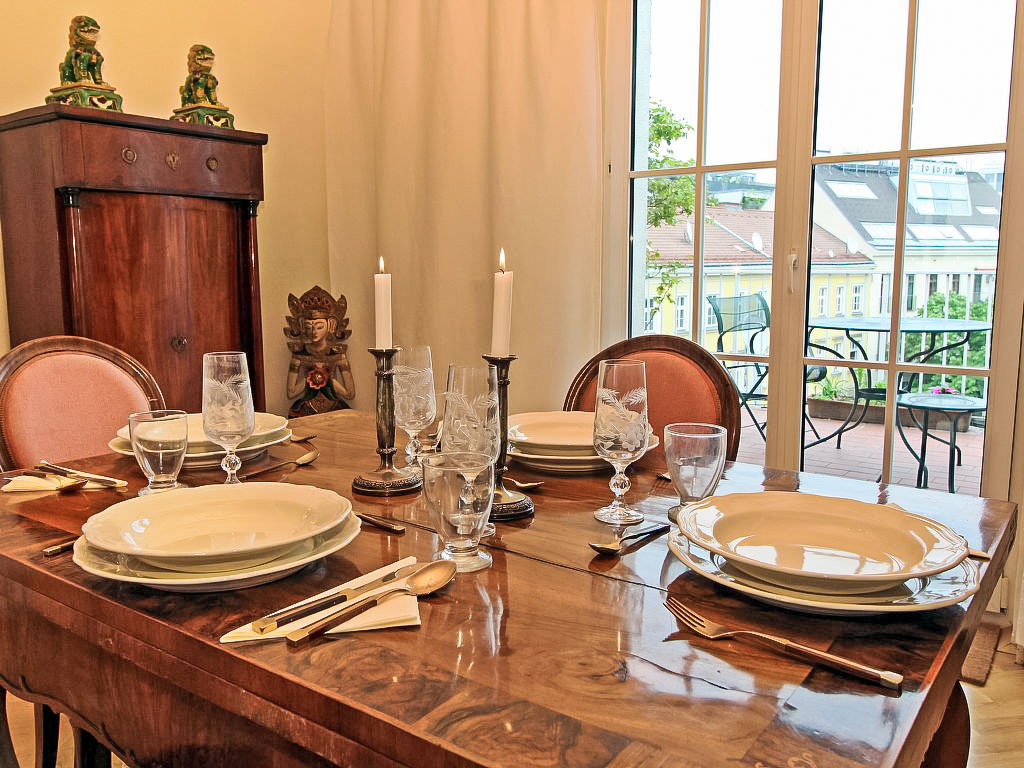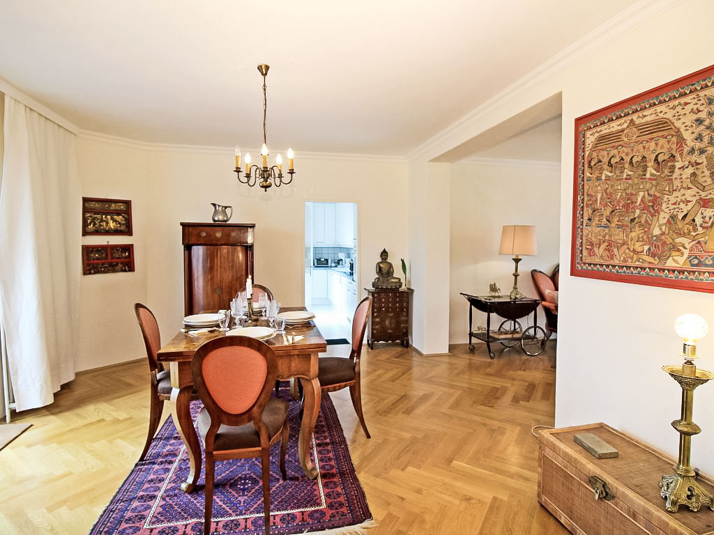 "Classic Vienna", 4-Zimmer-Wohnung 116 m2, im Dachgeschoss. Geräumig und hell, antik und stilvoll eingerichtet: Eingang. Offenes grosses Wohnzimmer mit 1 Doppeldiwanbett (150 cm, Länge 190 cm), Kabel-TV, Flachbildschirm und Stereoanlage. Offenes Esszimmer mit Esstisch. Ausgang zur Terrasse. 1 Doppelzimmer mit 1 franz. Bett (150 cm, Länge 200 cm), Bad. 1 Doppelzimmer mit 1 franz. Bett (140 cm, Länge 200 cm). Küche (Backofen, Geschirrspüler, 4 Glaskeramikherd Platten, Tiefkühler, elektrische Kaffeemaschine). Ausgang zur Terrasse. Sep. WC. Parkettböden. Terrasse 20 m2. Terrassenmöbel. Schöne Sicht. Zur Verfügung: Bügeleisen, Kinderhochstuhl. Internet (Wireless LAN, gratis). Bitte beachten: Nichtraucher-Unterkunft.