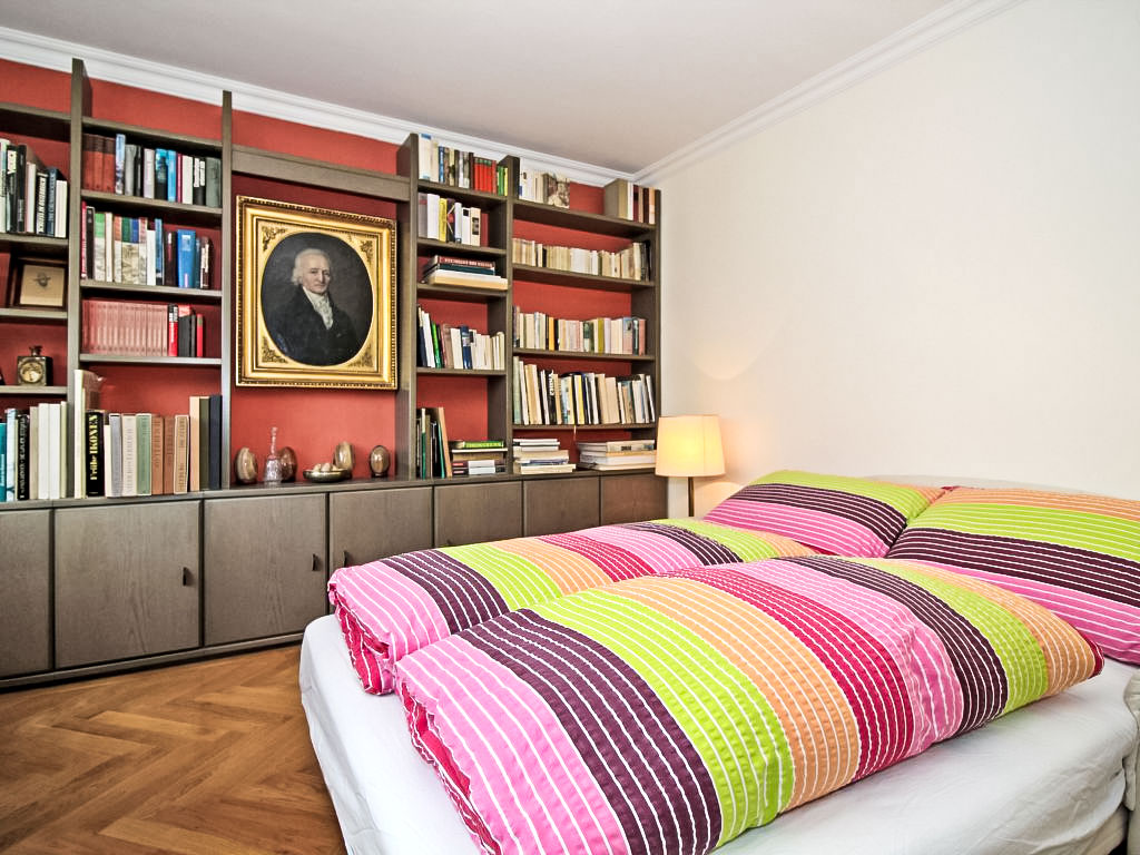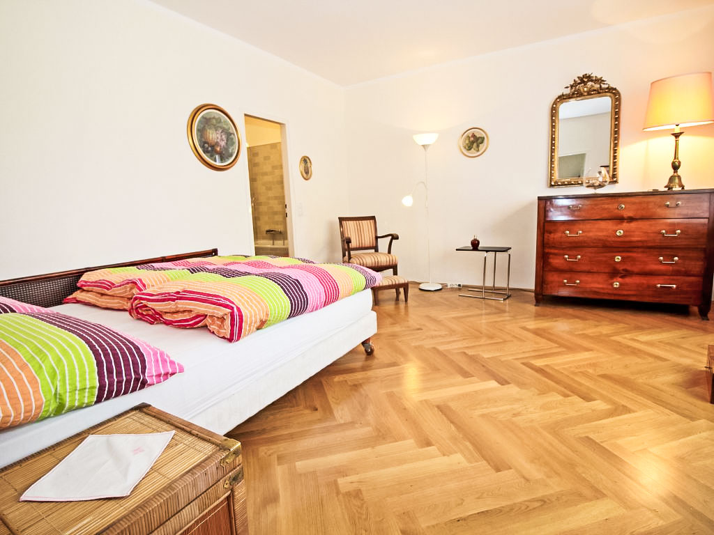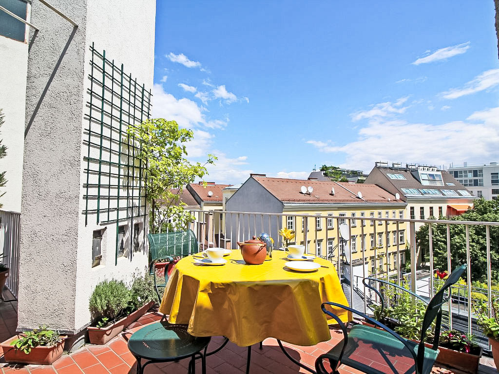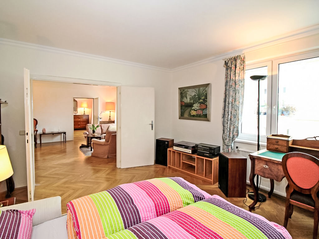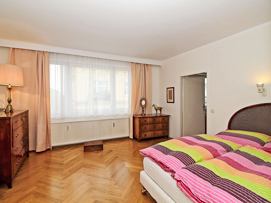 "Classic Vienna", 4-Zimmer-Wohnung 116 m2, im Dachgeschoss. Geräumig und hell, antik und stilvoll eingerichtet: Eingang. Offenes grosses Wohnzimmer mit 1 Doppeldiwanbett (150 cm, Länge 190 cm), Kabel-TV, Flachbildschirm und Stereoanlage. Offenes Esszimmer mit Esstisch. Ausgang zur Terrasse. 1 Doppelzimmer mit 1 franz. Bett (150 cm, Länge 200 cm), Bad. 1 Doppelzimmer mit 1 franz. Bett (140 cm, Länge 200 cm). Küche (Backofen, Geschirrspüler, 4 Glaskeramikherd Platten, Tiefkühler, elektrische Kaffeemaschine). Ausgang zur Terrasse. Sep. WC. Parkettböden. Terrasse 20 m2. Terrassenmöbel. Schöne Sicht. Zur Verfügung: Bügeleisen, Kinderhochstuhl. Internet (Wireless LAN, gratis). Bitte beachten: Nichtraucher-Unterkunft.