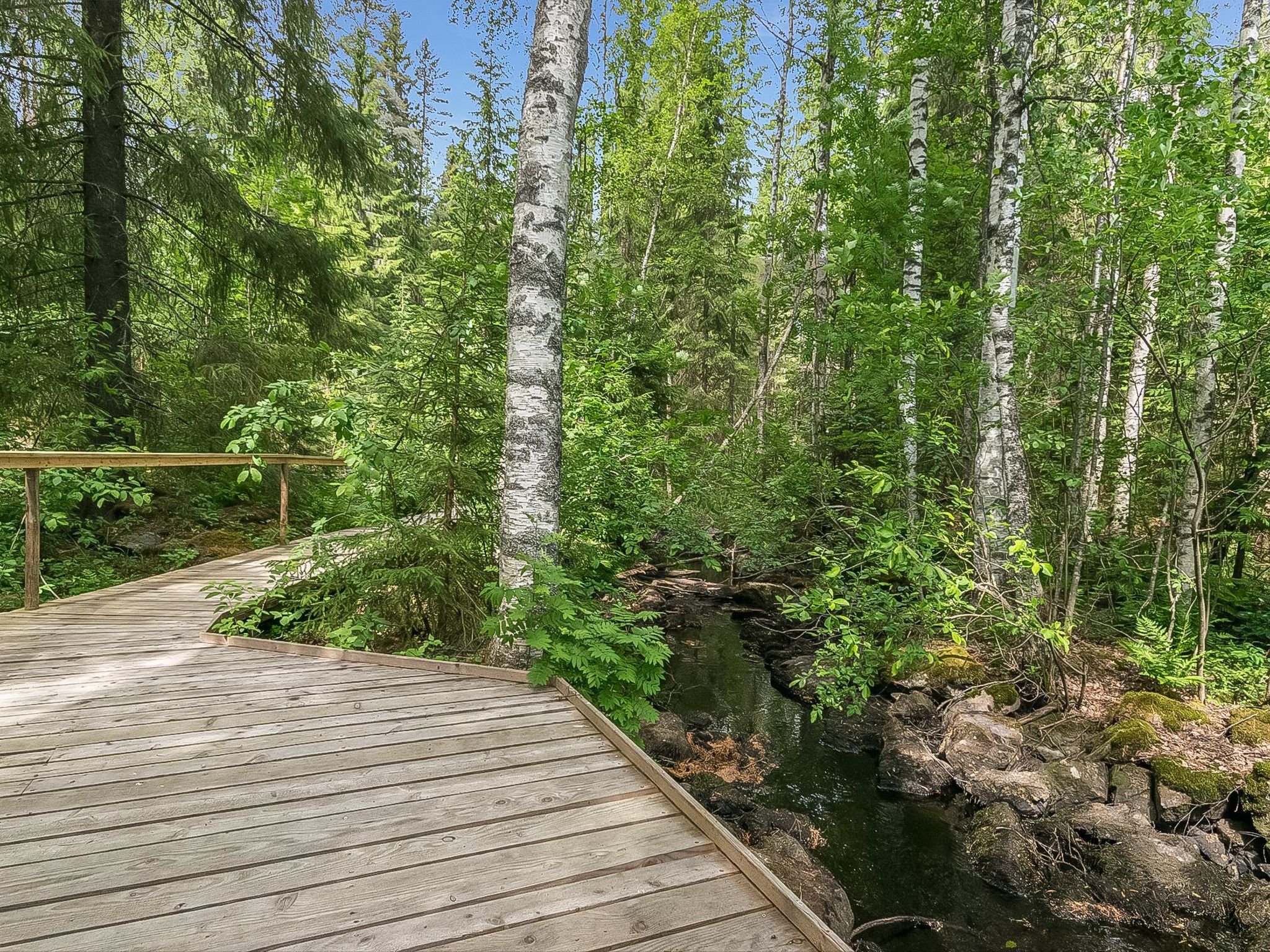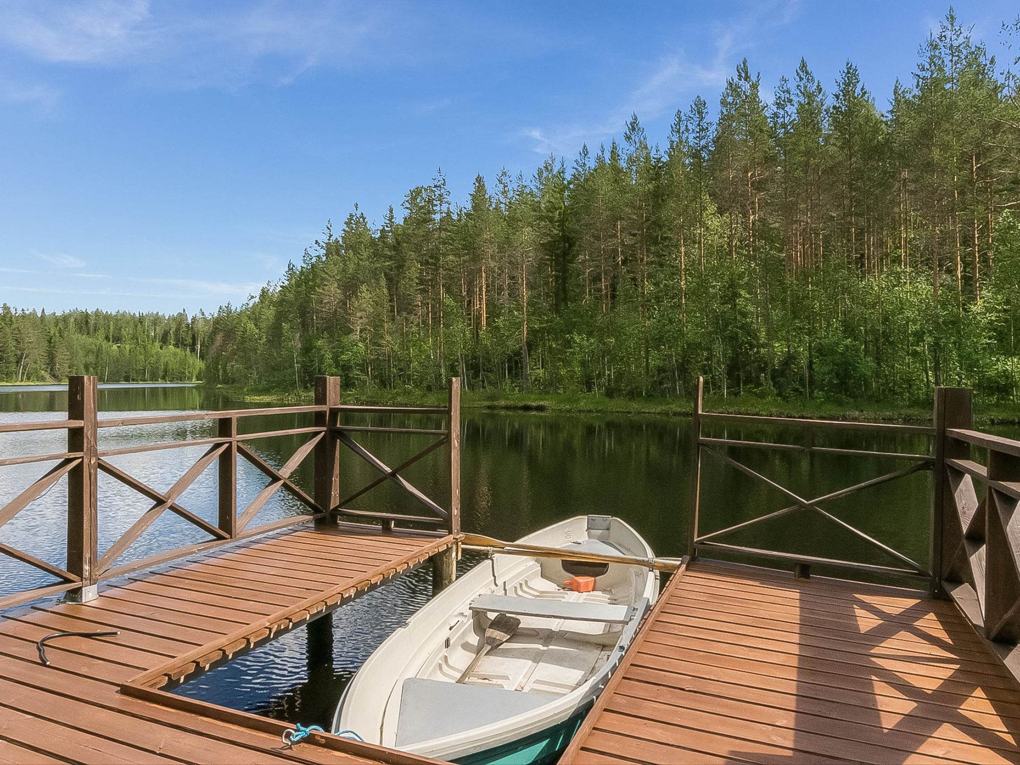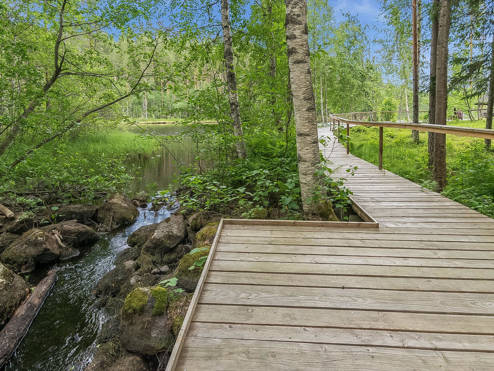 27 km östlich von Pieksämäki, Teich Vääränlampi 15 m (Länge 1 km, Breite 0.07 km), harter und gleichmässig vertiefter Sandboden, Anlegestelle, Ruderboot. Holzvilla, Baujahr 2007, Wohnküche (53 m²) mit Esstisch für 14 Personen, drei Schlafzimmer (12-14 m²) mit je zwei Betten und Schränken, Hauswirtschaftsraum, Ankleideraum, Waschraum (2 Duschen), Sauna (elektrisch), separates WC mit Dusche und WC, Flur, überdachte Terrasse. Vier Schlafzimmer mit jeweils zwei Betten und Schränken, WC und Lobby im Obergeschoss. Die Fussgängerbrücke zum Wald (Länge ca. 100 m) führt vom Hof. Die Strecke führt am Flussufer entlang und endet in der Elfenhütte. Es gibt auch Auto-Unterstand, Grillhütte und grosse Anlegestelle im Hof. Das gesamte Erdgeschoss und der Hofbereich sind so gebaut, dass sie gut zugänglich sind. Menschen mit eingeschränkter Mobilität können sich hier mit Rollstühlen bewegen. Duschen und Toiletten sind für Behinderte ausgestattet, die Sauna verfügt über motorisierte Saunabänke. Myllytupa ist eine geräumige Mietvilla für einen exklusiven und gut zugänglichen Urlaub. Myllytupa ist ein ideales Ziel für den Urlaub von Privatpersonen, sowie für Unternehmen und Gemeinschaften, die sowohl Urlaub als auch Geschäftsreisen unternehmen wollen. Es gibt auch gute Möglichkeiten, kleine Kurse und Partys zu organisieren. Die Rampen und die gebauten Wege zum Strand und zum Flussufer ermöglichen die Bewegung in der Natur mit Rollstühlen und anderen Hilfsmitteln. Der Strand mit flachem und künstlichem Sandboden vertieft sich ziemlich langsam. Angelmöglichkeit von der Anlegestelle aus, sogar mit Rollstuhl. Jäppilä 8 km, Varkaus 22 km, Leppävirta 23 km, Pieksämäki 27 km, Suonenjoki 45 km, Kuopio 74 km, Mikkeli 99 km, Jyväskylä 114 km. Imatra 188 km. Helsinki 324 km.