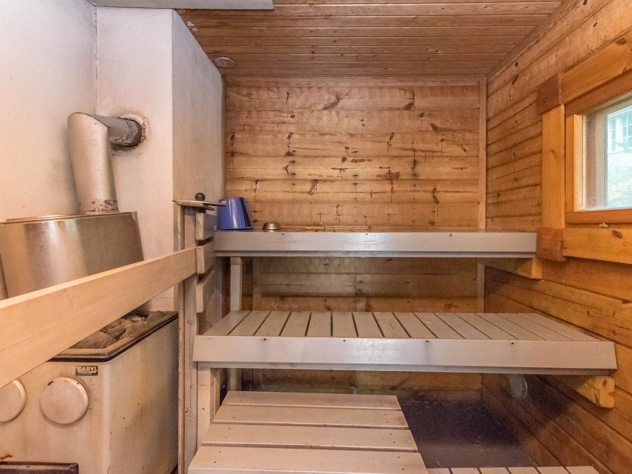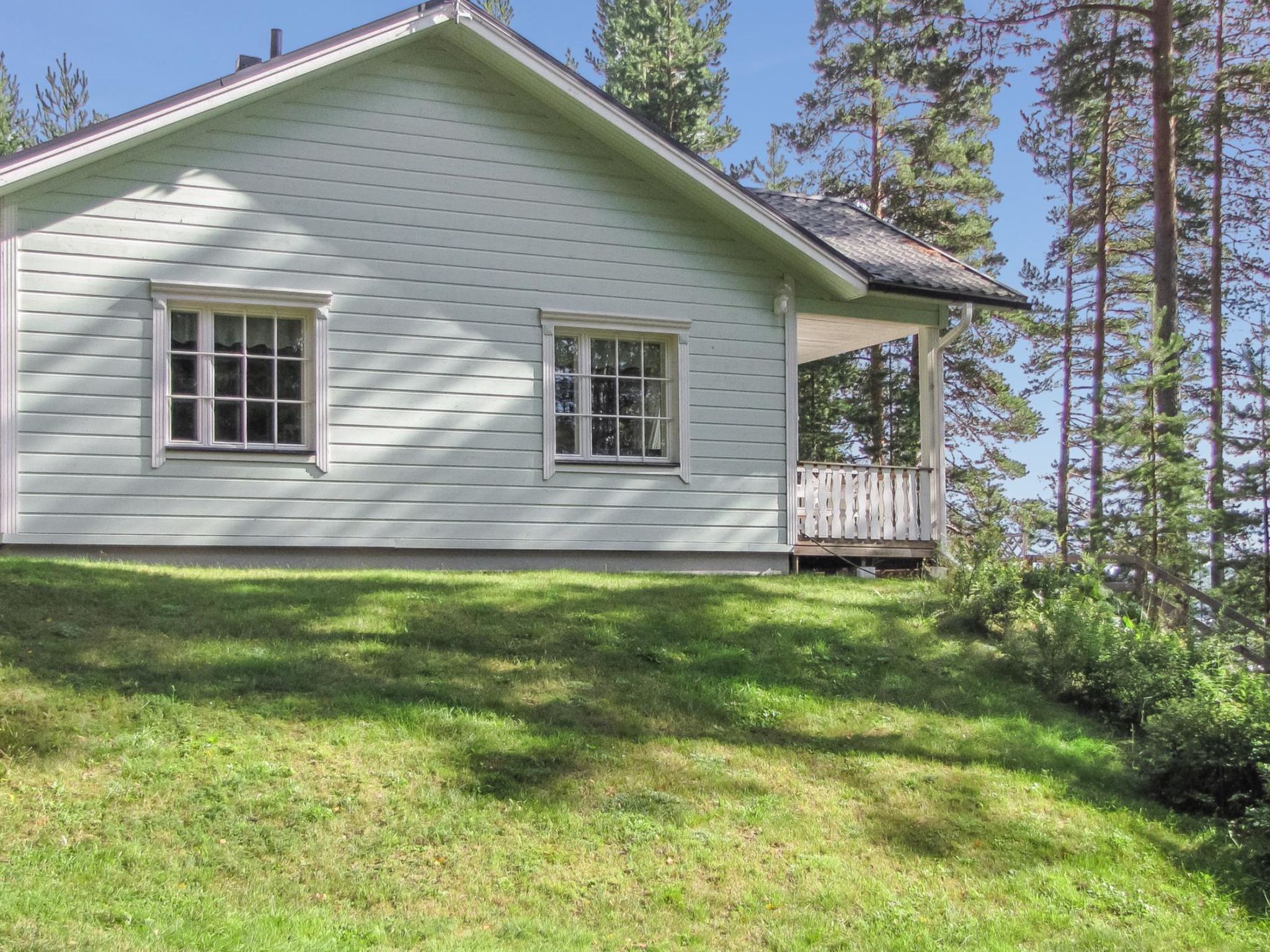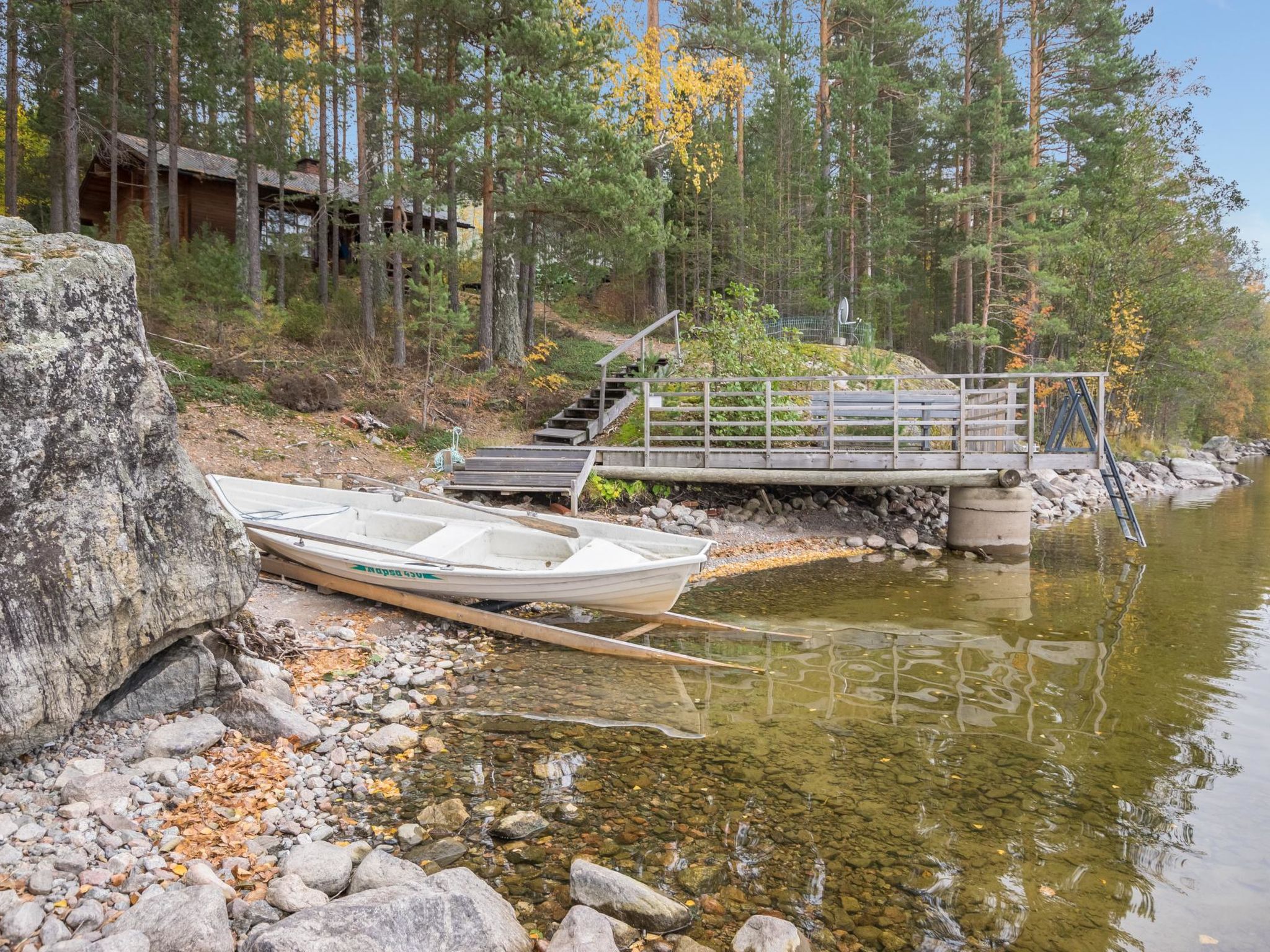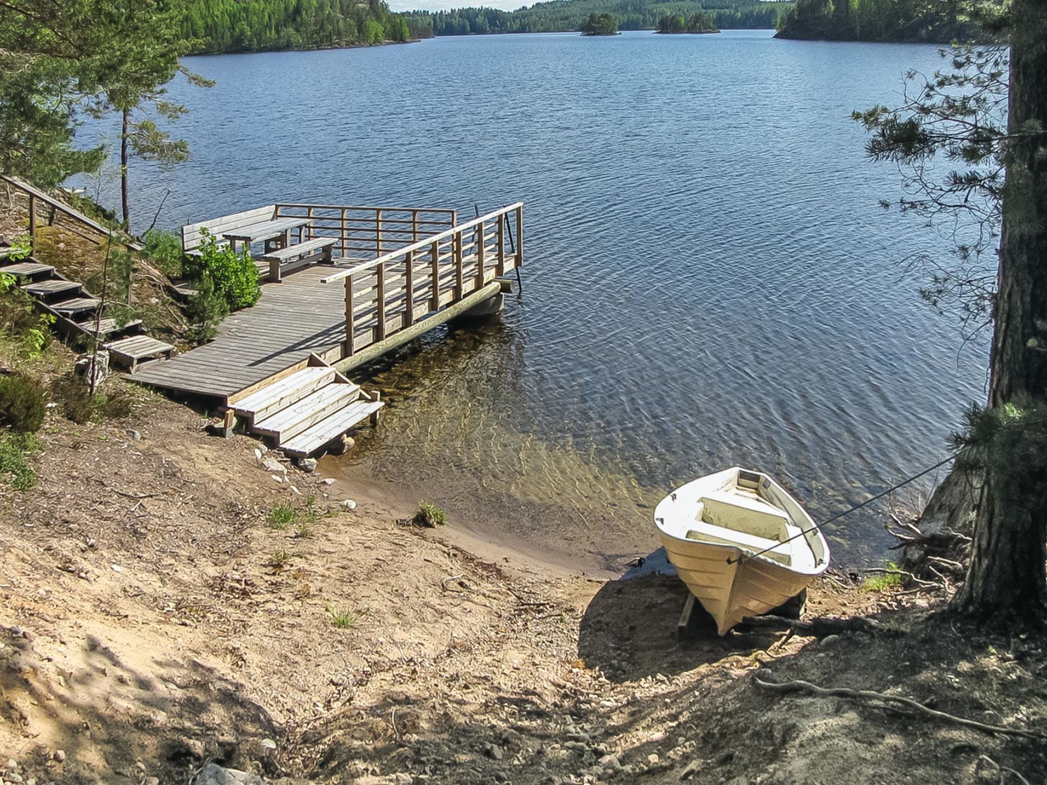 56 km südlich von Savonlinna, See Saimaa Pihlajavesi Gegend 25 m, harter und teilweiser flacher und tiefer Sand-/Felsboden. Eigenes Boot. Holzferienhaus, Baujahr 2006, Wohnküche mit 2 Zustellbetten (Schlafsofa), zwei Schlafzimmer mit je 2 Einzelbetten, Waschraum, Sauna (Elektroherd), Hauswirtschaftsraum, Flur, offene Veranda. Zusätzlich separate Seesauna mit Holzofen, Wohnküche, kaltes und warmes Wasser, Kamin.