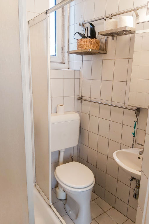 2-Zimmer-Wohnung 40 m2 im 2. Stock. Hell, zweckmässig und komfortabel eingerichtet: Wohn-/Esszimmer mit 1 Doppeldiwanbett, Esstisch, Kabel-TV und Flachbildschirm. 1 kleines Zimmer mit 1 franz. Bett (140 cm), Ventilator. Kochnische (2 Kochplatten, Backofen, Geschirrspüler, elektrische Kaffeemaschine). Dusche/WC. Heizung. Holzböden. Zur Verfügung: Bügeleisen, Haartrockner. Internet (Wireless LAN, gratis). Bitte beachten: Wohnung auf Hofseite. Nichtraucher-Unterkunft. Maximal 1 Haustier/Hund erlaubt.