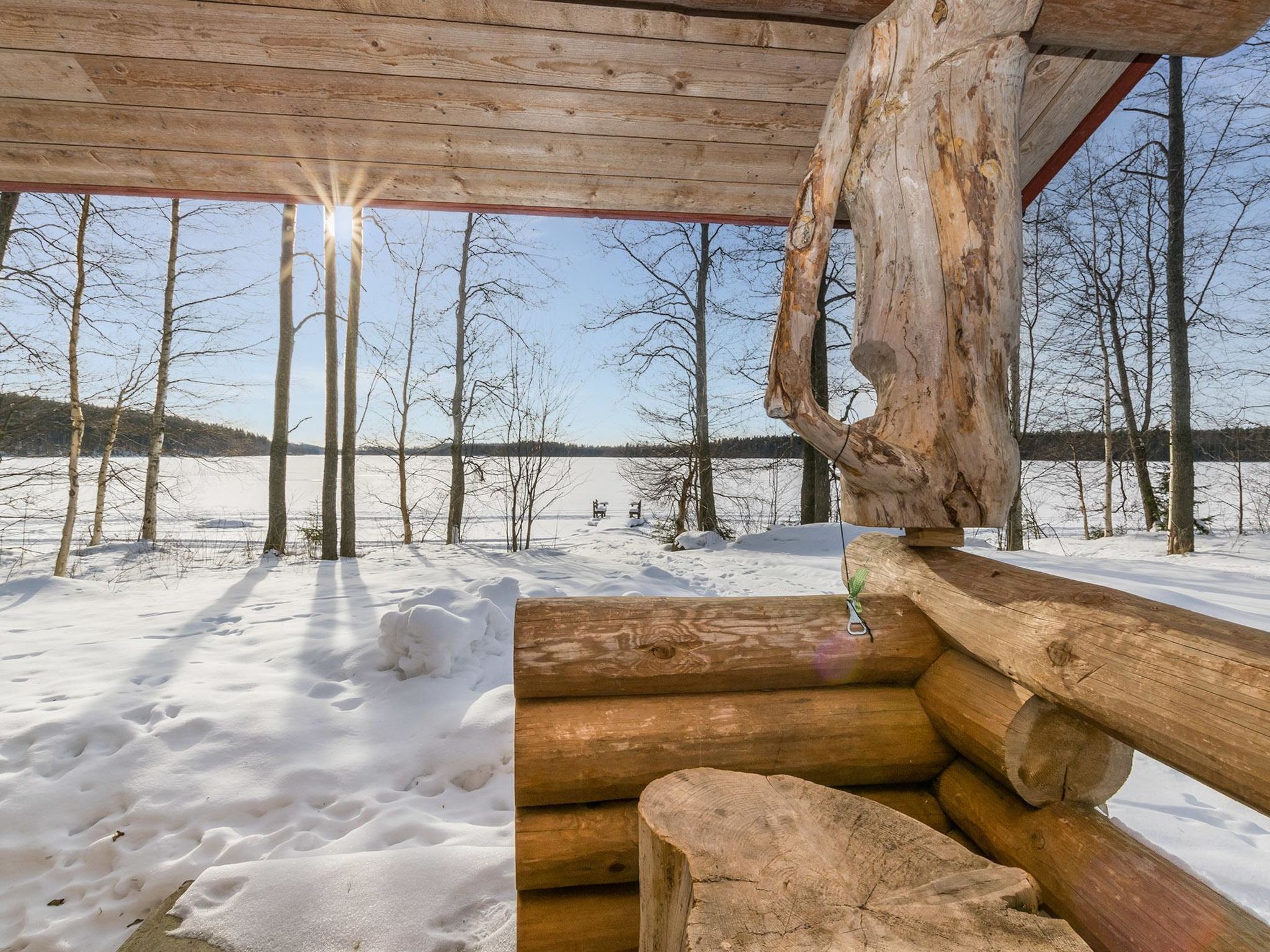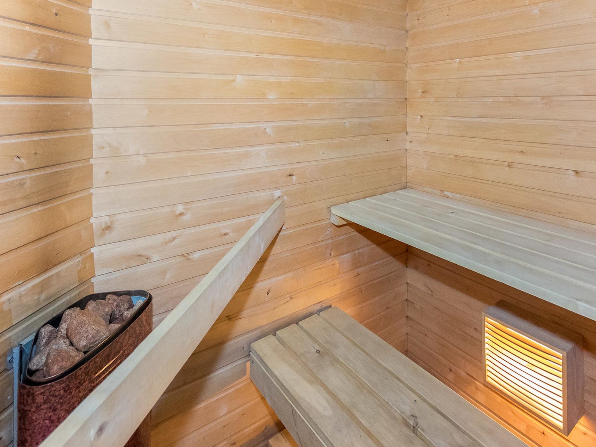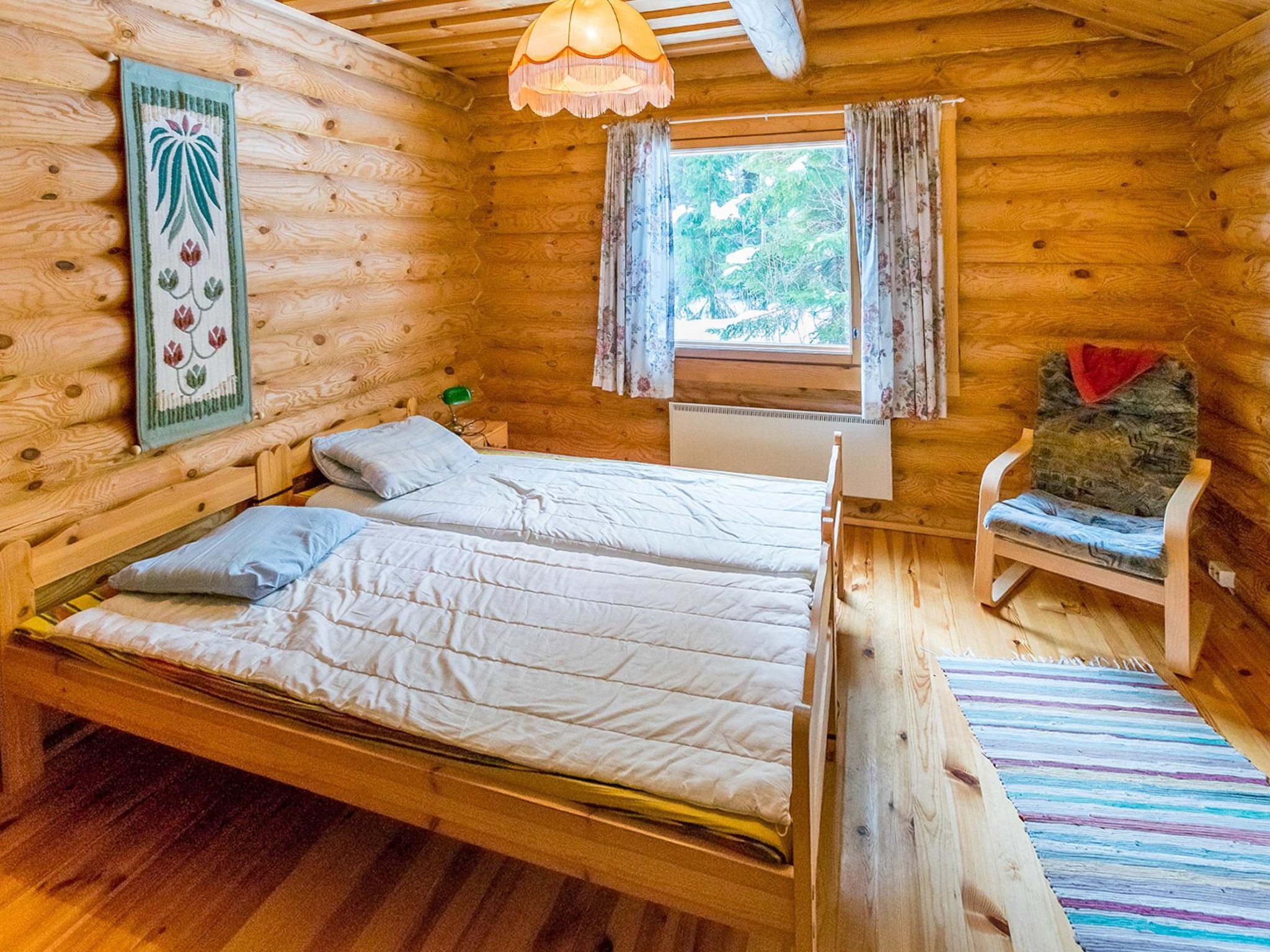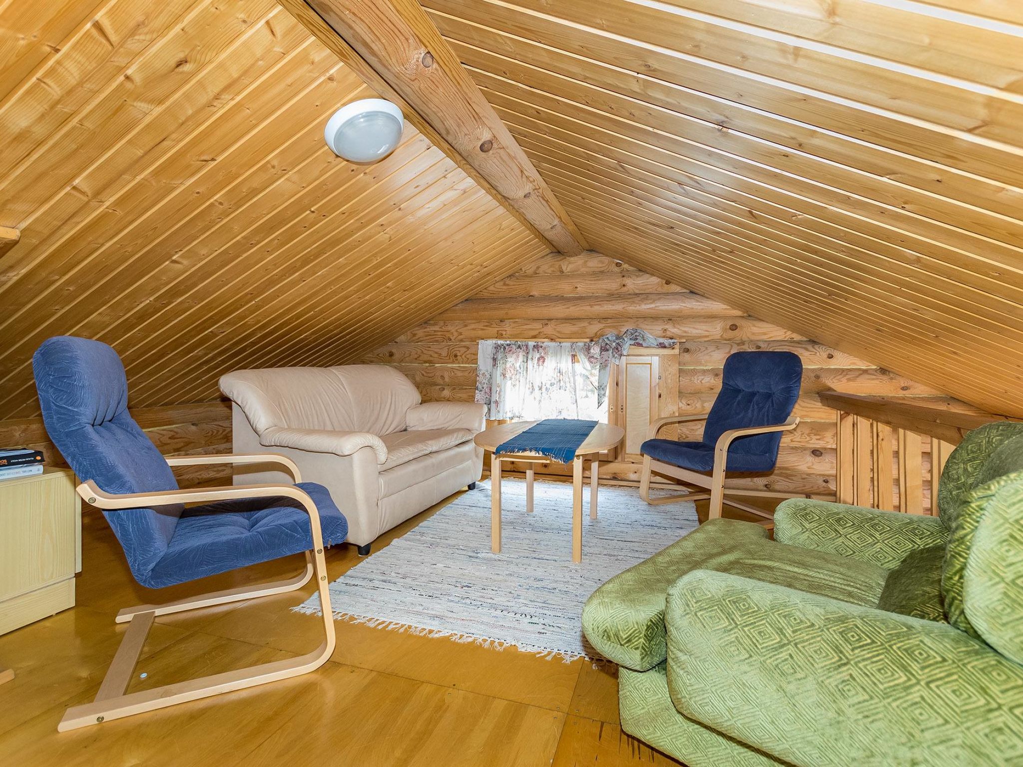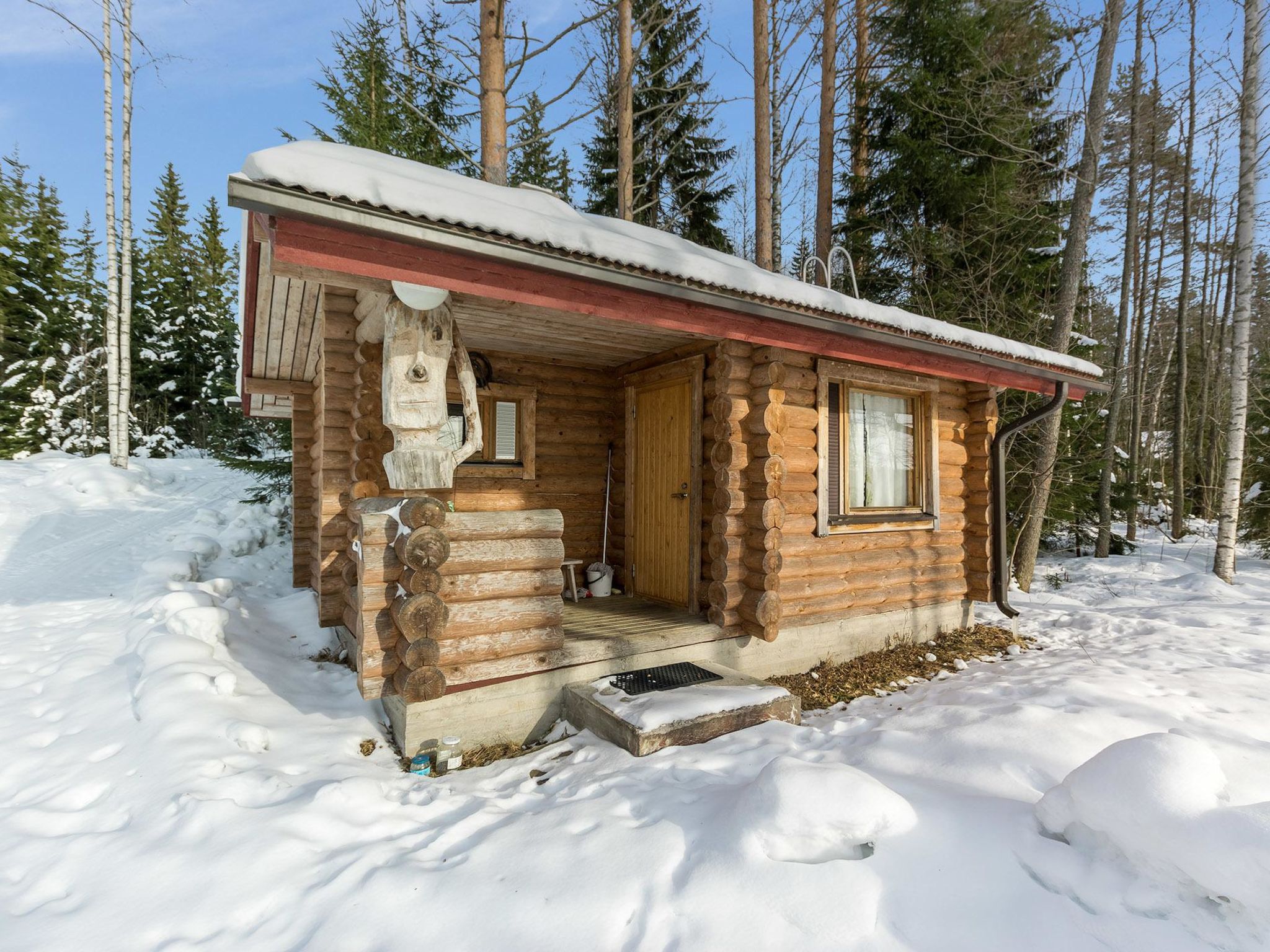 65 km östlich von Jyväskylä. See Hankavesi 50 (Länge 7 km, Breite 3 km), flaches Wasser, harter Sandboden, auch Steine, Anlegestelle und eigenes Boot. Blockhaus, Baujahr 2001, Wohnküche, 2 Schlafzimmer mit je 2 Betten, Schlafboden mit 2 Betten und 120 cm breiter Matratze, Sauna (Elektroherd), Waschraum, Vorraum, offene Veranda. Holzbeheizte Seesauna (20 m2) mit Aufenthaltsraum mit Kamin, elektr. Licht und Heizung, heisses und kaltes fliessendes Wasser, Dusche. Ferienhaus, dessen Standort nach Westen ausgerichtet ist, also abends schöner Sonnenplatz. Draussen ist Steckdose fürs Auto verfügbar. Der Eigentümer vermietet Fahrräder, Kanus und Aussenbordmotoren.