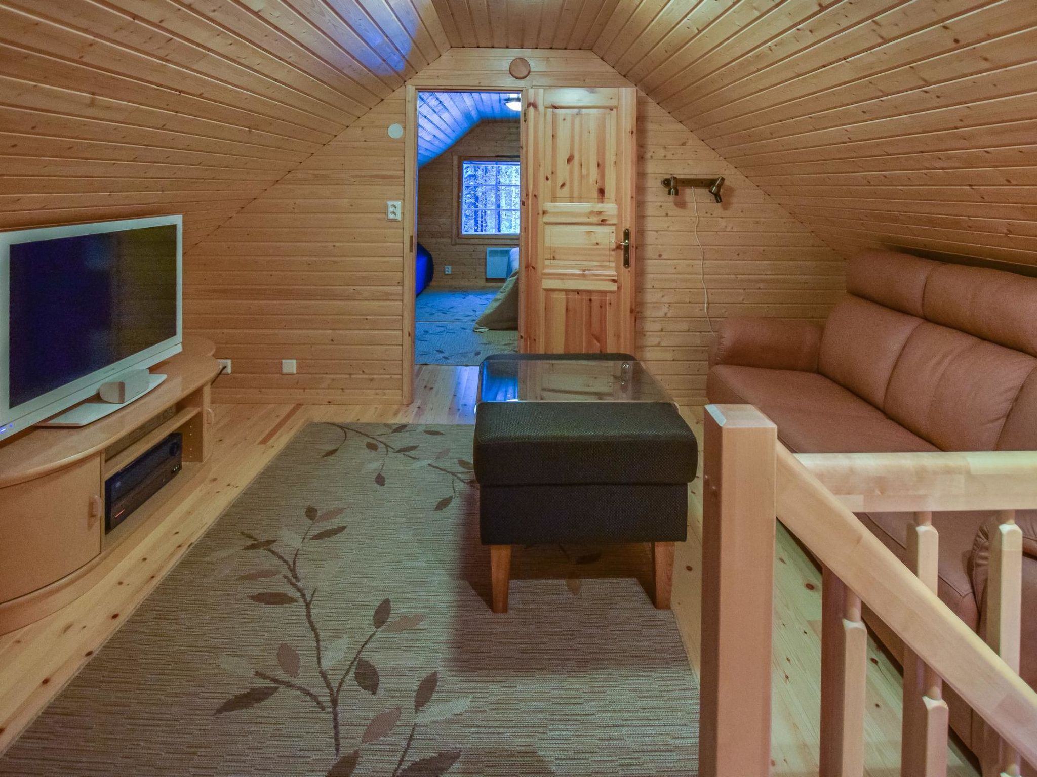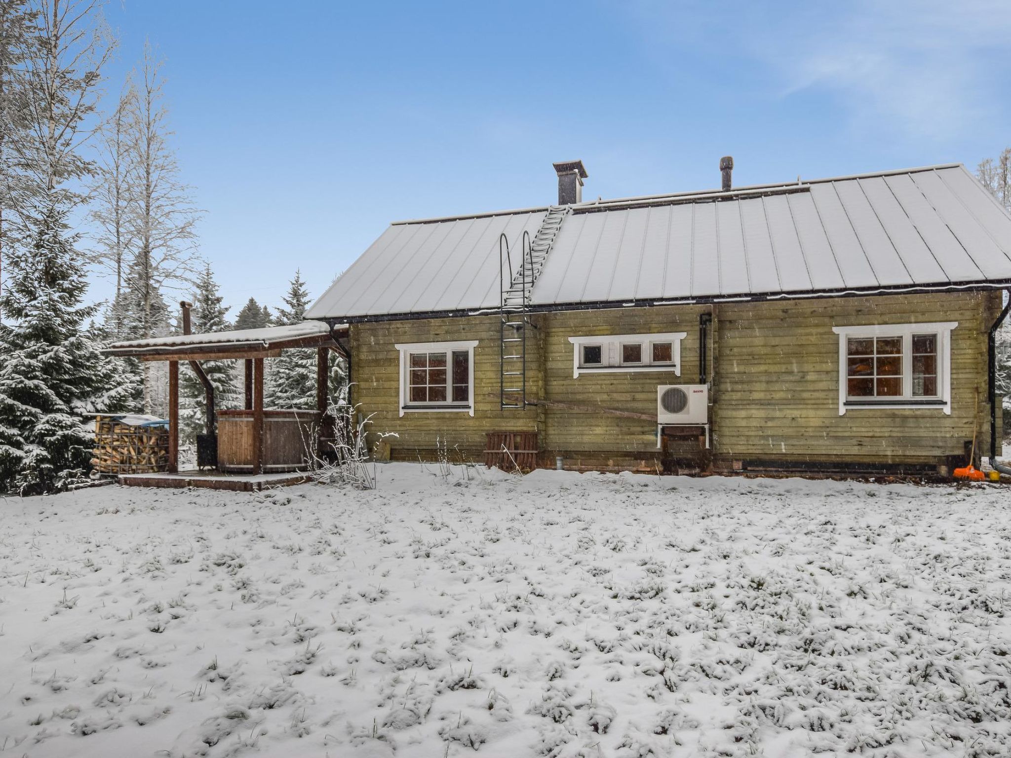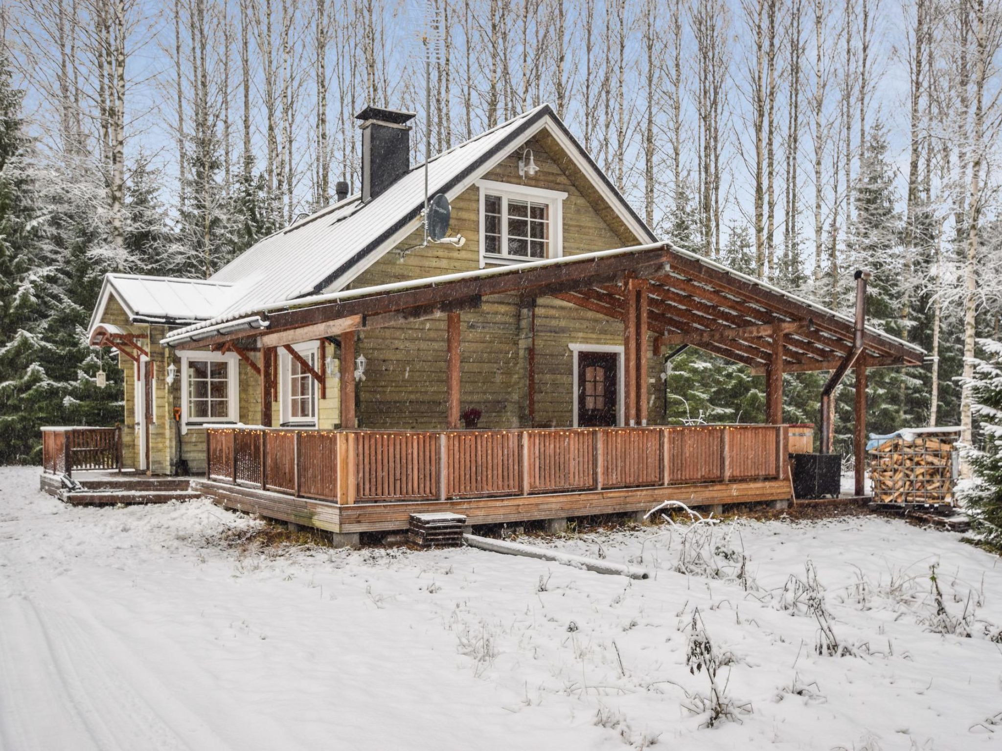 57 km östlich von Jyväskylä, Skigebiet Häkärinteet 4 km entfernt, See Sauvonen 2.5 km entfernt (Breite 0.5 km, Länge 2.5 km). Hochwertiges Blockhaus, Baujahr 2012. Im Erdgeschoss befindet sich Wohnküche mit Schlafcouch und TV, Waschraum, Sauna (Holz- und Elektro-Ofen), Kaminzimmer mit Doppelbett, Toilette. Im Obergeschoss Schlafzimmer mit 1 Doppelbett und Schlafzimmer mit 1 Doppelbett + 1 Einzelbett und TV. Im Obergeschoss, im Wohnbereich, Schlafsofa, TV und gute Tonausstattung. Alle drei Fernseher zeigen Satellitenkanäle an. Auf der grossen überdachten Terrasse finden Sie Holz-Whirlpool, Gasgrill und Esstisch. Josala ist ein hochwertiges und gut ausgestattetes Ferienhaus. Es gibt auch Dusche im Schlafzimmer/Zimmer mit Kamin, aber die wird vor allem beim Kommen/Gehen vom/zum Whirlpool verwendet. 4 km entfernt befindet sich das Skigebiet Häkärinteet. Nach gesonderter Bezahlung / Vereinbarung vermietet der Eigentümer zwei Motorschlitten, Schneemobil-Loipe ist 200 m entfernt. Das Ferienhaus liegt nicht an einem See (Entfernung zum Strand 2.5 km), aber die Nutzung des Aussenwhirlpools (und der ersten Heizung) ist in der Miete enthalten. Strand am See Iso-Virmas (Sandboden, flach), Entfernung 2 km mit dem Auto + 500 m zu Fuss. Häkärinteet 4 km, Revontuli 10 km (18-Loch-Golfplatz, Tanzrestaurant, Kegelbahn), Reitschule 20 km, Kurhotel Laajavuori 62 km, Bahnhof Hankasalmi 16 km, Pieksämäki 37 km, Flughafen Jyväskylä 74 km, Varkaus 78 km, Kuopio 100 km.