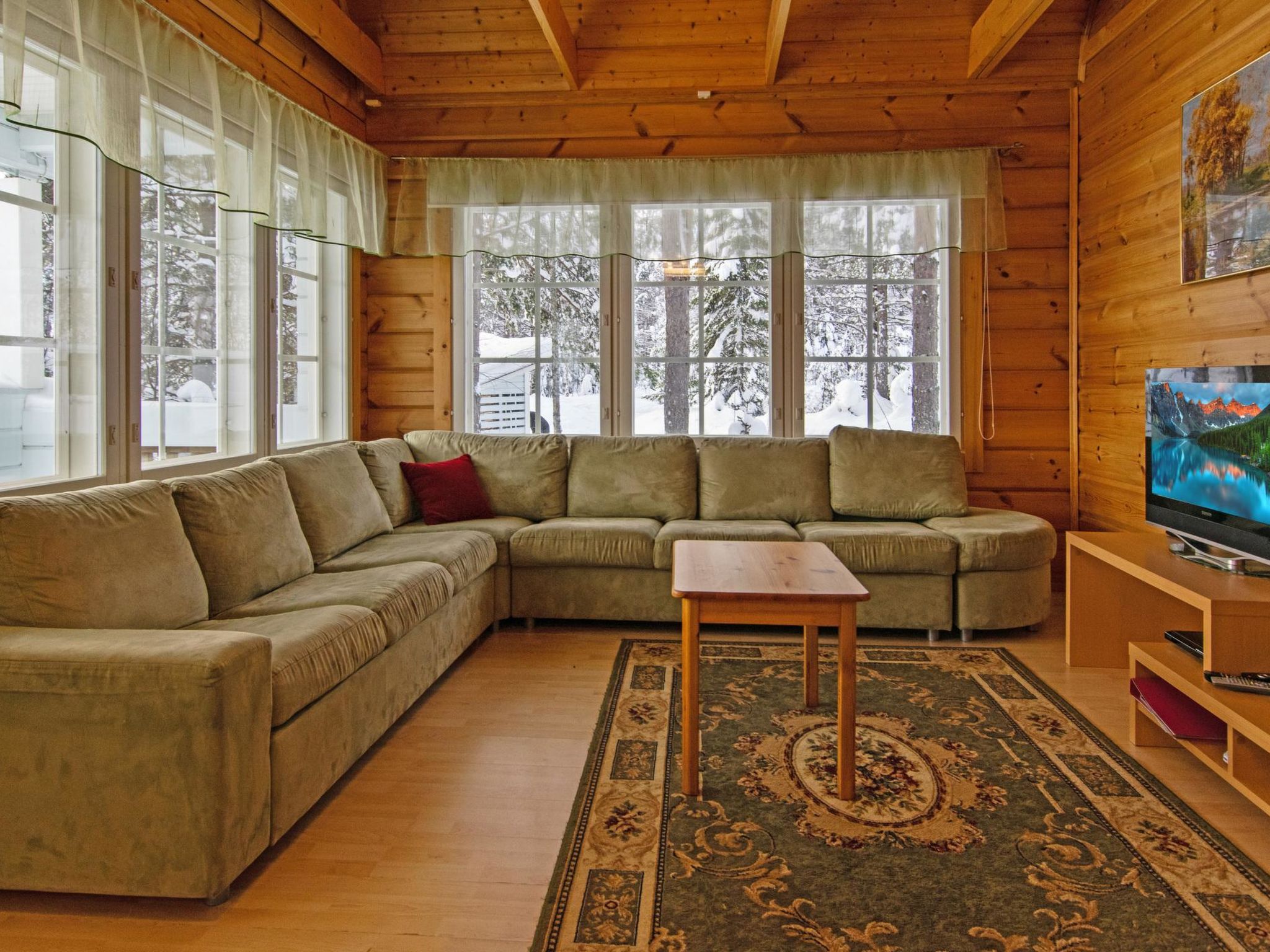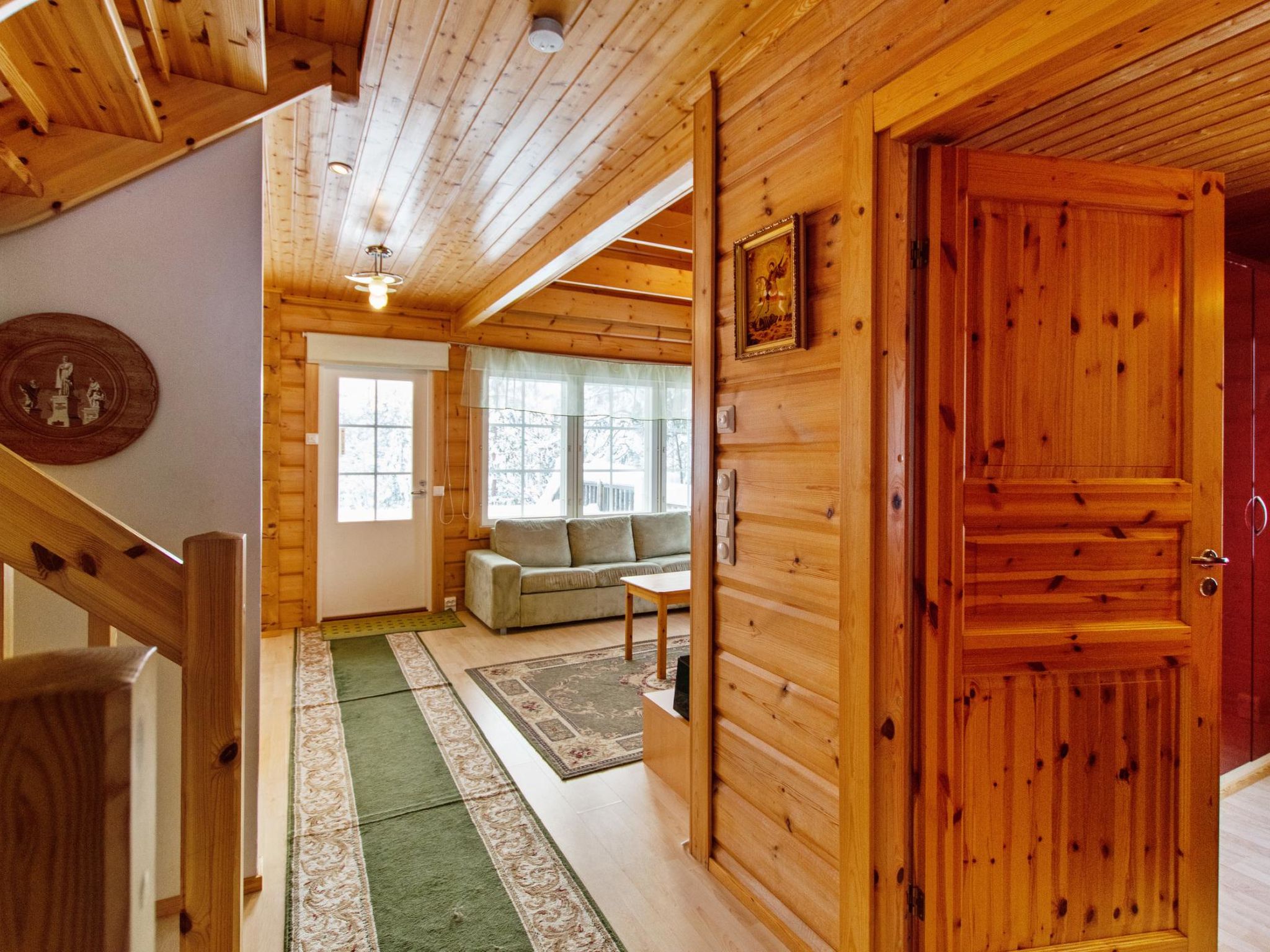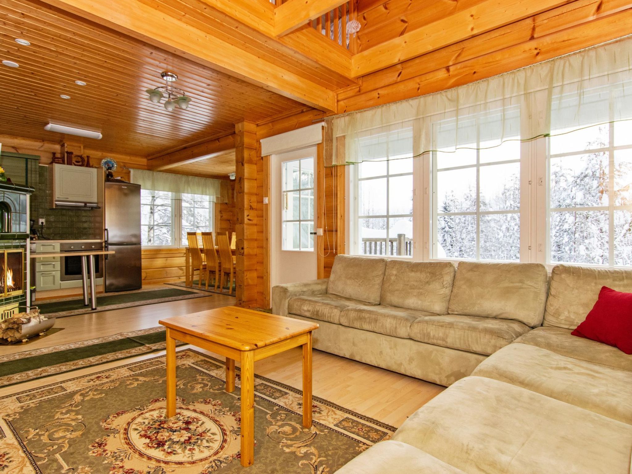 Block-Ferienhaus im Tourismuszentrum Ukkohalla, 9 Personen, Fläche 94m2, Baujahr 2007, Küche, 2 Schlafzimmer, Dachboden, Sauna/elektrische Sauna, Duschbad/WC, Balkon und Terrasse, Kamin und Brennholz, 1 Doppelbett im Schlafzimmer (Erdgeschoss), 1 Doppelbett und 1 Bett auf dem Dachboden, Schlafcouch in der Lobby des Dachbodens und Wohnzimmer. Ukkohalla: Tourismuszentrum am See Syväjärvi, mit Informationszentrum, Geschäft, Restaurant, Spa, Pistenzentrum, Schneemobilpisten, Skipisten, Programmservice, Cable Wakeboard, Strand (weitere Informationen unter www.ukkohalla.fi). Entfernung zu den Ukkohalla-Diensten 1,0 km. Flughafen Kajaani 86 km, Oulu 170 km, Helsinki 650 km, Bushaltestelle Hyrynsalmi 18 km, Bahnhof Kontiomäki 66 km. Haustiere verboten. Blick über die Pisten. Das Ferienhaus steht am Anreisetag ab 16.00 Uhr bis 12.00 Uhr am Abreisetag zur Verfügung.