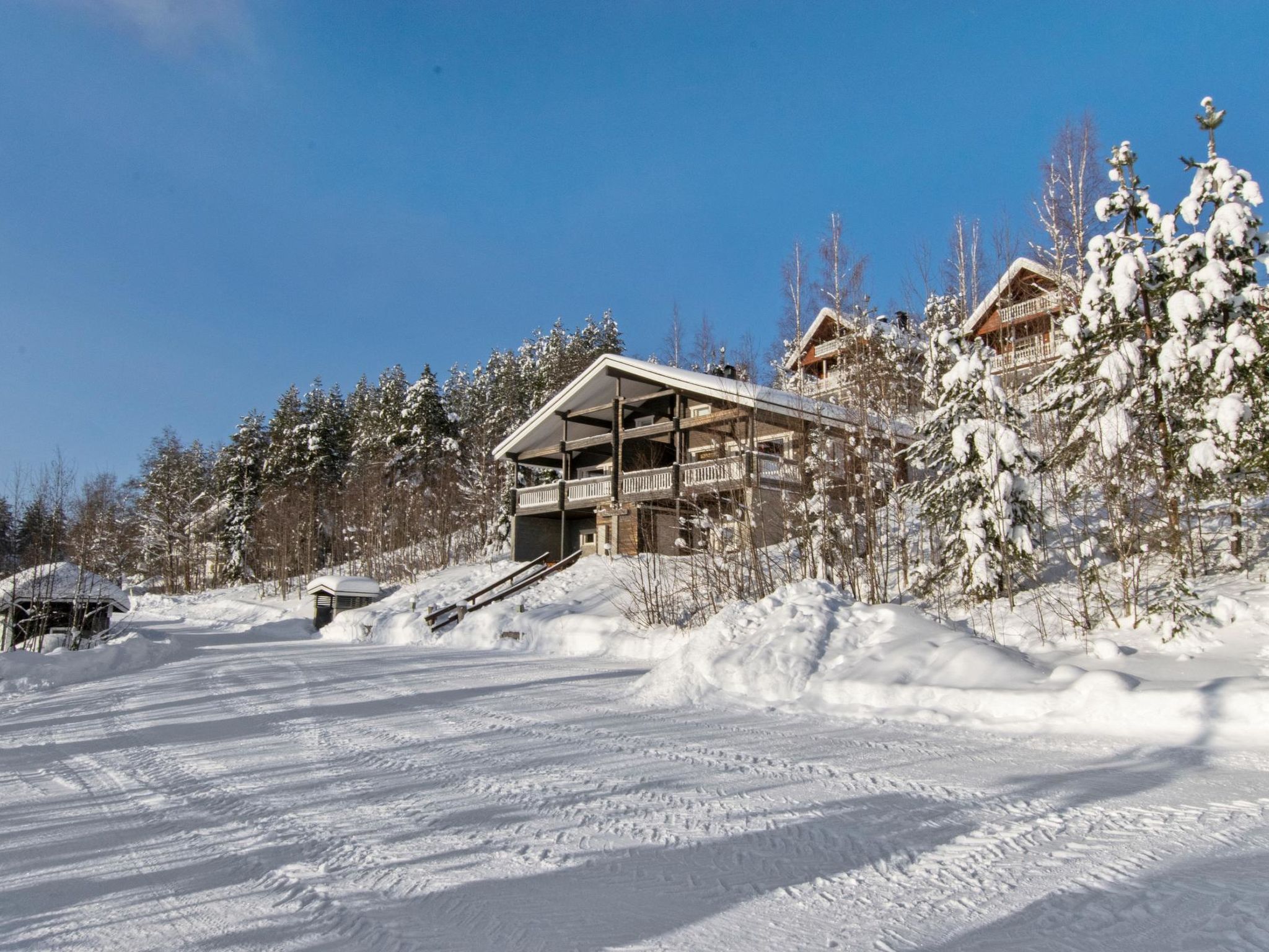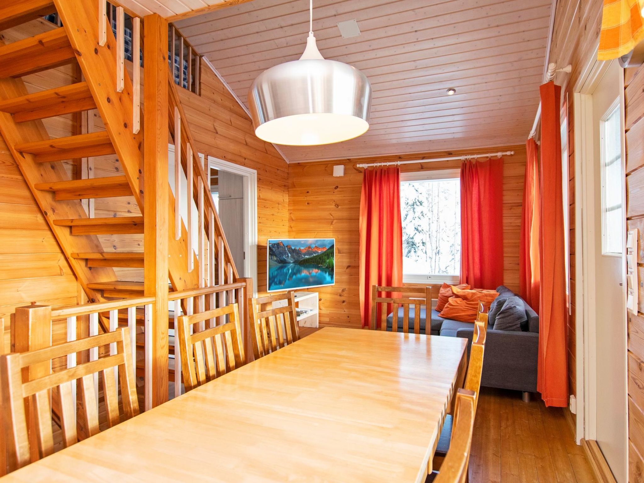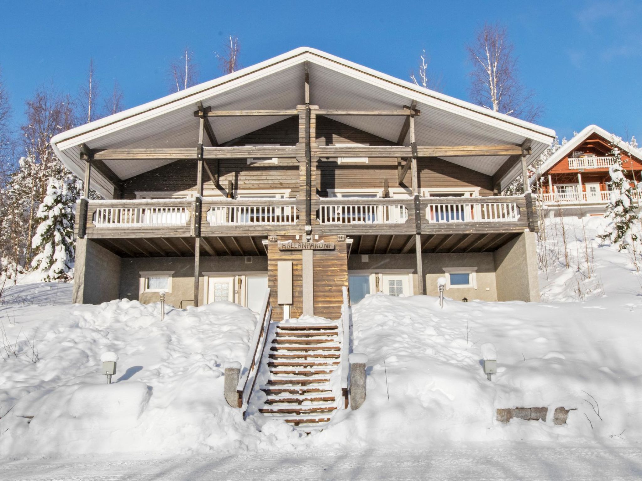 Maximal 1 Haustier/Hund erlaubt. Doppelhaushälfte, im Tourismuszentrum Ukkohalla, Fläche 68m2 + Dachboden 23m2, Baujahr 2007, Räumlichkeiten auf 3 Etagen, Küche, 2 Schlafzimmer, Dachboden, Sauna, Dusche/WC, separates WC, Kaminzimmer mit Sofa-Bett, Abstellraum, Balkon, Terrasse, Kamin und Brennholz. 2 Betten im anderen Schlafzimmer, im weiteren Schlafzimmer Doppelbett (120cm), 4 Matratzen auf dem Dachboden. Ausstattung: Elektroherd, Mikrowelle, Kühlschrank mit Gefrierfach, Dunstabzugshaube, Geschirr, Spülmaschine, Toaster, Wasserkocher, Kaffeemaschine, Reinigungsutensilien, Staubsauger, Wärmeschrank, TV, DVD, Radio, CD-Spieler, KFZ-Steckdose. Ukkohalla: Tourismuszentrum am See Syväjärvi, Informationszentrum, Geschäft, Restaurant, Spa, Pistenzentrum, Schneemobilpisten, Skipisten, Programmservice, Strand (weitere Informationen unter www.ukkohalla.fi). Entfernung zu den Ukkohalla-Diensten 1,5 km. Flughafen Kajaani 86 km, Oulu 170 km, Helsinki 650 km, Bushaltestelle Hyrynsalmi 18 km, Bahnhof Kontiomäki 66 km. Haustiere erlaubt, Blick über die Pisten und den See Syväjärvi. Das Ferienhaus steht am Anreisetag ab 16.00 Uhr bis 12.00 Uhr am Abreisetag zur Verfügung.