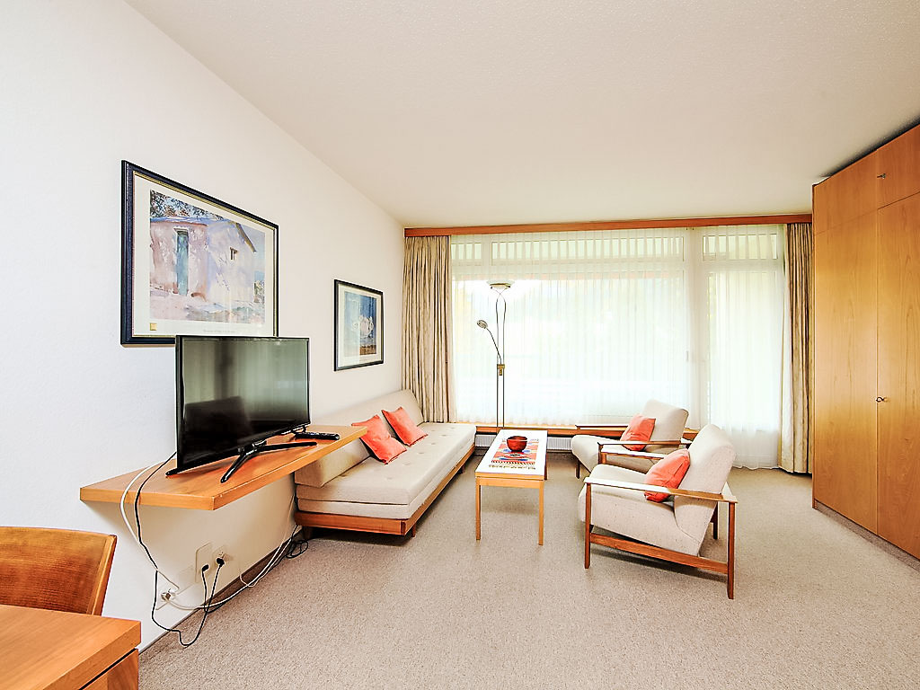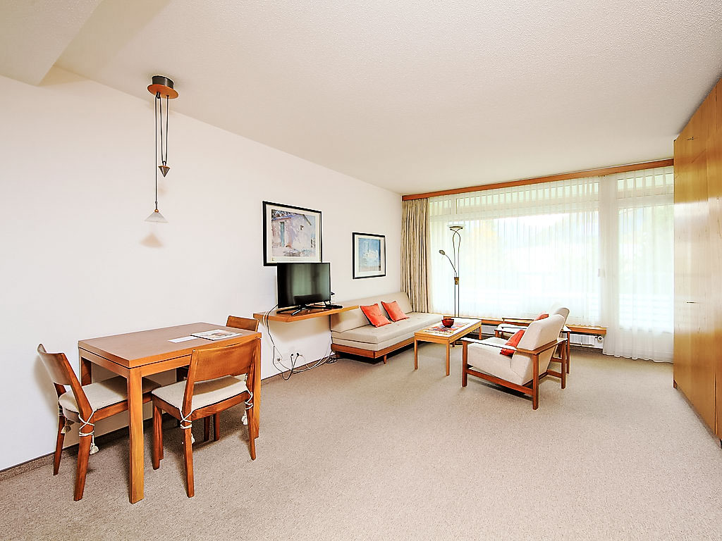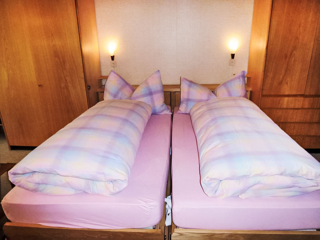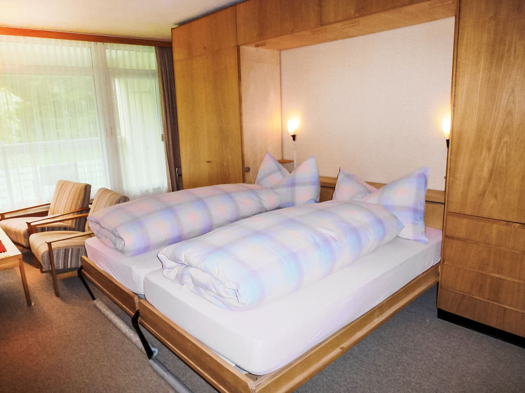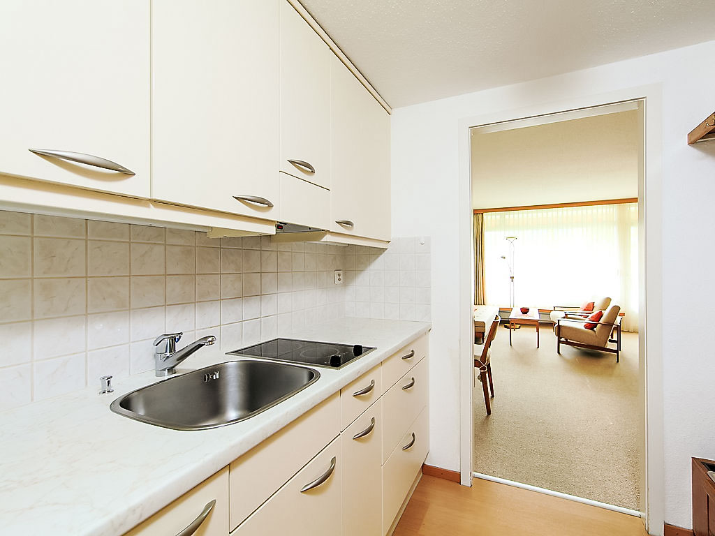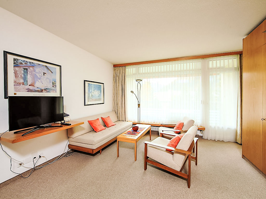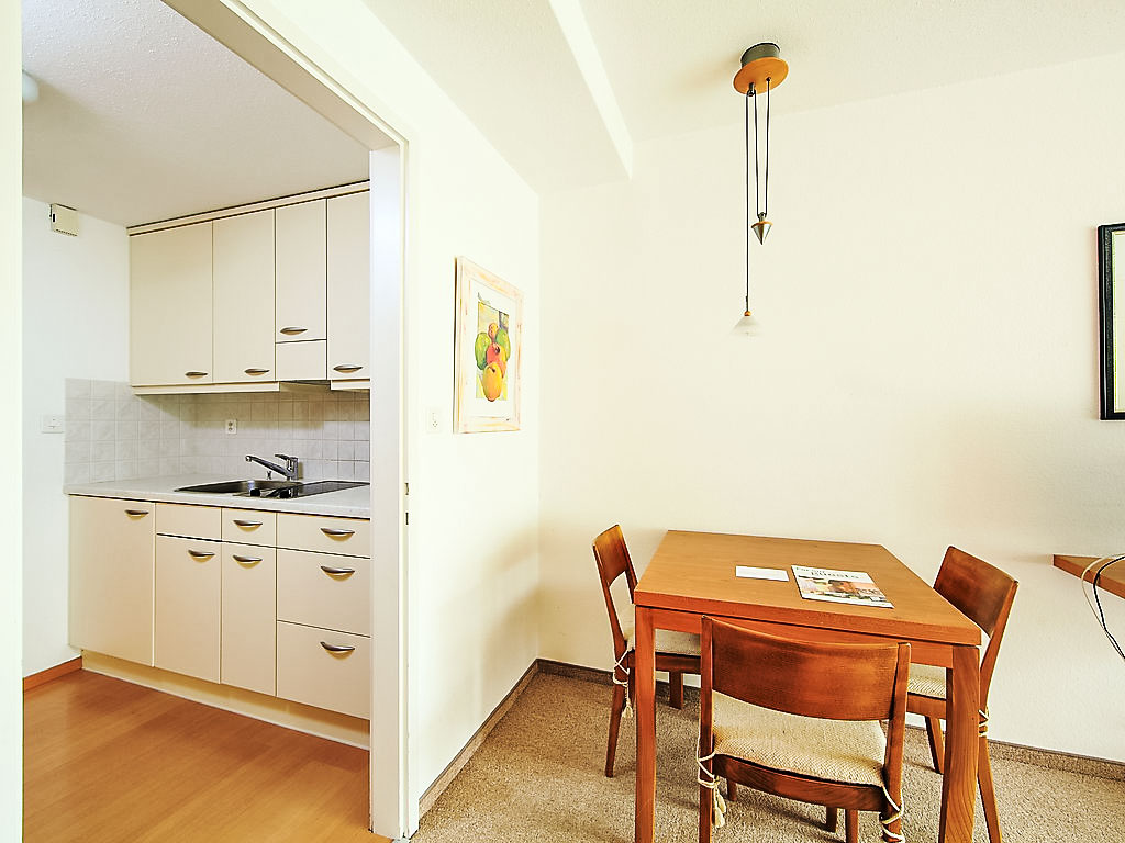 1-Zimmer-Wohnung 28 m2 im 4. Stock. Einfach und zweckmässig eingerichtet: Wohn-/Esszimmer mit 2 Wandschrankbetten und Kabel-TV (Flachbildschirm), Radio. Ausgang zum Balkon. Kochnische im Eingang (2 Glaskeramikherd Platten). Sitzbad/WC. Balkon 8 m2, Südlage. Schöne Sicht auf die Berge, die Landschaft und die Ortschaft. Parkplatz. Bitte beachten: Nichtraucher-Unterkunft.