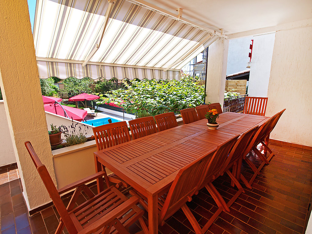 6-Zimmer-Reihenhaus 200 m2 auf 2 Stockwerken. Wohnzimmer mit Sat-TV und DVD. Ausgang zur Terrasse. Wohnzimmer mit offenem Kamin. Ausgang zur Terrasse. Esszimmer. Küche (4 Kochplatten, Backofen, Geschirrspüler, Mikrowelle, Tiefkühler) mit Esstisch. Dusche/WC. Klimaanlage. Obergeschoss: 1 Zimmer mit 2 Betten (80 cm, Länge 200 cm). 1 Zimmer mit 1 franz. Bett (160 cm, Länge 200 cm). Ausgang zum Balkon. 1 Zimmer mit 1 Doppelbett (2 x 80 cm, Länge 200 cm). 1 Zimmer mit 1 franz. Bett (160 cm, Länge 200 cm). Ausgang zur Terrasse. 2 Duschen/Bidet/WC. Klimaanlage. Balkon 7 m2, Terrasse 16 m2, überdacht, Terrasse 10 m2, überdacht. Terrassenmöbel. Sicht auf das Schwimmbad. Zur Verfügung: Internet (Wireless LAN, gratis).