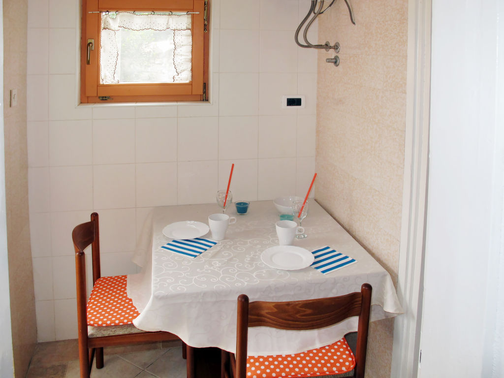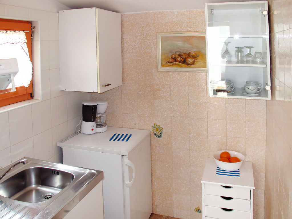 1-Zimmer-Wohnung, Hochparterre, ca. 25 m². Kleine Küche (2 Platten, Kühlschrank, Kaffeemaschine, Wasserkocher, Toaster) mit Essplatz, von hier über Außentreppe zum Innenhof. Doppelzimmer mit Dusche/WC.
