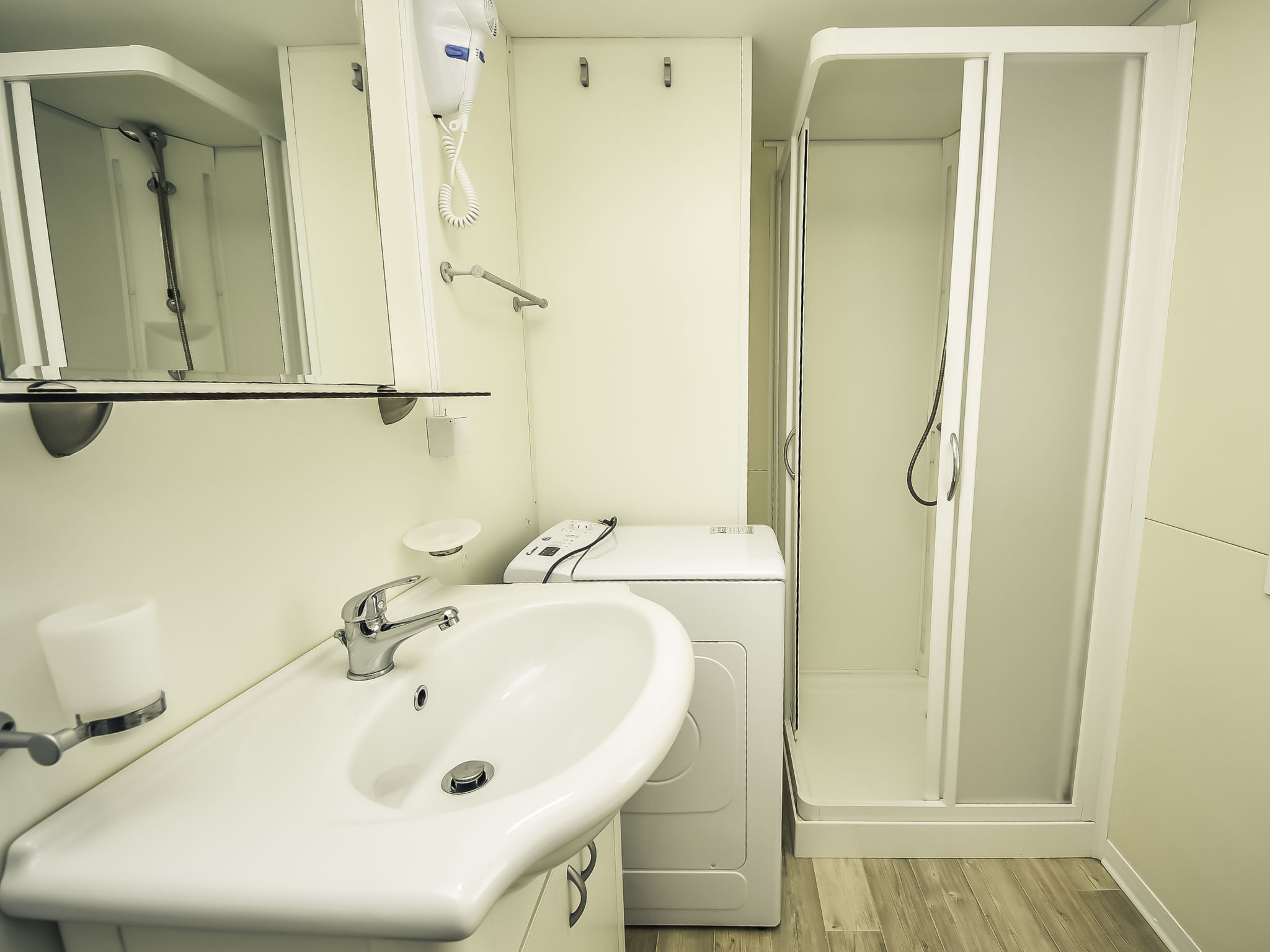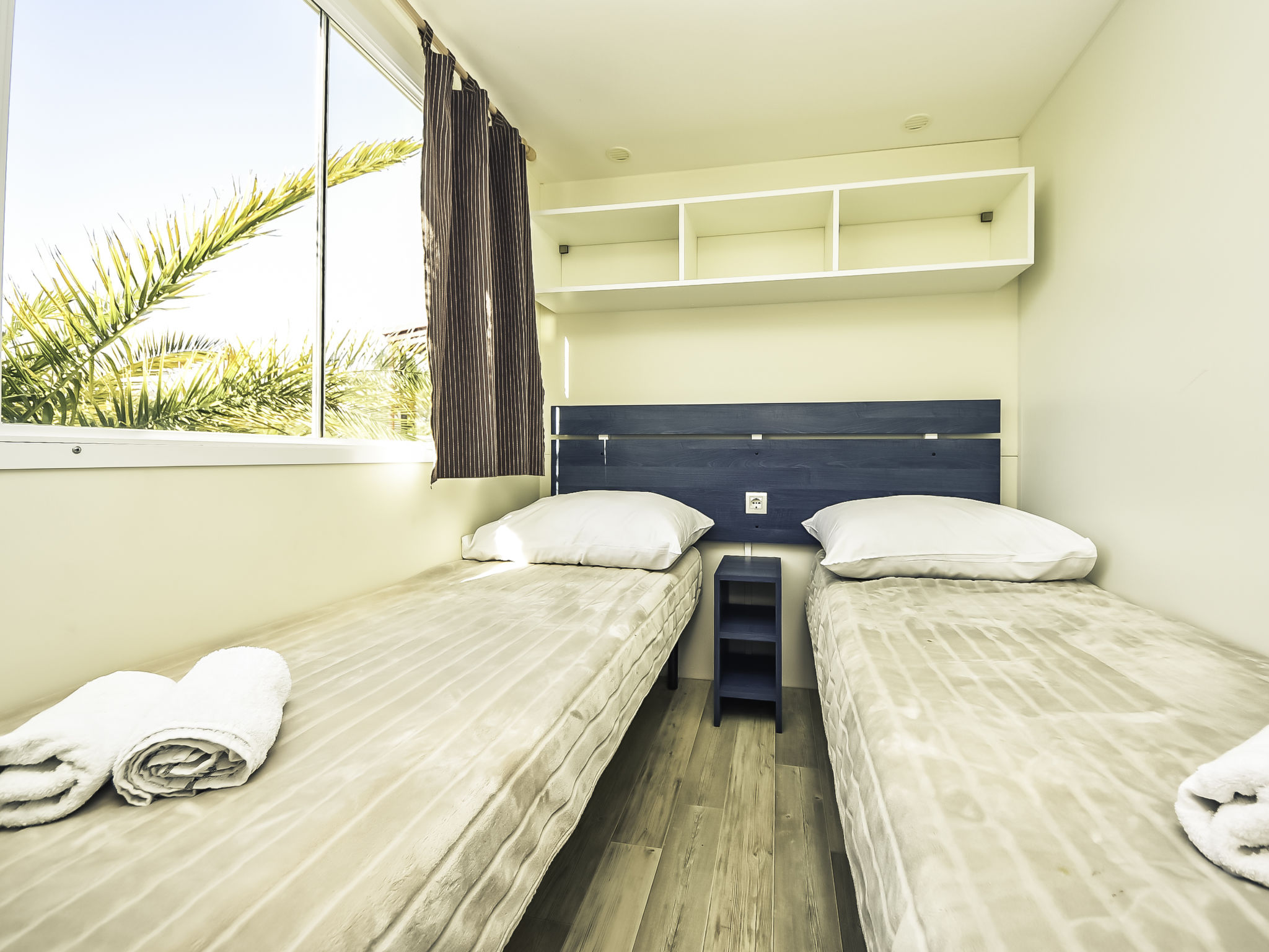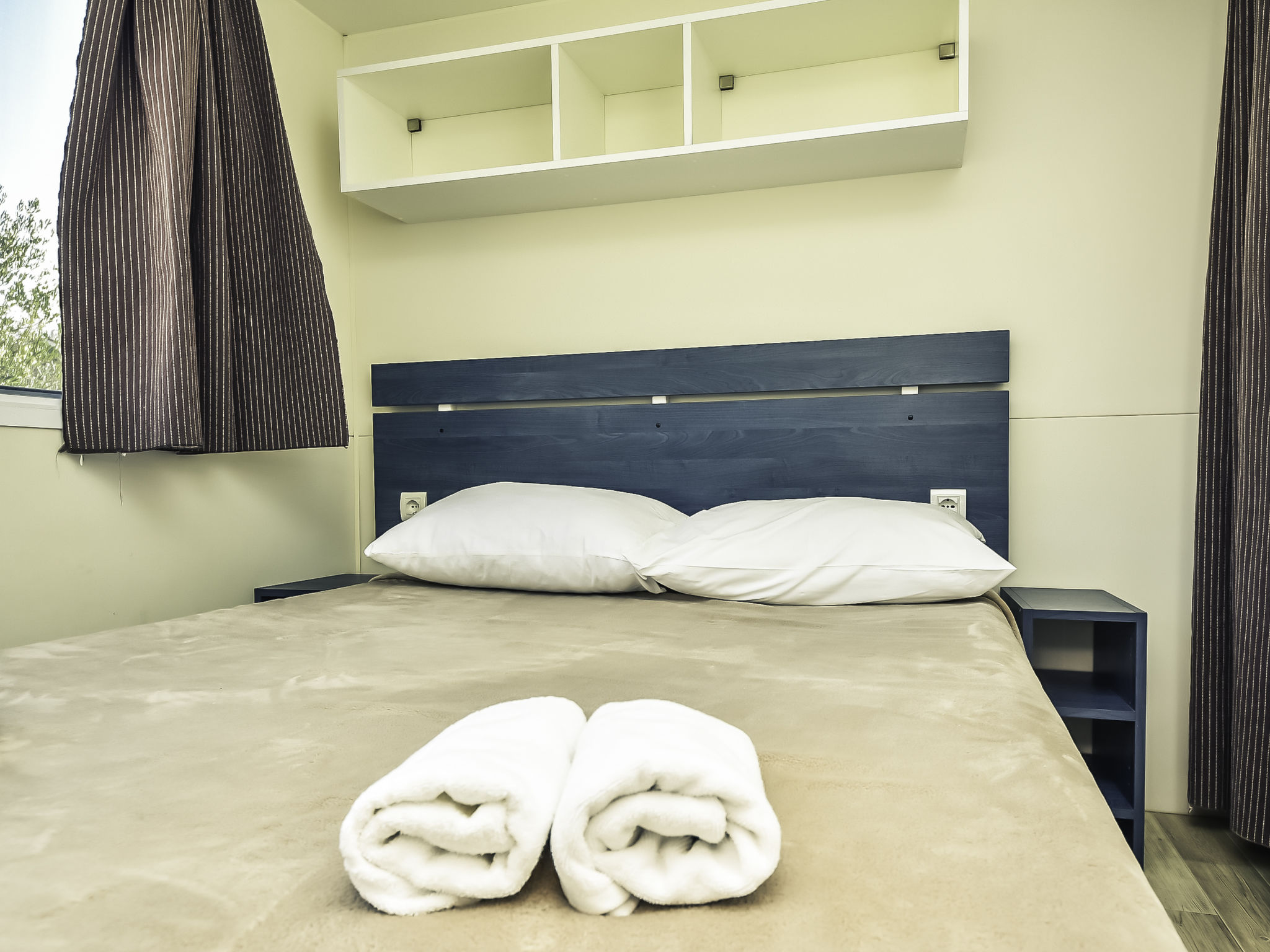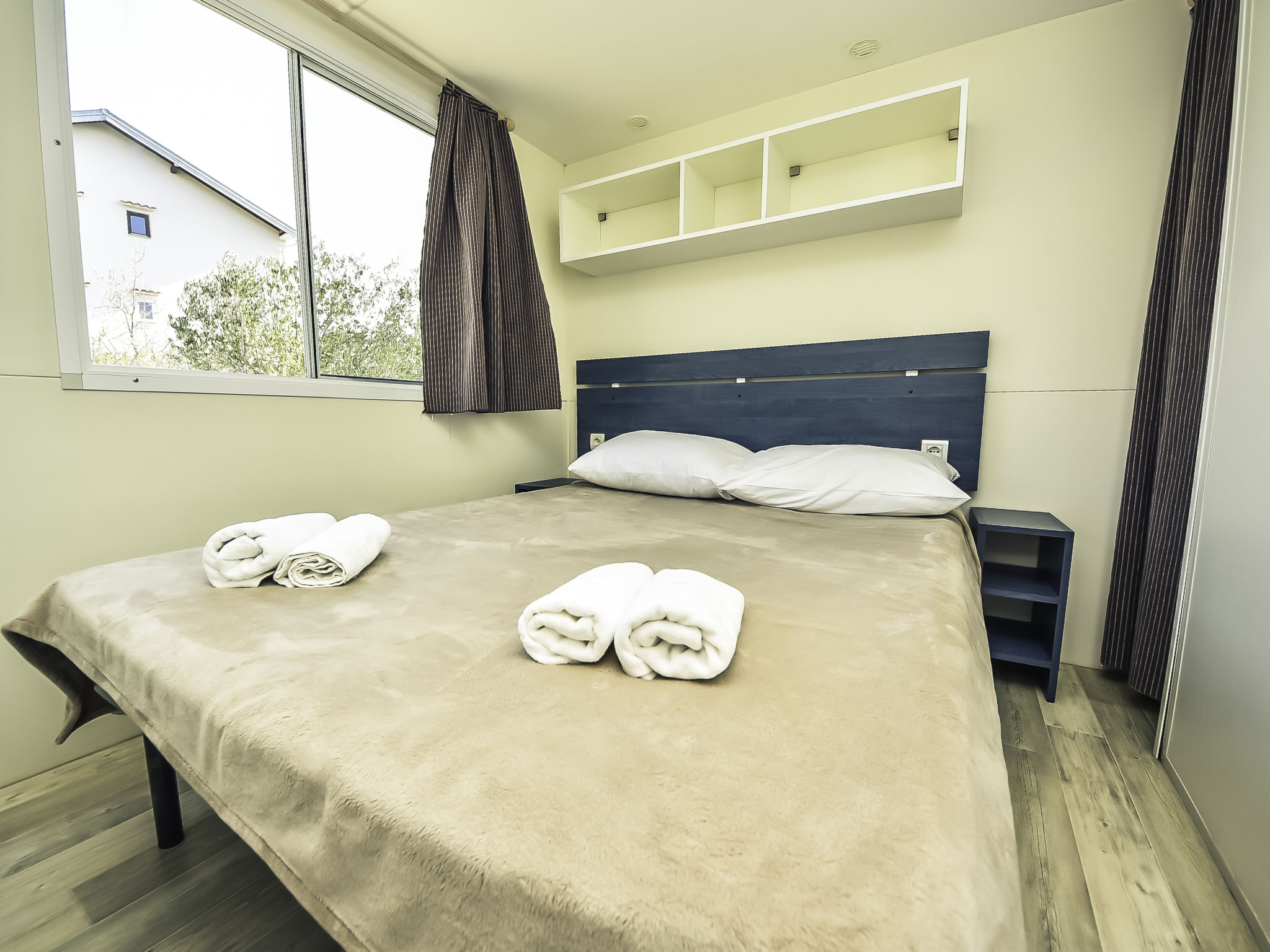 4-Zimmer-Mobilheim 32 m2, Westlage. Wohn-/Esszimmer mit Sat-TV (Flachbildschirm), Klimaanlage. Ausgang zur Terrasse. 1 Zimmer mit 1 franz. Bett (140 cm, Länge 190 cm). 2 Zimmer, jedes Zimmer mit 2 Betten (70 cm, Länge 190 cm). Offene Küche (4 Kochplatten, Tiefkühler). Dusche/WC. Terrasse 14 m2 teilweise überdacht. Terrassenmöbel. Sicht auf das Meer. Zur Verfügung: Waschmaschine, Haartrockner. Internet (Wireless LAN, gratis).