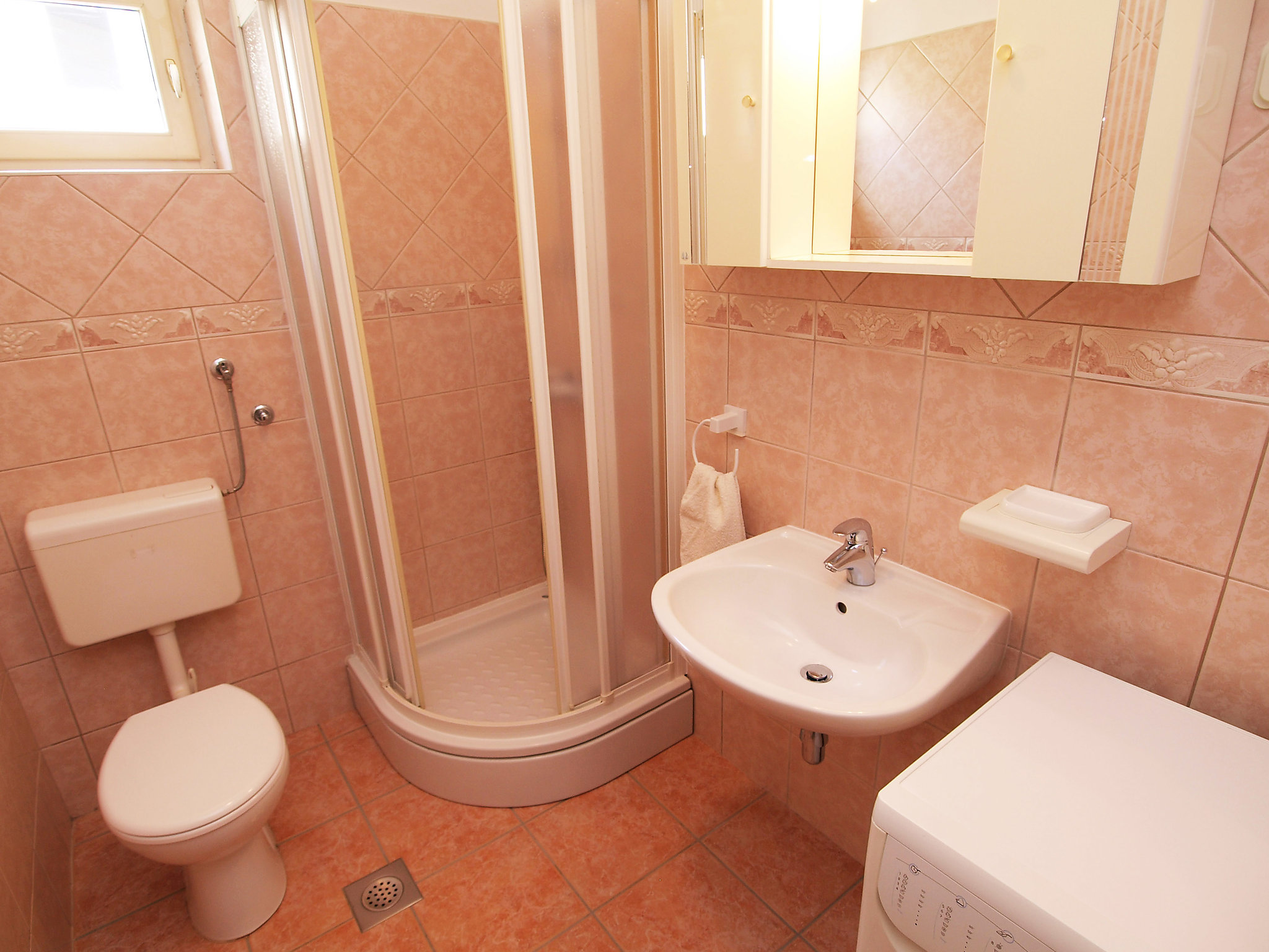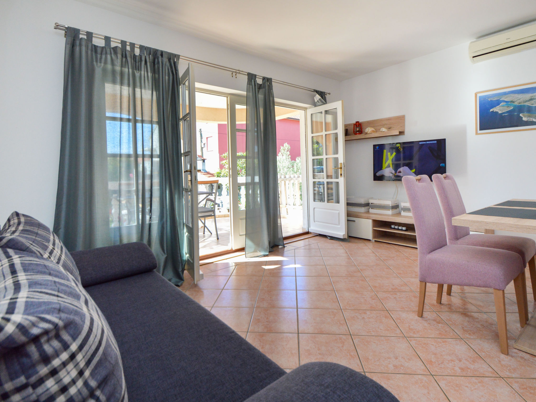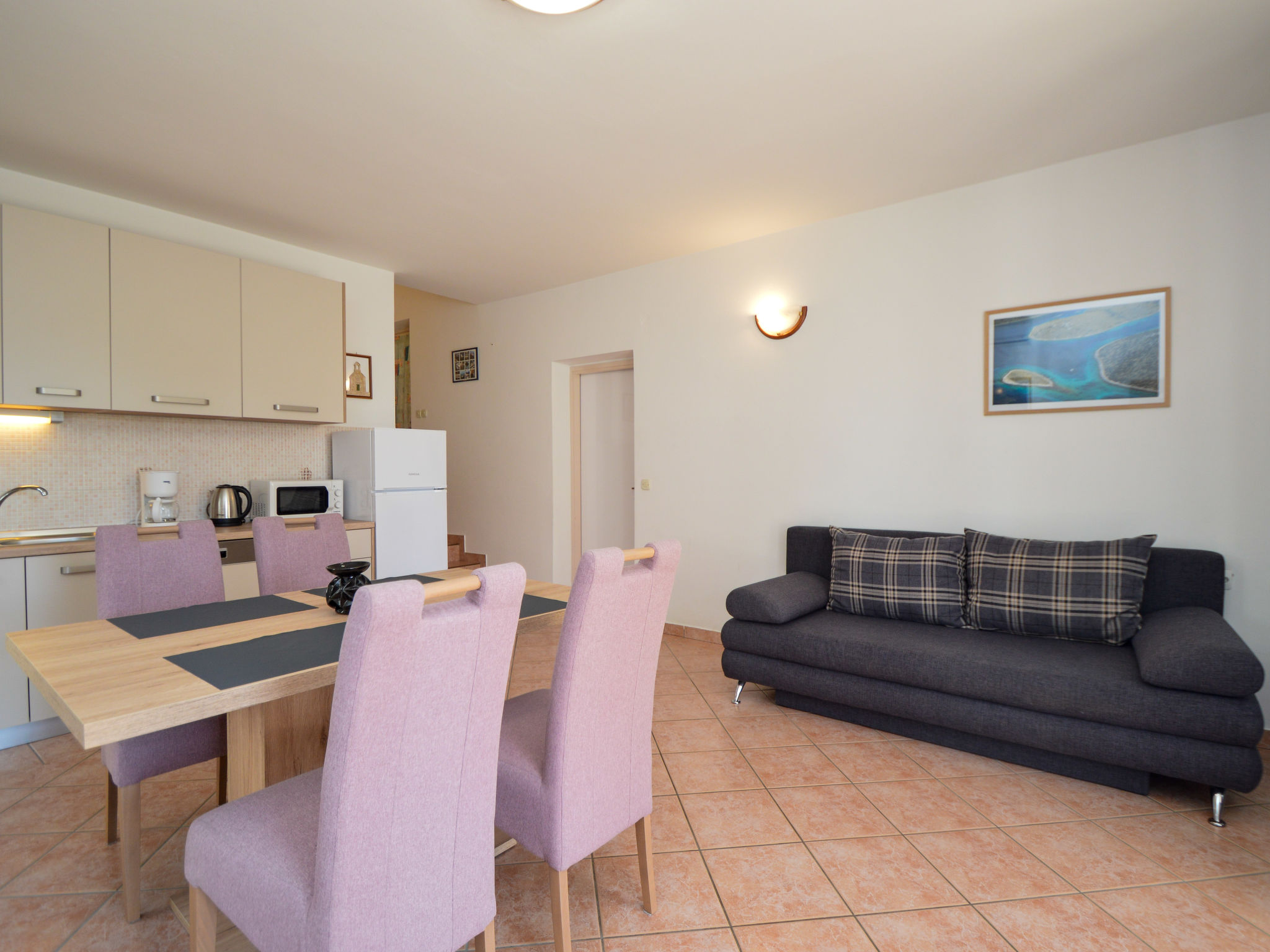 2-Zimmer-Wohnung 55 m2, im Erdgeschoss. Schön und gemütlich eingerichtet: Wohn-/Esszimmer 25 m2 mit 1 Doppeldiwanbett (130 cm, Länge 190 cm), Sat-TV (Flachbildschirm), Klimaanlage. Ausgang zur Terrasse. 1 Zimmer mit 1 Doppelbett (2 x 90 cm, Länge 190 cm). Offene Küche (Backofen, Geschirrspüler, 4 Glaskeramikherd Platten, Mikrowelle, Tiefkühler, elektrische Kaffeemaschine). Dusche/WC. Warmluftheizung. Terrasse 16 m2, überdacht. Terrassenmöbel. Zur Verfügung: Waschmaschine. Internet (Wireless LAN, gratis). 1 Haustier/Hund erlaubt.