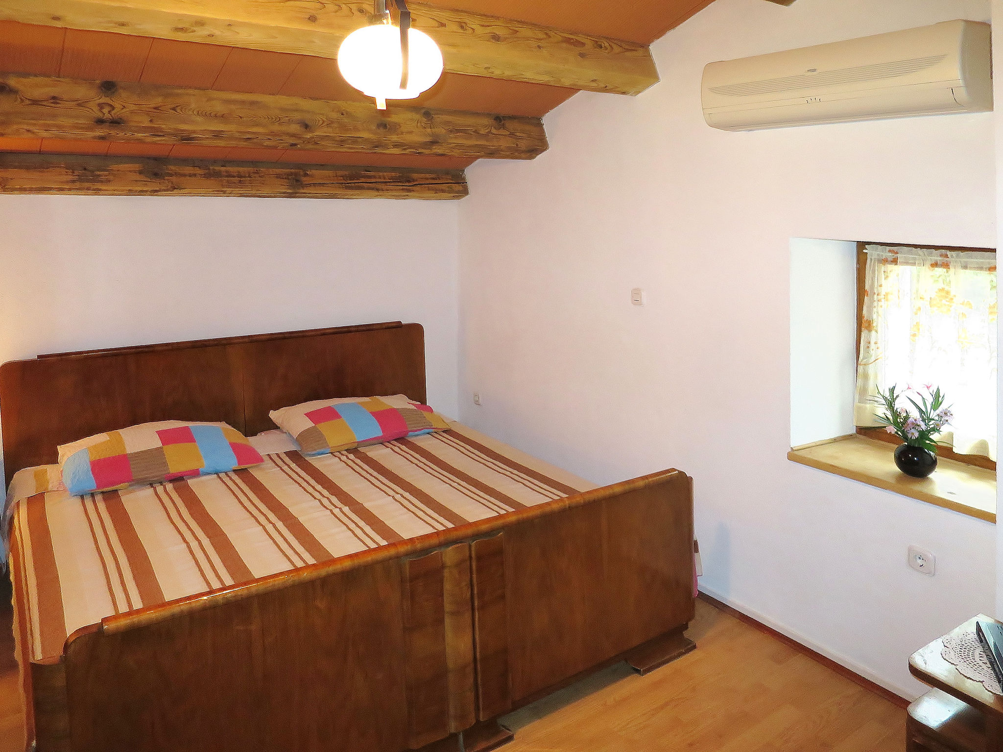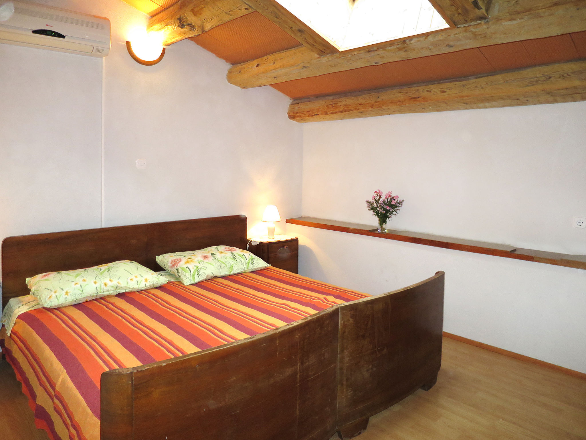 3-Zimmer-Doppelhaushälfte 64 m2 auf 2 Stockwerken. 1 Zimmer mit 2 Betten. Offene Küche (2 Kochplatten, Backofen, Geschirrspüler, 2 Flammen, Toaster, Wasserkocher, Mikrowelle, elektrische Kaffeemaschine) mit Esstisch, Sat-TV. Ausgang zur Terrasse. Dusche/WC. Obergeschoss: (Wendeltreppe) 2 abgeschrägte Zimmer, jedes Zimmer mit 1 Doppelbett und Klimaanlage. Dusche/WC. Terrasse überdacht. Terrassenmöbel, Liegestühle. Zur Verfügung: Internet (Wireless LAN, gratis). Bitte beachten: Nichtraucher-Haus. Maximal 2 Haustiere/Hunde erlaubt.
