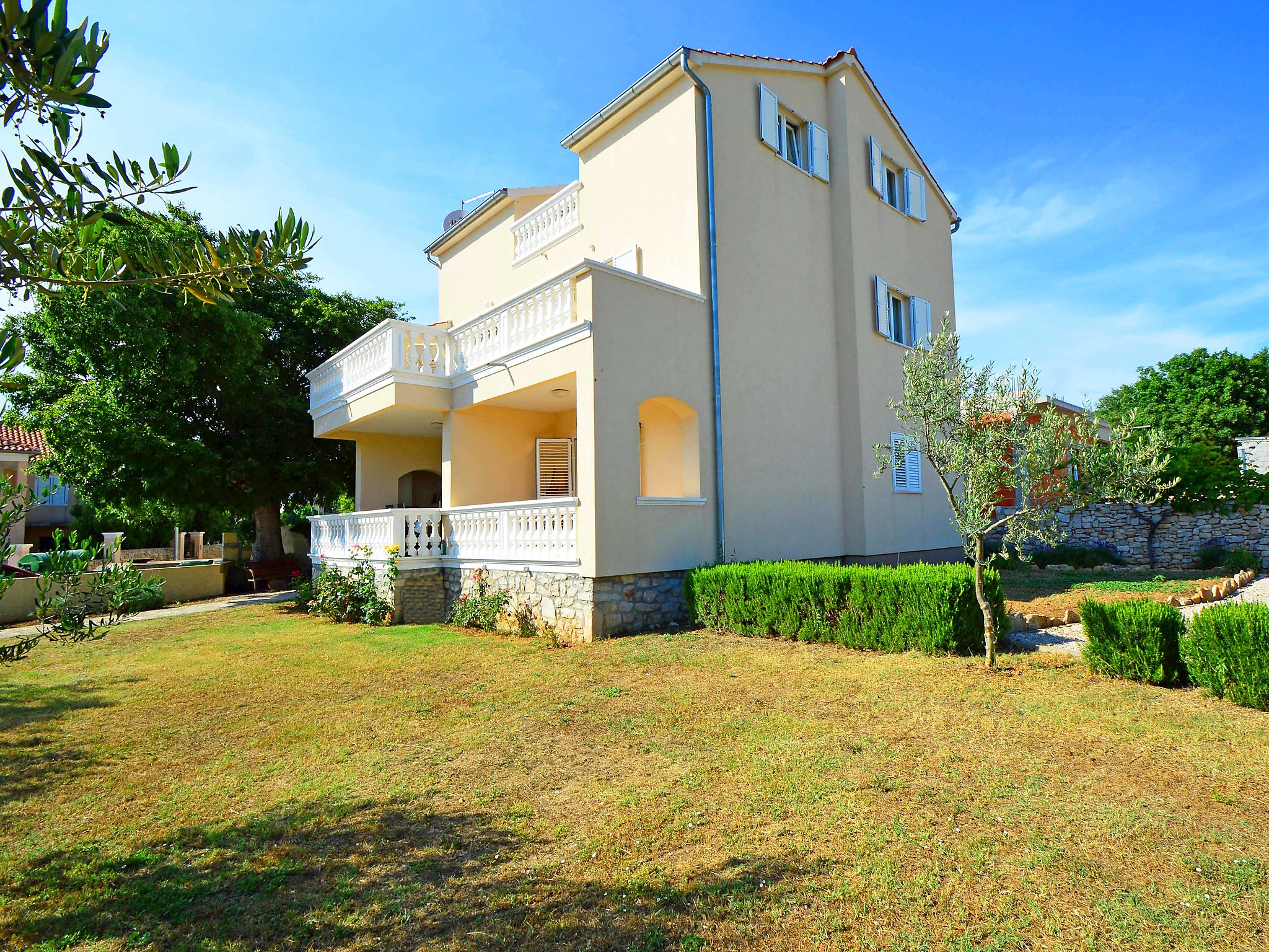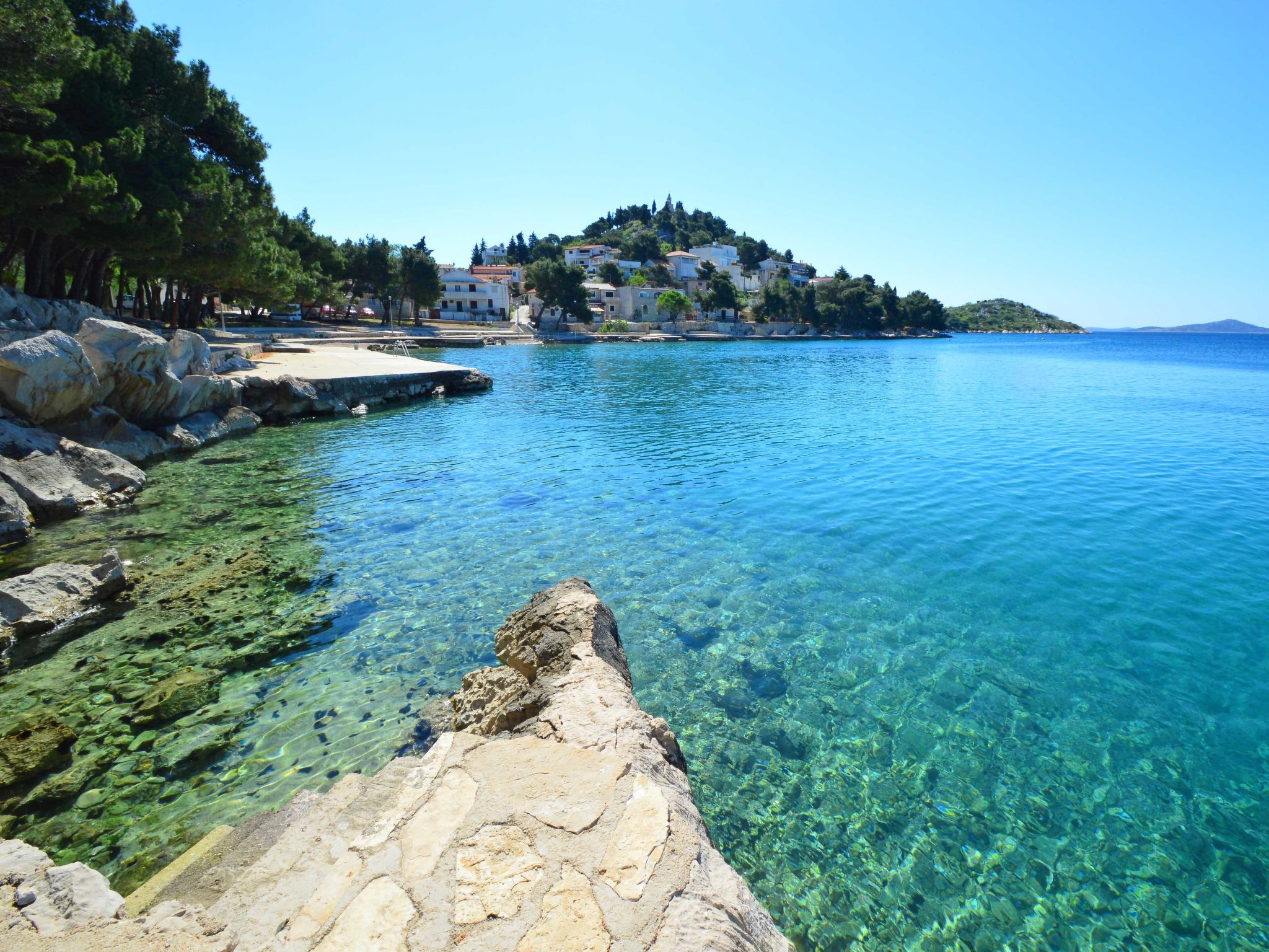 Sovlje 5 km von Vodice: Dreifamilienhaus "Cvita". Ruhige, sonnige, erhöhte Lage, 300 m vom Meer, 300 m vom Strand. Zur Mitbenutzung: Grundstück 680 m2 (eingezäunt). Gartenmöbel, Grill, Kinderspielplatz (Schaukel, Sandkasten). Im Hause: Internetzugang. Parkplatz beim Haus auf dem Grundstück. Einkaufsgeschäft 1.5 km, Restaurant, Café 80 m, Kieselstrand, betonierter Strand 300 m.