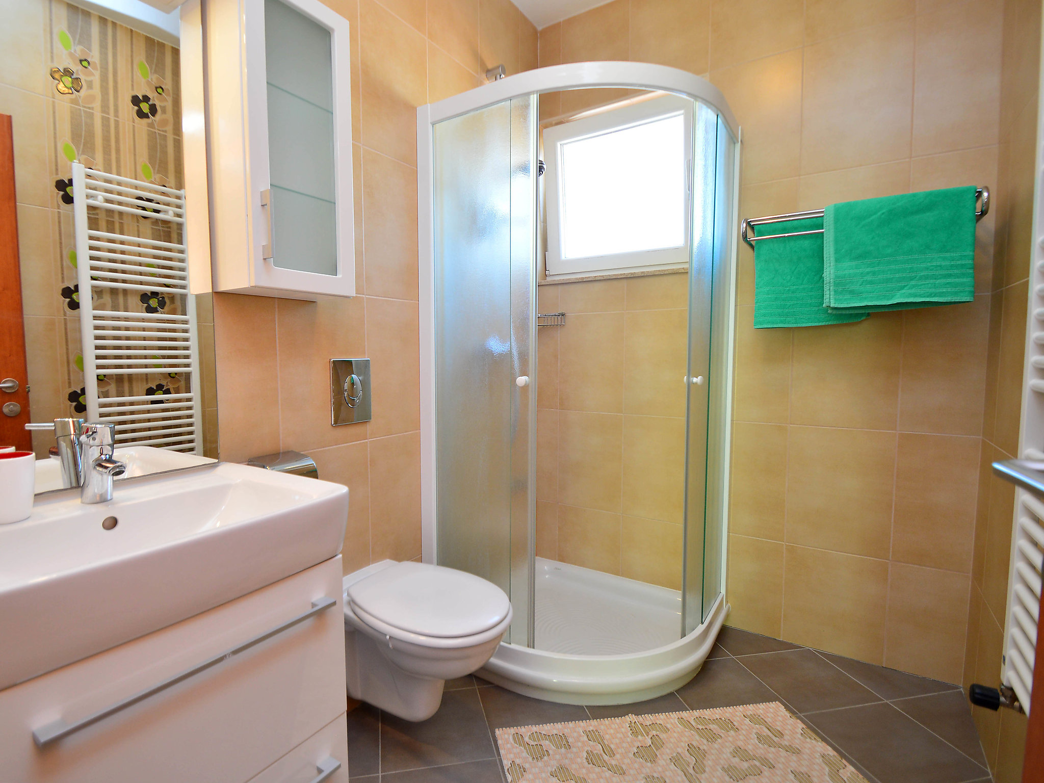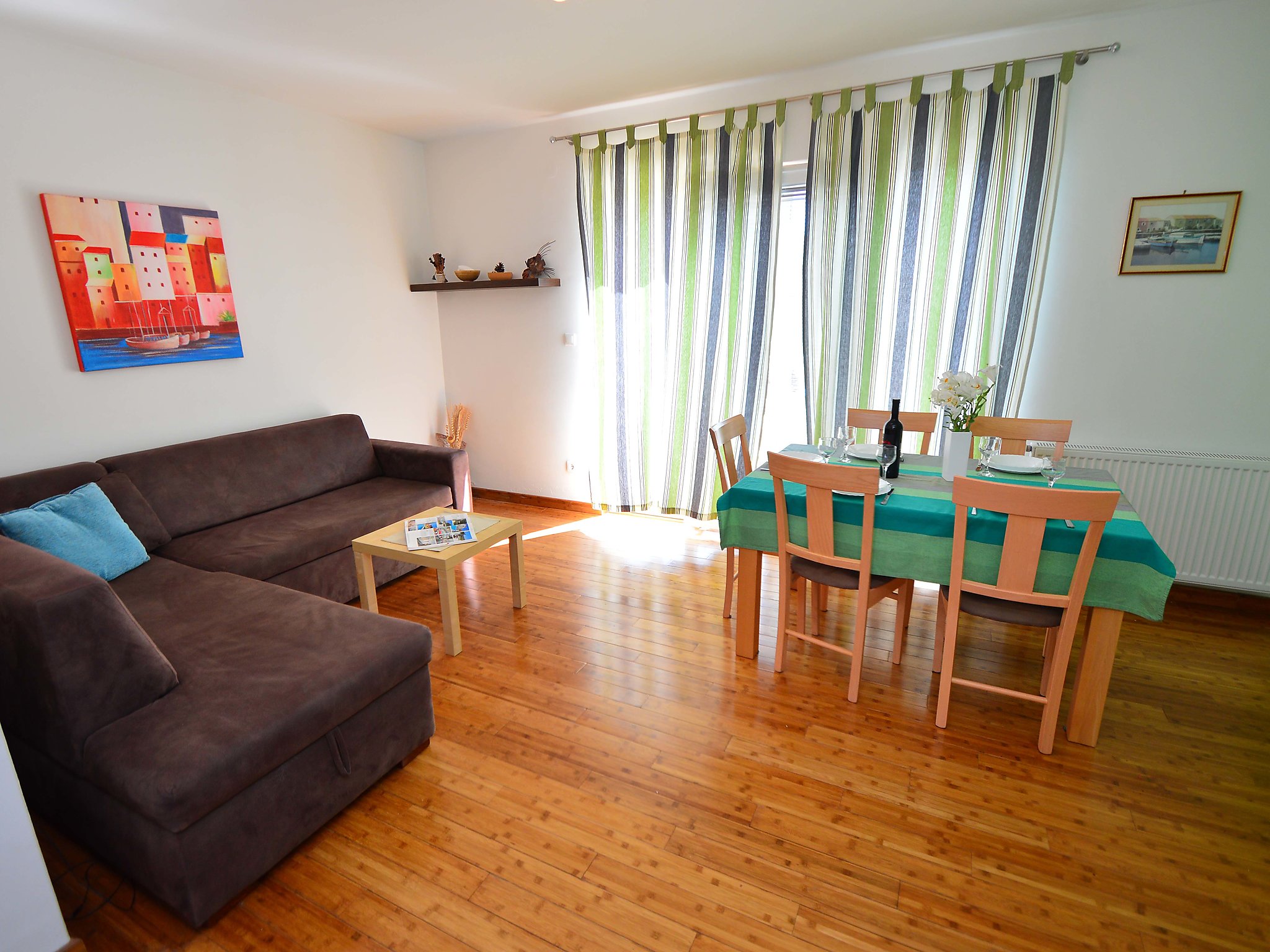 3-Zimmer-Wohnung 65 m2 im 1. Stock. Modern und gemütlich eingerichtet: Wohn-/Esszimmer mit 1 Diwanbett, Sat-TV, Flachbildschirm, DVD und Klimaanlage. Ausgang zur Terrasse. 1 Zimmer mit 1 franz. Bett (160 cm, Länge 200 cm). Ausgang zur Terrasse. 1 Zimmer mit 2 Betten (90 cm, Länge 200 cm). Offene Küche (Backofen, Geschirrspüler, 4 Glaskeramikherd Platten, Tiefkühler). 2 Duschen/WC. Klimaanlage (extra). Grosse Terrasse 23 m2. Terrassenmöbel, Liegestühle (2). Zur Verfügung: Waschmaschine, Safe. Internet (Wireless LAN, gratis).