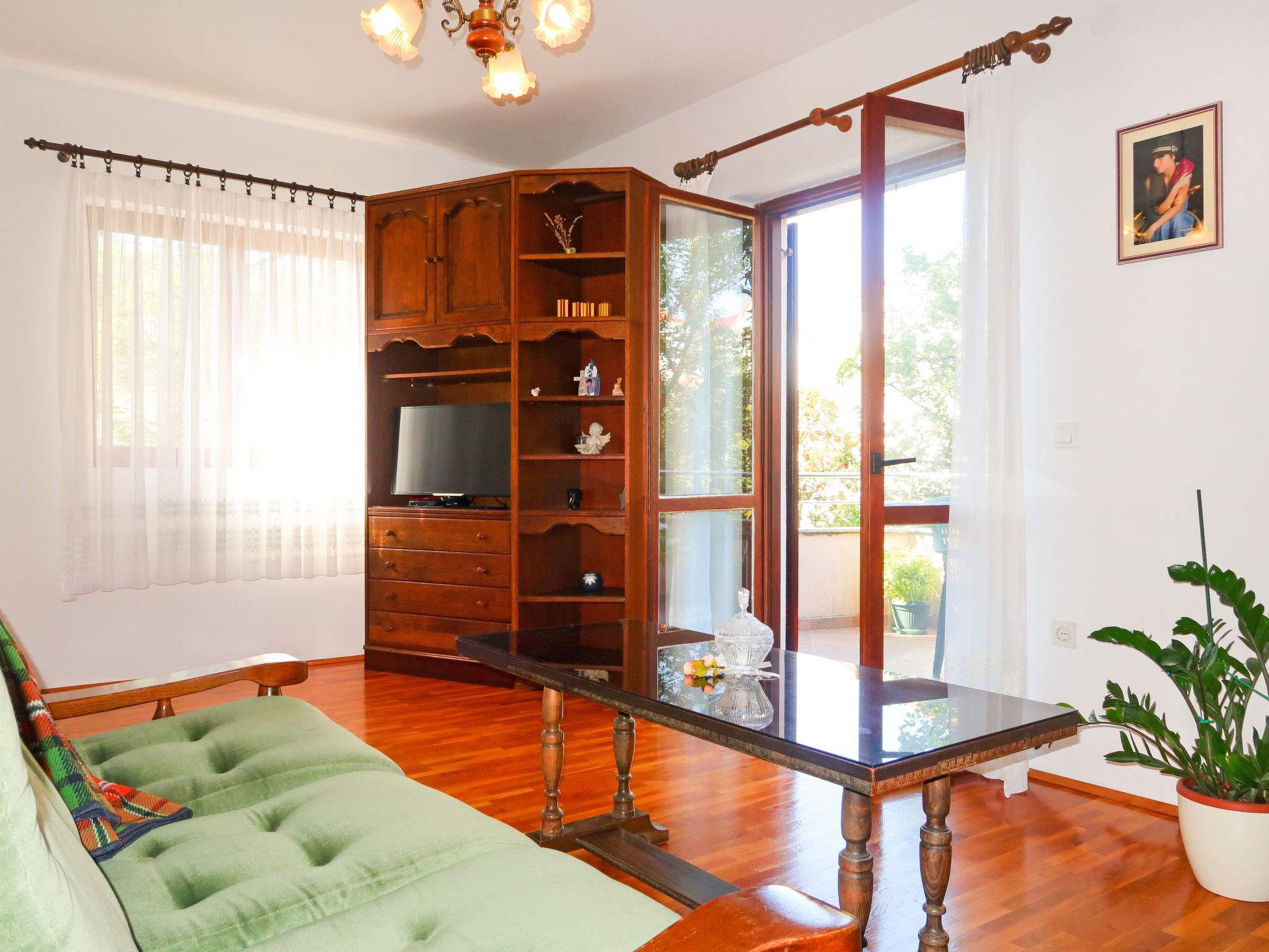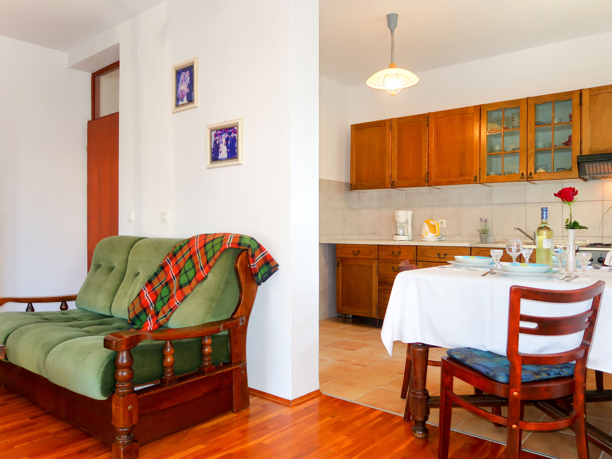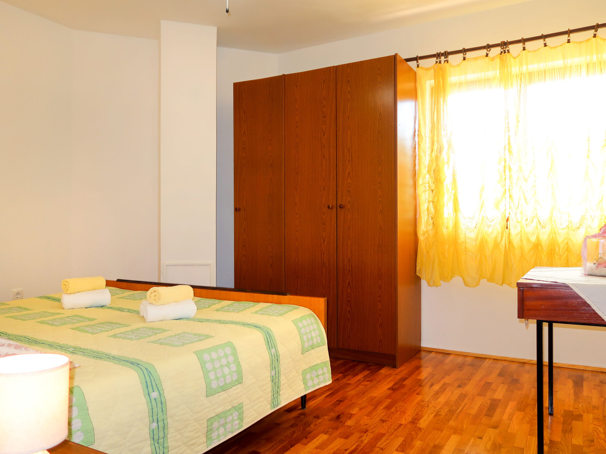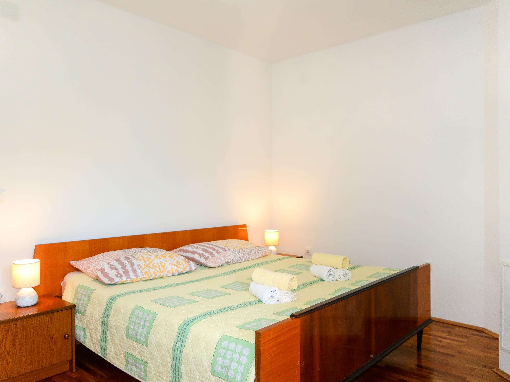 "Vera (MLK326)", 2-Zimmer-Wohnung 40 m2, im Erdgeschoss. Wohn-/Schlafzimmer mit 1 Ausziehbett (Länge 190 cm), Sat-TV. Ausgang zur Terrasse. 1 Zimmer mit 1 Doppelbett (2 x 90 cm, Länge 190 cm). Esszimmer. Offene Küche (1 Kochplatte, Backofen, 3 Flammen, Toaster, Wasserkocher, Mikrowelle, Tiefkühler, elektrische Kaffeemaschine). Dusche/WC. Terrasse. Terrassenmöbel, Liegestühle (2). Zur Verfügung: Haartrockner. Internet (Wireless LAN, gratis). Bitte beachten: Nichtraucher-Haus.