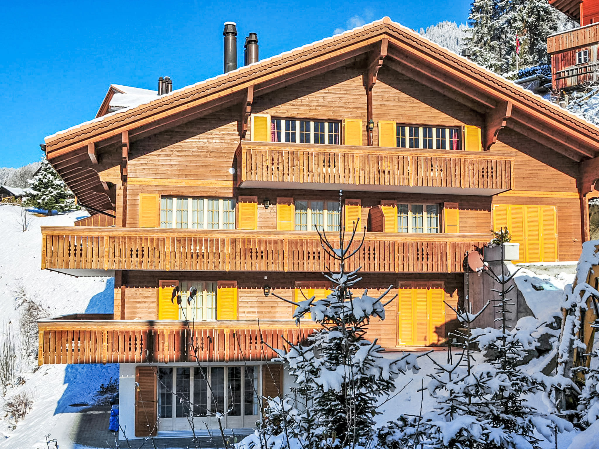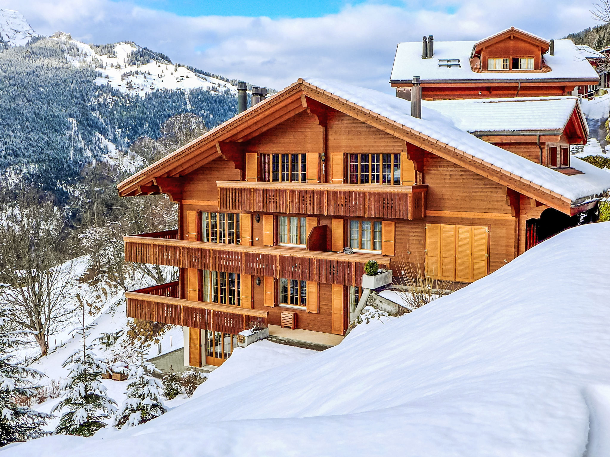Appartementhaus "Panorama", Baujahr 2003. Unterhalb von Wengen, 800 m vom Zentrum, ruhige, sonnige Lage am Hang. Im Hause: Zentralheizung. Einkaufsservice vor Anreise möglich. Zufahrt bis 30 m zum Haus. Treppenweg (20 Stufen) bis zum Haus. Einkaufsgeschäft, Supermarkt 800 m, Restaurant 500 m, Bar 800 m, Zentrum zu Fuss in 15 Minuten erreichbar, Bahnstation "Wengen" 800 m, Freibad 1.3 km. Luftseilbahn, Skisportanlagen 800 m, Kinderspielplatz 500 m. Bitte beachten: autofreie Ferienanlage. Die Anreise erfolgt mit der Bergbahn. In diesem Haus sind weitere Ferienwohnungen mietbar. Anreise ist nur mit dem Zug ab Lauterbrunnen möglich – 14 Min. Fahrzeit.