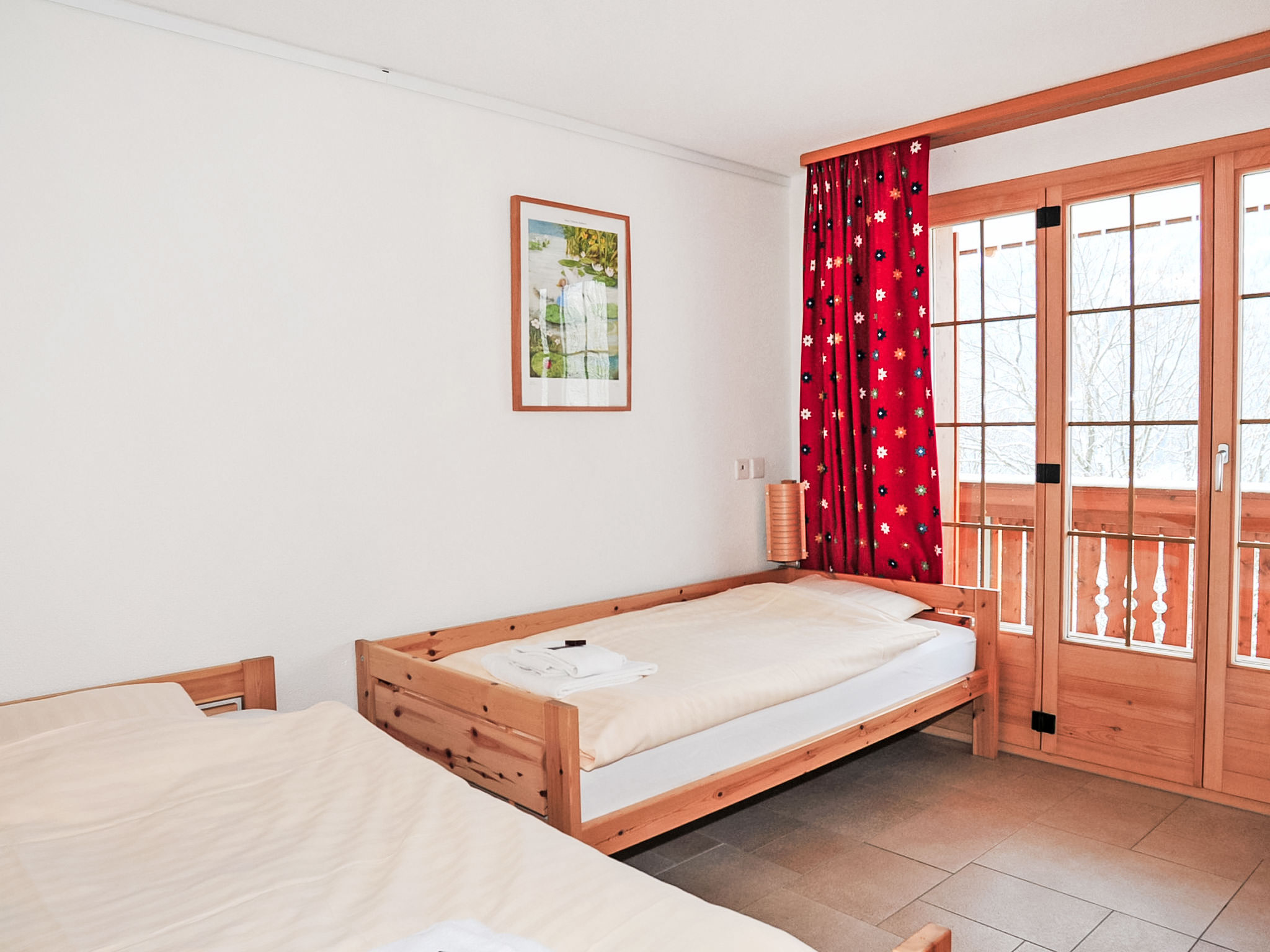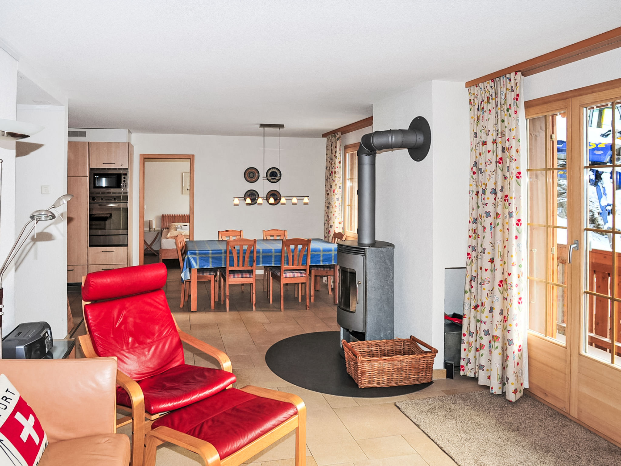 "Apt. P", 4-Zimmer-Wohnung 100 m2 im 1. Stock. Hell, modern und geschmackvoll eingerichtet: Wohn-/Esszimmer mit Schwedenofen, Esstisch, Sat-TV, Radio, CD und DVD. Ausgang zum Balkon. 2 Zimmer, jedes Zimmer mit 1 Doppelbett (2 x 90 cm, Länge 200 cm). 1 Zimmer mit 2 Betten (90 cm, Länge 200 cm). Offene Küche (Backofen, Geschirrspüler, 4 Induktionskochplatten, Toaster, Wasserkocher, Mikrowelle, elektrische Kaffeemaschine, Kapseln für die Kaffeemaschine (Nespresso) extra, Fondue Set (Käse)). Dusche/WC, Bad/Dusche/WC. Grosser Balkon. Balkonmöbel. Sehr schöne Sicht auf die Berge und das Tal. Zur Verfügung: Bügeleisen, Haartrockner, Holz (extra). Internet (Wireless LAN, gratis). Bitte beachten: Nichtraucher-Unterkunft.