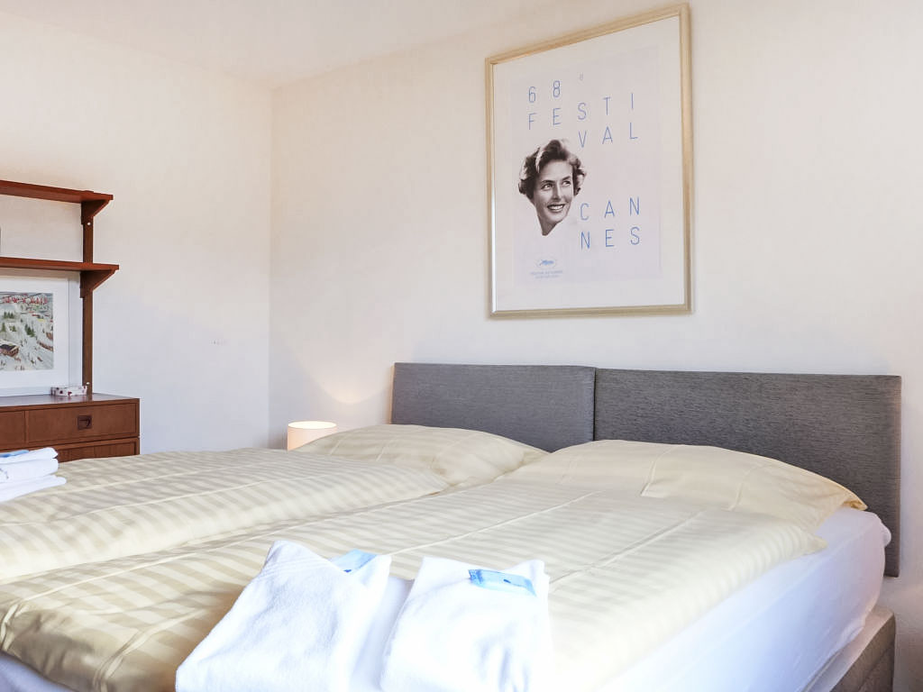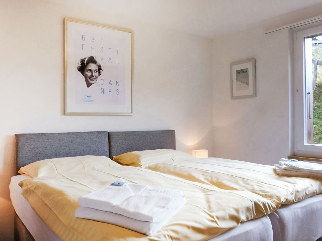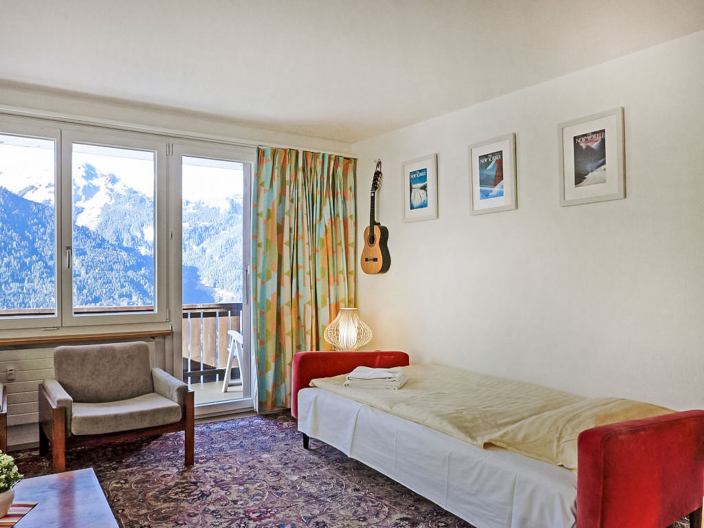 "Apt. R", 3-Zimmer-Wohnung 69 m2 im 1. Stock. Komfortabel und gemütlich eingerichtet: Wohn-/Esszimmer mit 1 Diwanbett (120 cm, Länge 200 cm), Kabel-TV. Ausgang zum Balkon. 1 Zimmer mit 1 Doppelbett (180 cm, Länge 200 cm). 1 Zimmer mit 1 franz. Bett (140 cm, Länge 200 cm). Offene Küche (4 Kochplatten, Backofen, Toaster, Wasserkocher, elektrische Kaffeemaschine, Kapseln für die Kaffeemaschine (Nespresso) extra, Fondue Set (Käse)). Bad/WC, Doppelwaschbecken. Balkon, Westlage. Balkonmöbel. Herrliche Panoramasicht auf die Berge und die Skipiste. Zur Verfügung: Haartrockner. Internet (Wireless LAN, gratis). Bitte beachten: geeignet für Familien. Nichtraucher-Unterkunft.
