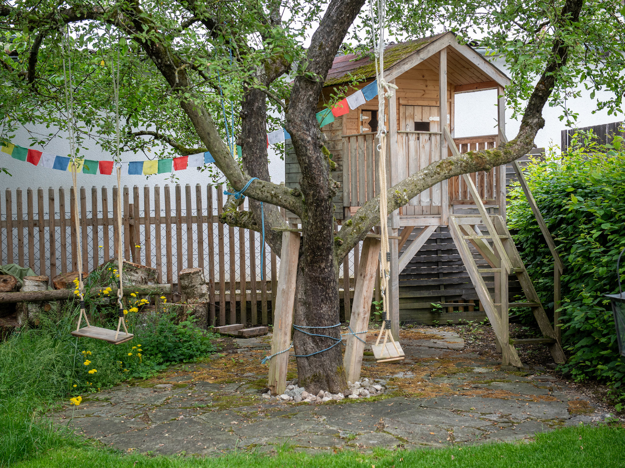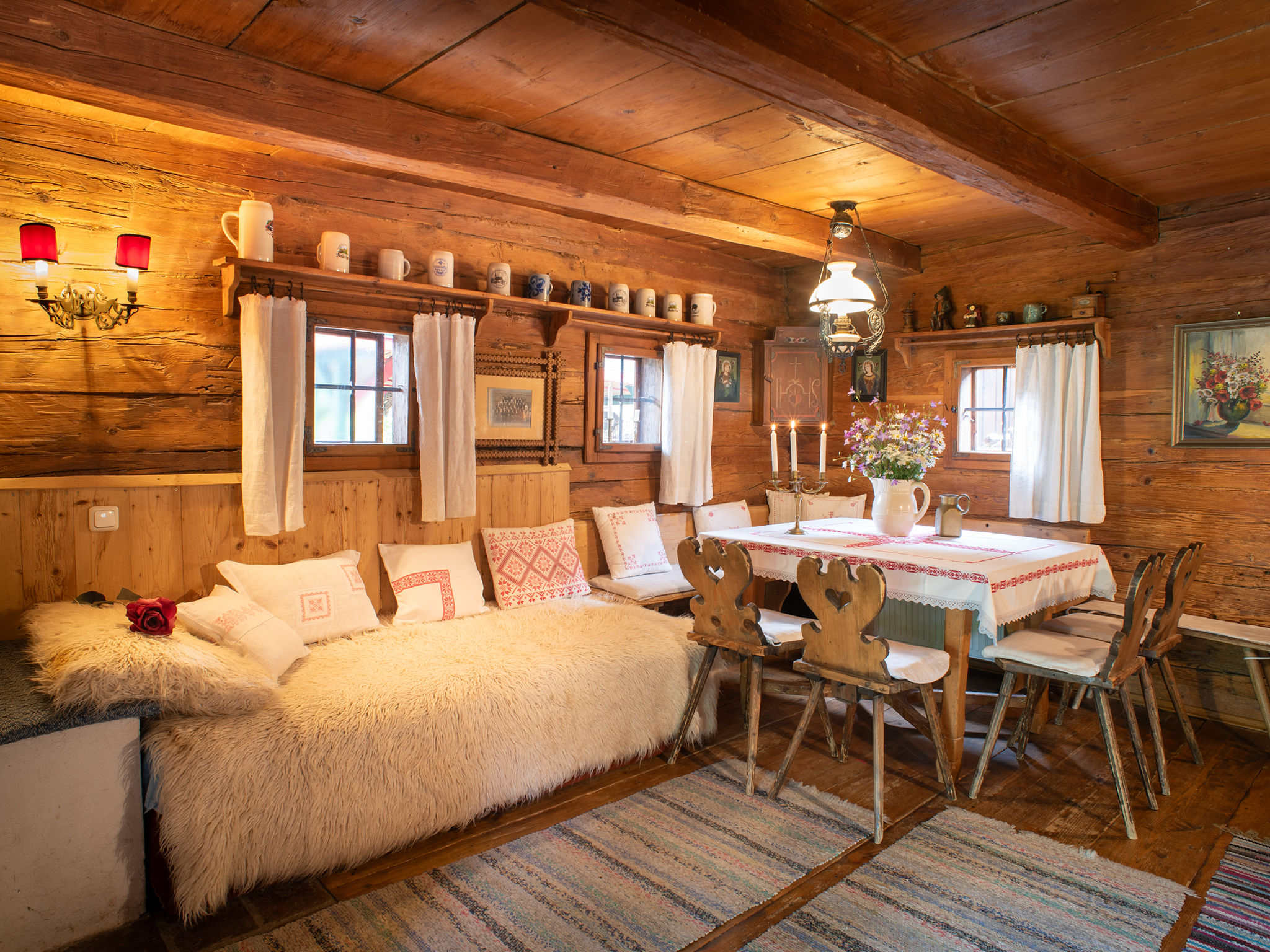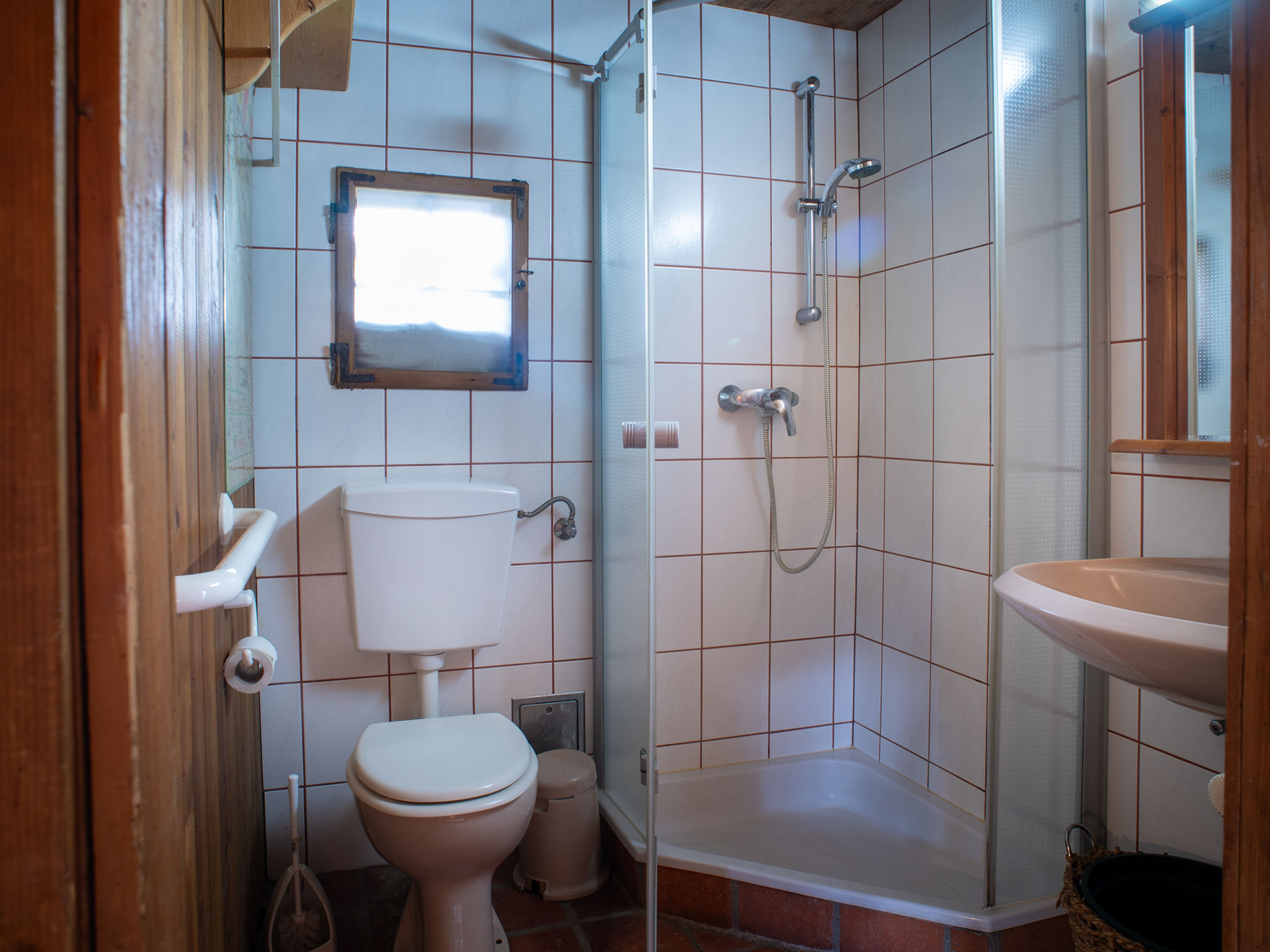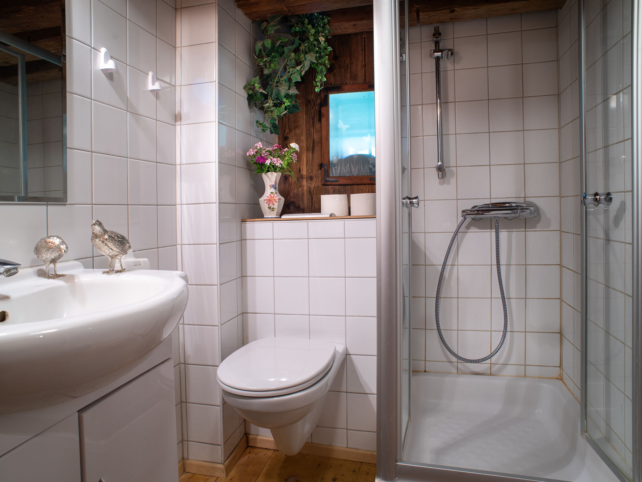 4-Zimmer-Chalet 120 m2 auf 3 Stockwerken. Rustikal und gemütlich eingerichtet: Wohn-/Esszimmer mit 1 Diwanbett, Essecke, Sat-TV, Video, Radio und Kachelofen. Ausgang zum Gartensitzplatz. Kleine, offene Küche (4 Kochplatten, Backofen, Mikrowelle). Dusche/WC. Obergeschoss: (Aussentreppe) 2 Zimmer, jedes Zimmer mit 1 Diwanbett, 1 Doppelbett und Sat-TV. Dusche/WC. Dachgeschoss: (Aussentreppe) 1 Zimmer mit 1 Diwanbett, 1 Doppelbett, Waschbecken, sep. WC und Sat-TV. Balkon, Gartensitzplatz. Terrassenmöbel, Liegestühle. Schöne Sicht auf die Landschaft. Maximal 2 Haustiere/Hunde erlaubt. Bitte Beachten: Steile Aussentreppen. Durch den Erhalt des originalen Hauscharakters sind die Eingangstüren und die Raumhöhen niedrig.