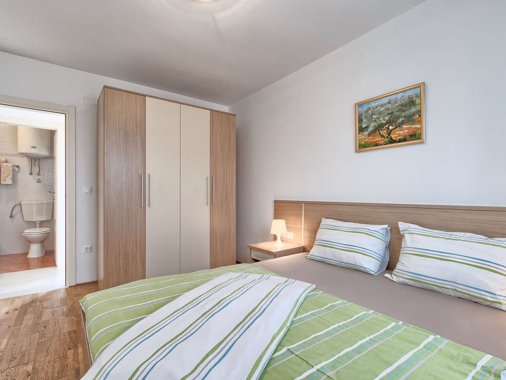 3-Zimmer-Wohnung 52 m2 im 1. Stock. Wohn-/Esszimmer mit 1 Doppeldiwanbett und Sat-TV (Flachbildschirm), Klimaanlage. Ausgang zur Terrasse. 2 Zimmer, jedes Zimmer mit 1 Doppelbett (2 x 80 cm, Länge 200 cm). Offene Küche (2 Glaskeramikherd Platten, Mikrowelle, Tiefkühler). Dusche/WC. Terrasse 6 m2. Terrassenmöbel. Sicht auf den Garten. Zur Verfügung: Internet (Wireless LAN, gratis).