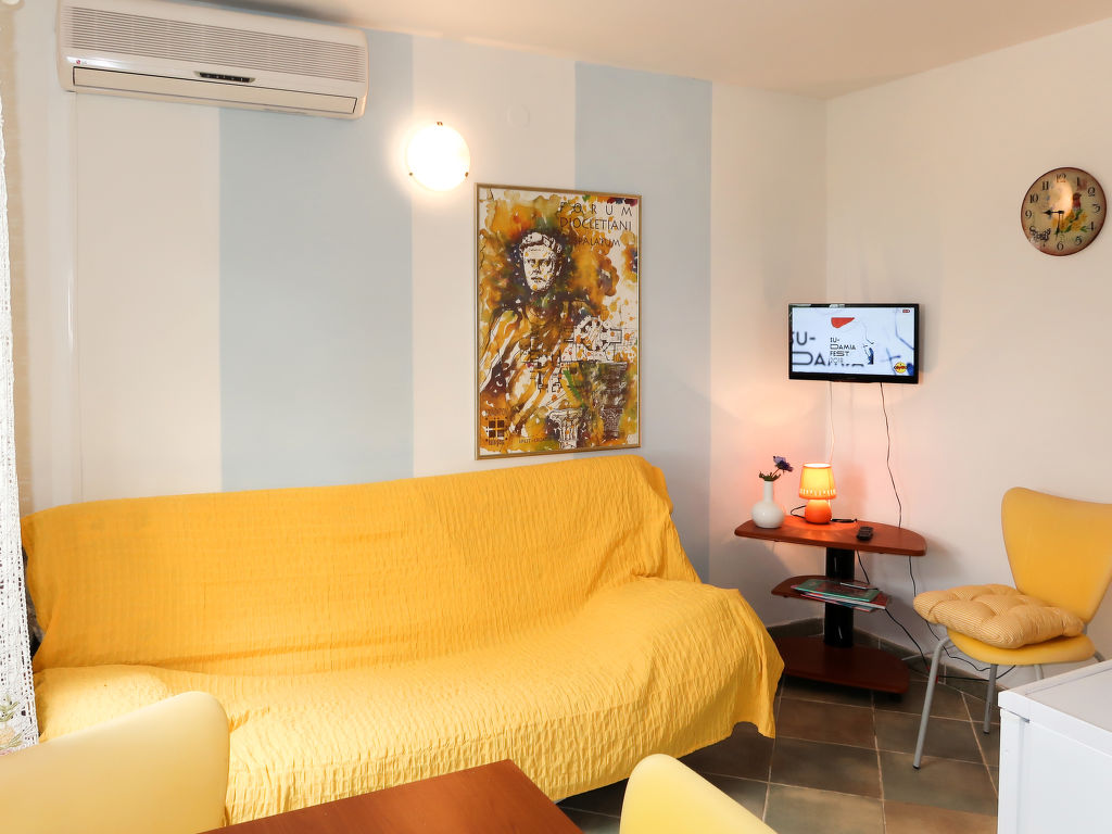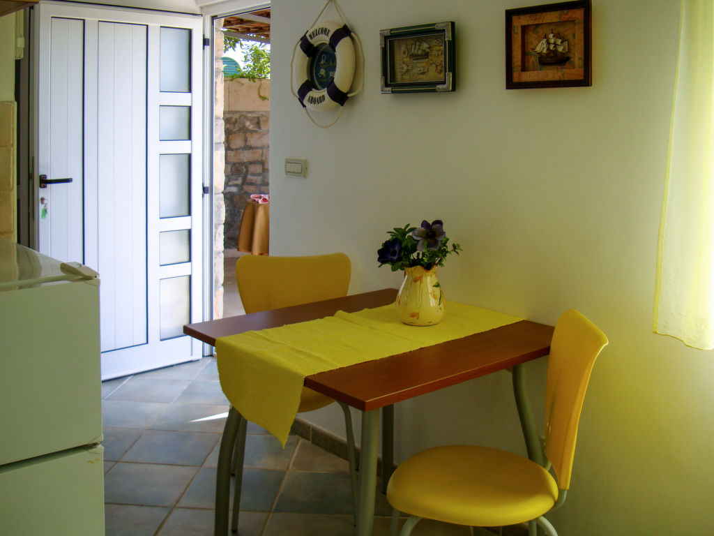 2-Zimmer-Haus 33 m2. Wohn-/Esszimmer mit 1 Doppeldiwanbett und Sat-TV (Flachbildschirm), Klimaanlage. 1 Zimmer mit 1 franz. Bett (160 cm). Offene Küche (2 Kochplatten, Toaster, Wasserkocher, Tiefkühler, elektrische Kaffeemaschine). Dusche/WC. Terrasse teilweise überdacht. Terrassenmöbel, Gartengrill (mobil), Liegestühle (2). Schöne Sicht auf das Meer. Zur Verfügung: Internet (Wireless LAN, gratis). Bitte beachten: Nichtraucher-Haus. Maximal 1 kleines Haustier/Hund erlaubt. Max. Belegung: 2 Erwachsene, 2 Kinder bis 12 Jahre.
