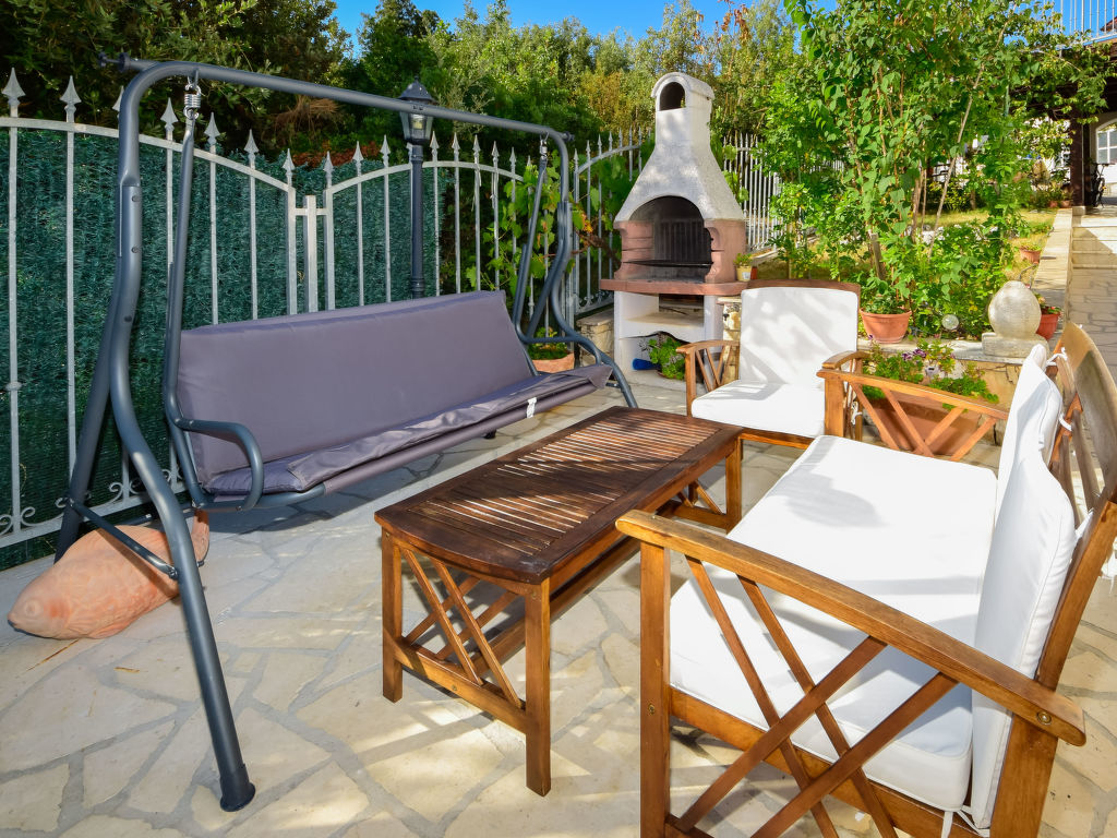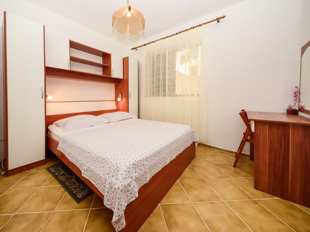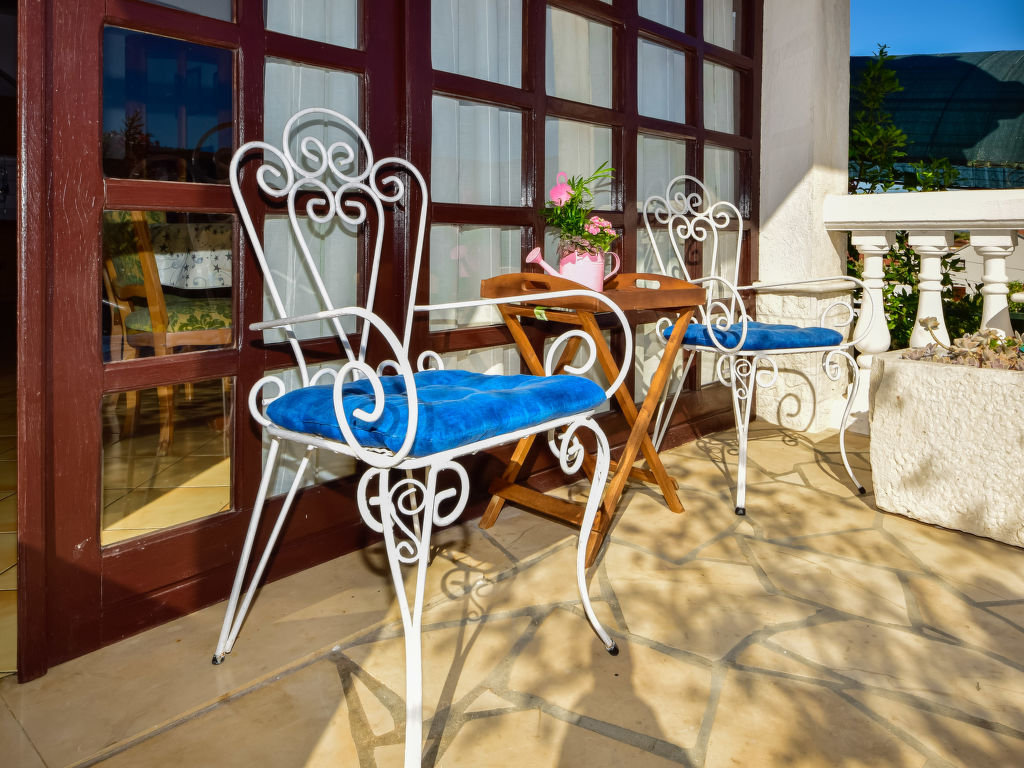 3-Zimmer-Wohnung 70 m2, im Erdgeschoss, Südlage. Wohnzimmer mit 1 Diwanbett und Sat-TV (Flachbildschirm), Klimaanlage. 2 Zimmer, jedes Zimmer mit 1 franz. Bett (160 cm, Länge 200 cm). Esszimmer. Ausgang zur Terrasse. Offene Küche (4 Kochplatten, Backofen, Geschirrspüler, Mikrowelle, Tiefkühler, elektrische Kaffeemaschine). Bad/WC. Terrasse 10 m2. Terrassenmöbel. Zur Verfügung: Waschmaschine, Kinderhochstuhl, Babybett. Internet (Wireless LAN, gratis). 1 Haustier/Hund erlaubt.