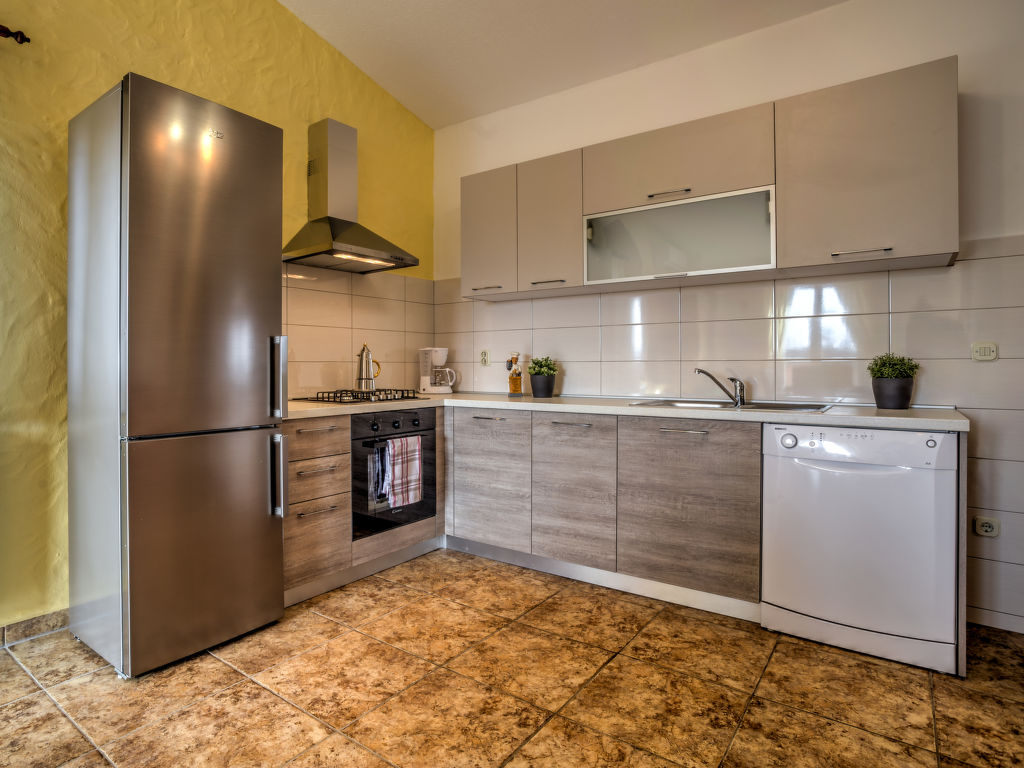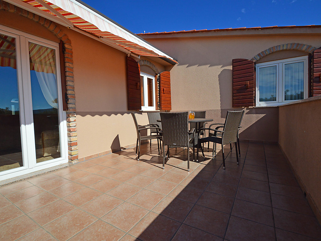 5-Zimmer-Wohnung 120 m2 im 1. Stock. Wohnzimmer mit Sat-TV und Klimaanlage. 1 Zimmer mit 2 Betten (90 cm, Länge 200 cm). 1 Zimmer mit 1 franz. Bett (160 cm, Länge 200 cm). 1 Zimmer mit 2 Betten (90 cm, Länge 200 cm), Dusche/WC. 1 Zimmer mit 2 Betten (90 cm, Länge 200 cm). Esszimmer mit Sat-TV und Klimaanlage. Ausgang zur Terrasse. Offene Küche (4 Kochplatten, Backofen, Geschirrspüler, Tiefkühler, elektrische Kaffeemaschine). Dusche/WC, Dusche/Bidet/WC. Terrasse 20 m2, überdacht Terrasse 20 m2. Terrassenmöbel. Sicht auf das Schwimmbad. Zur Verfügung: Waschmaschine, Haartrockner. Internet (Wireless LAN, gratis). Die Ferienwohnung besteht aus zwei Wohnungen im ersten Stock, vermietet als eine Einheit. Eine Ferienwohnung mit Esszimmer, offener Küche und 1 Zimmer mit 2 Betten. Die andere Ferienwohnung mit Wohnzimmer und 3 Schlafzimmern.