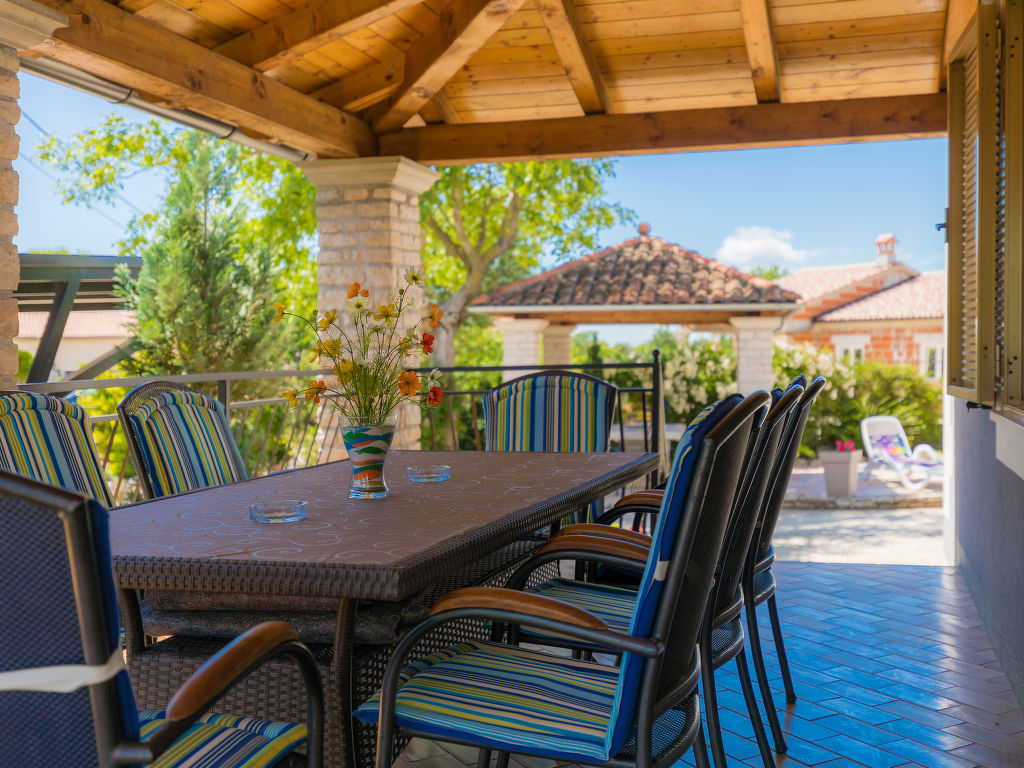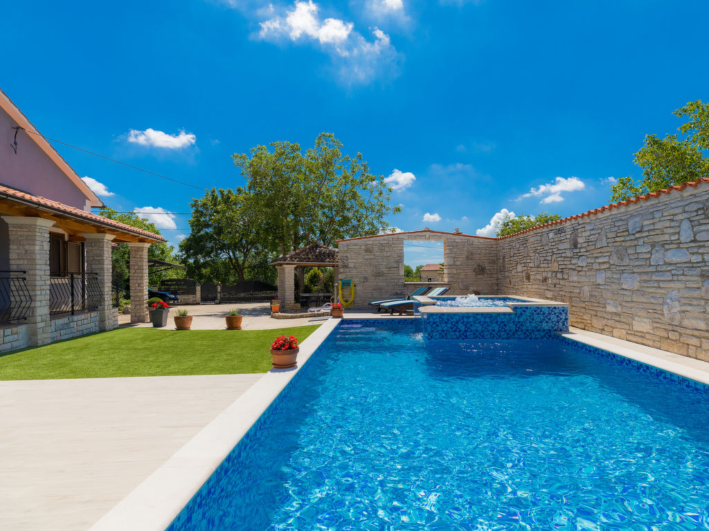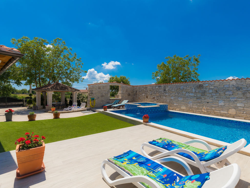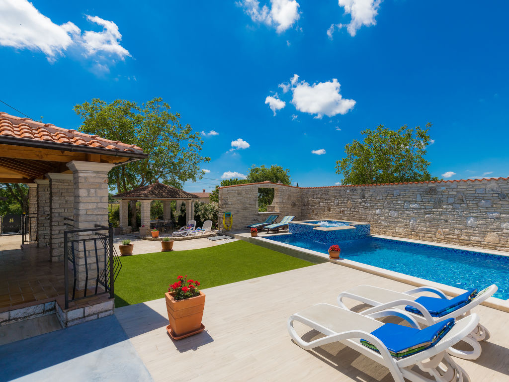 Schönes Einfamilienhaus "Begonija". Im Weiler Marići, ausserhalb des Ortes, 1 km vom Zentrum von Kanfanar, ruhige, sonnige Lage, 20 km vom Meer, 20 km vom Strand, im Grünen. Zur Alleinbenutzung: Grundstück 1'000 m2 (eingezäunt), schöner Garten mit Rasen und Blumen, Schwimmbad eckig (8 x 4 m, 140 cm tief, 20.04.-15.10.) mit Innentreppe. WC im Poolbereich, Aussendusche, Tischtennis, Laube (20 m2), Grill. Im Hause: Internetzugang. Zur Verfügung: Fahrräder (6). Parkplatz beim Haus auf dem Grundstück. Einkaufsgeschäft 800 m, Kieselstrand 20 km. Sportzentrum 20 km. Schwimmbad mit Hydromassage.