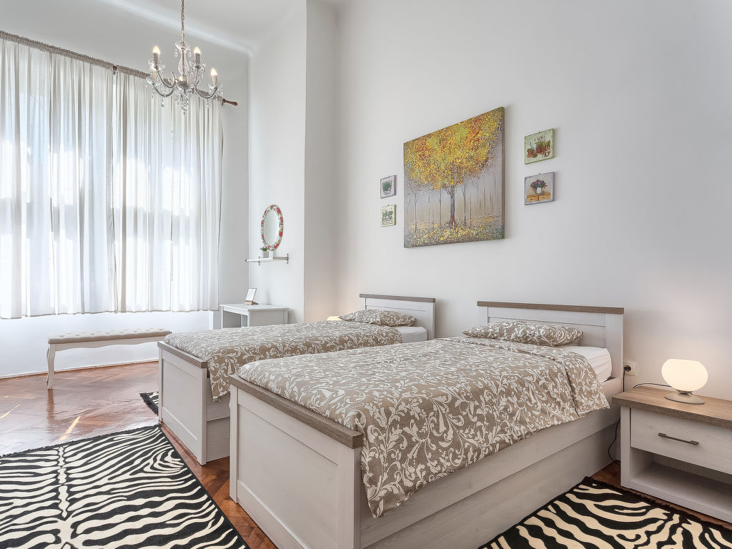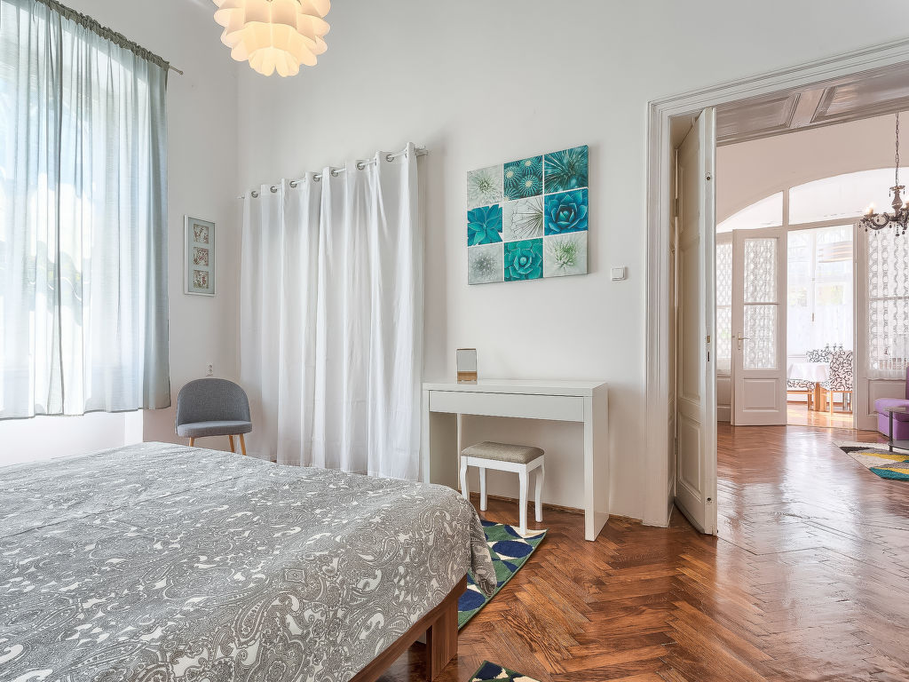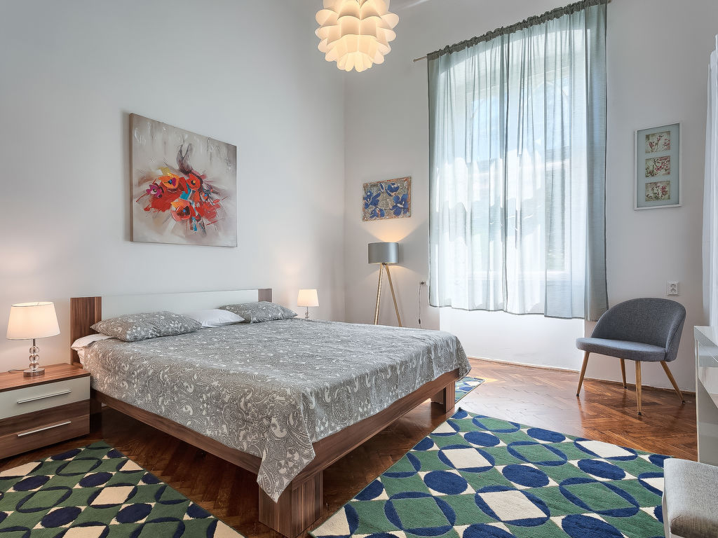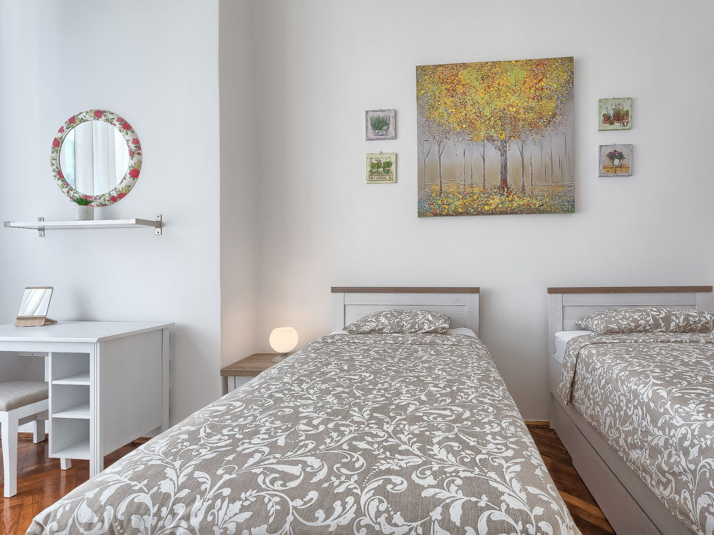"Silvia", 3-Zimmer-Wohnung 80 m2, im erhöhten Erdgeschoss. Schön und geschmackvoll eingerichtet: Wohnzimmer mit Sat-TV (Flachbildschirm), Klimaanlage. 1 Zimmer mit 1 Doppelbett (2 x 90 cm, Länge 200 cm). 1 Zimmer mit 2 Betten (90 cm, Länge 200 cm). Esszimmer. Ausgang zur Terrasse. Offene Küche (Backofen, 4 Glaskeramikherd Platten, Mikrowelle, Tiefkühler). Dusche/WC. Terrasse 5 m2, überdacht. Terrassenmöbel, Gartengrill (mobil). Sicht auf den Garten. Zur Verfügung: Waschmaschine, Kinderhochstuhl, Babybett. Internet (Wireless LAN, gratis). Bitte beachten: Rauchmelder.