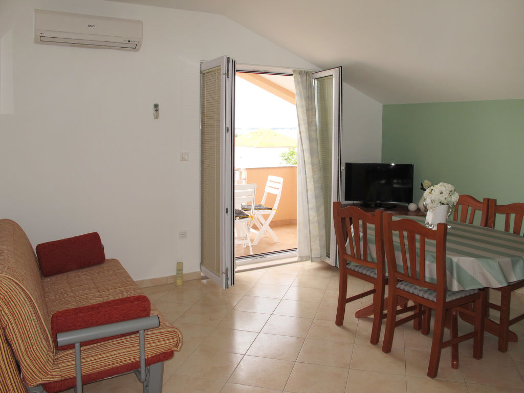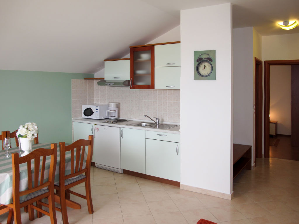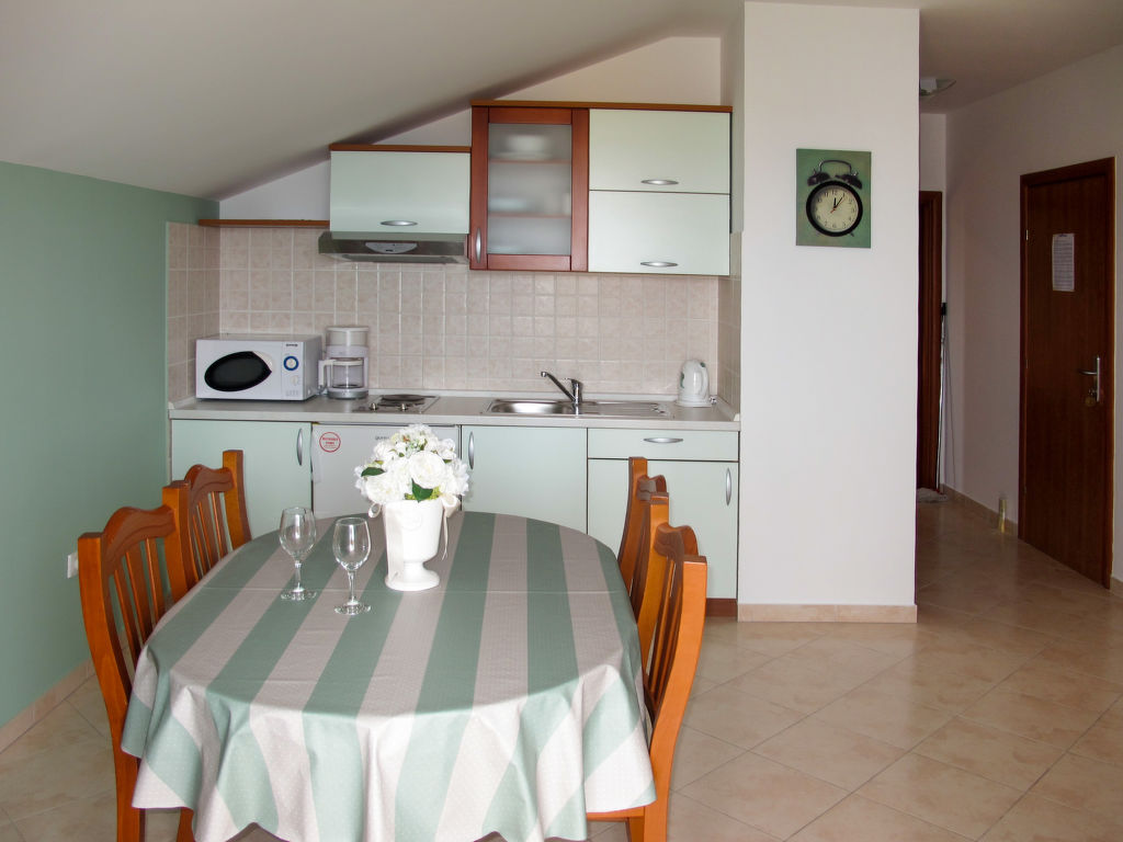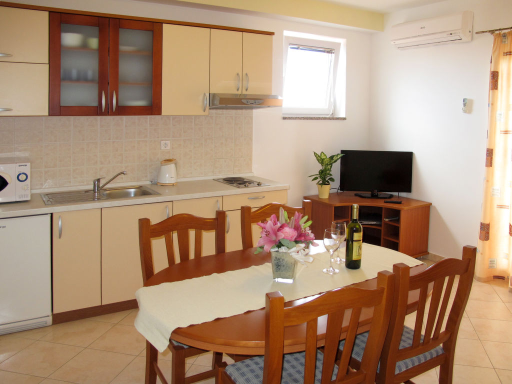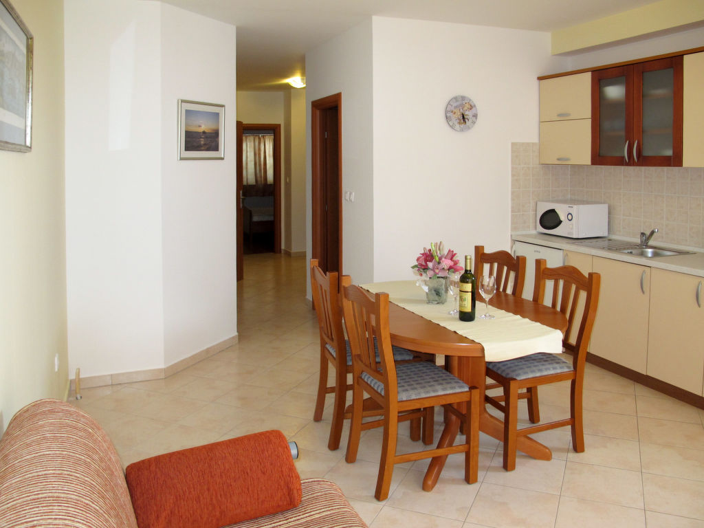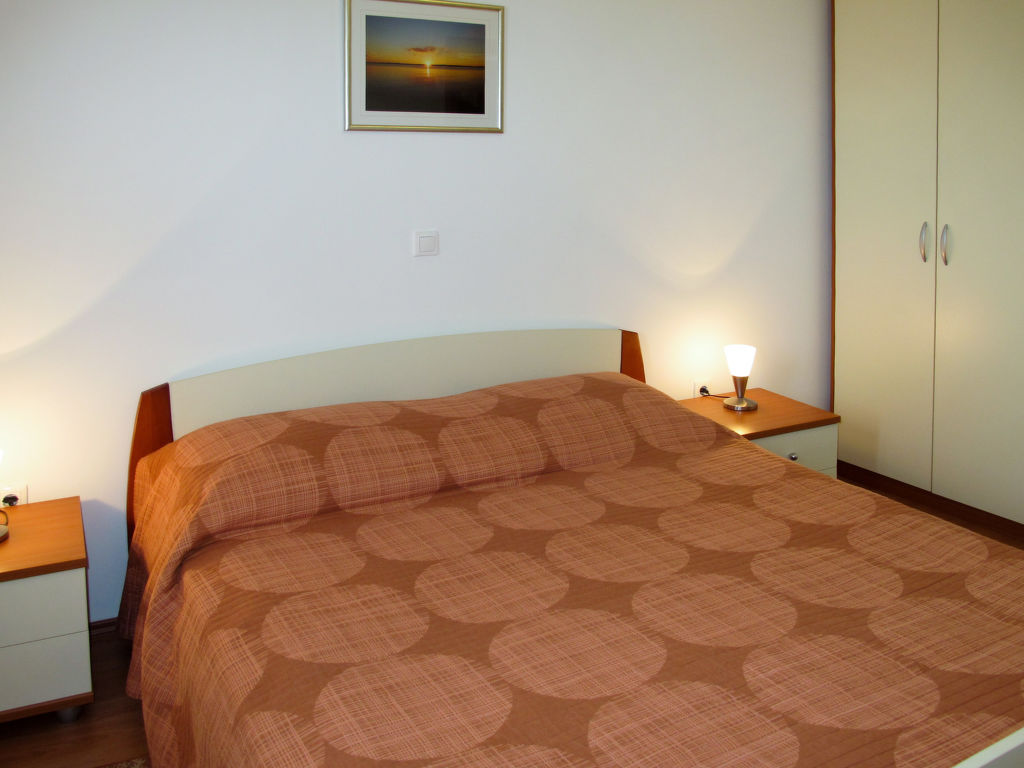 "Irena (NIN150)", 2-Zimmer-Wohnung 40 m2 im 2. Stock. Abgeschrägtes Wohn-/Esszimmer mit 1 Doppeldiwanbett, Sat-TV und Klimaanlage. Ausgang zum Balkon. 1 Zimmer mit 1 franz. Bett (160 cm, Länge 200 cm). Abgeschrägte, offene Küche (2 Kochplatten, Geschirrspüler, Toaster, Wasserkocher, Mikrowelle, elektrische Kaffeemaschine). Dusche/WC. Balkon 5 m2. Balkonmöbel. Sicht auf das Meer. Zur Verfügung: Internet (Wireless LAN, gratis). Bitte beachten: Nichtraucher-Haus.