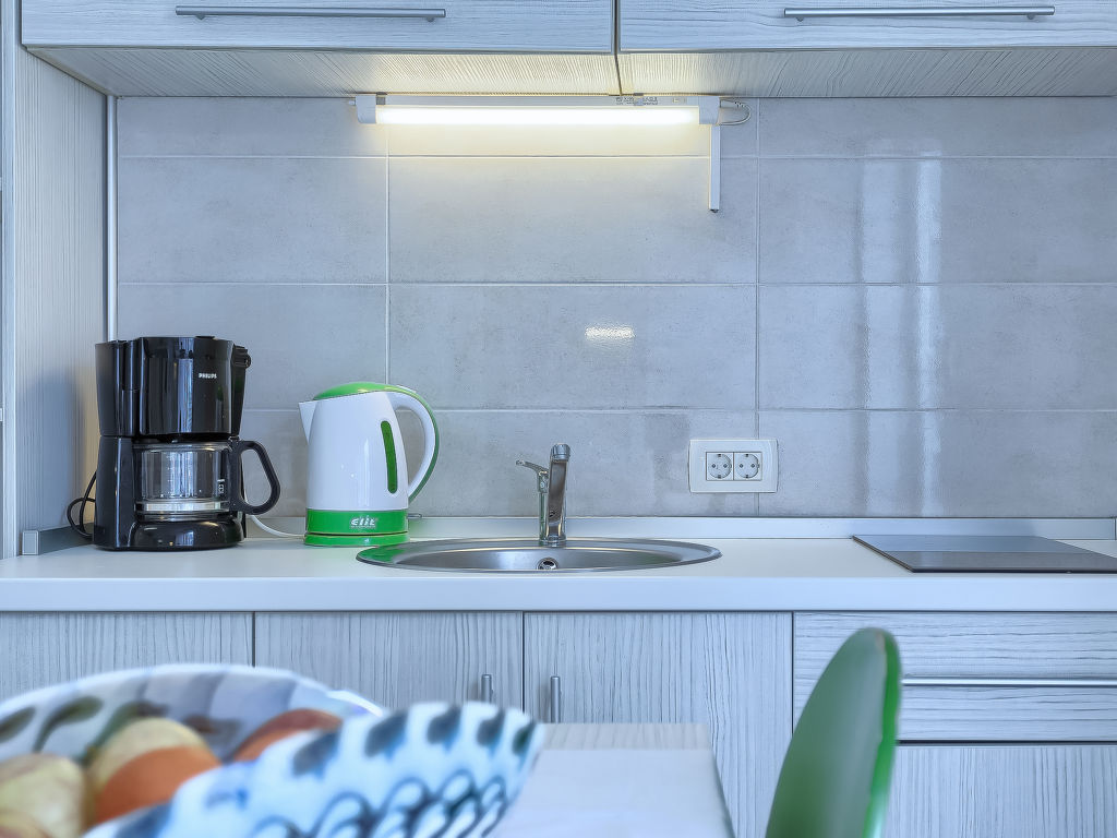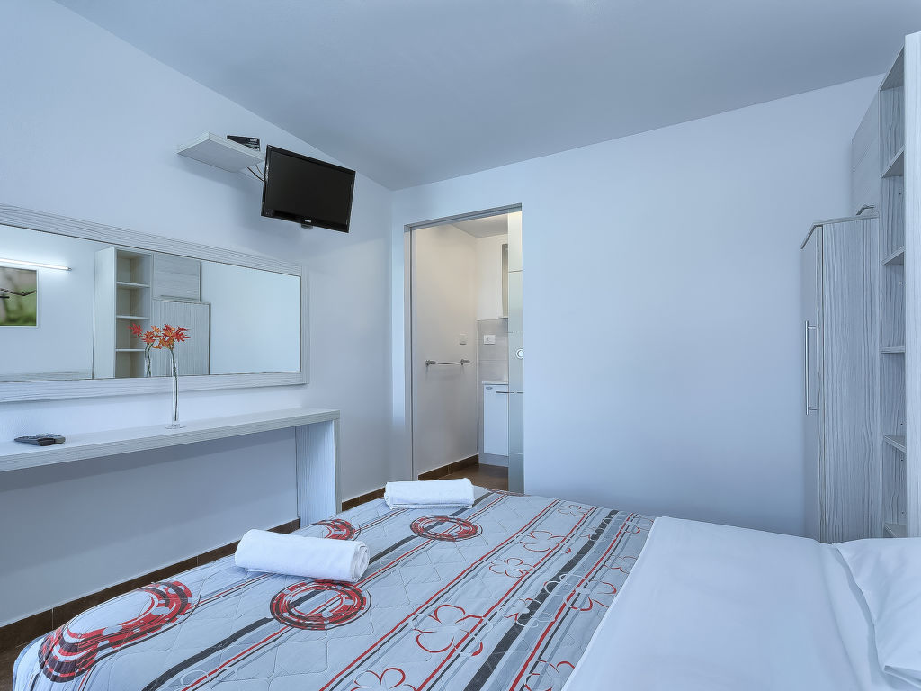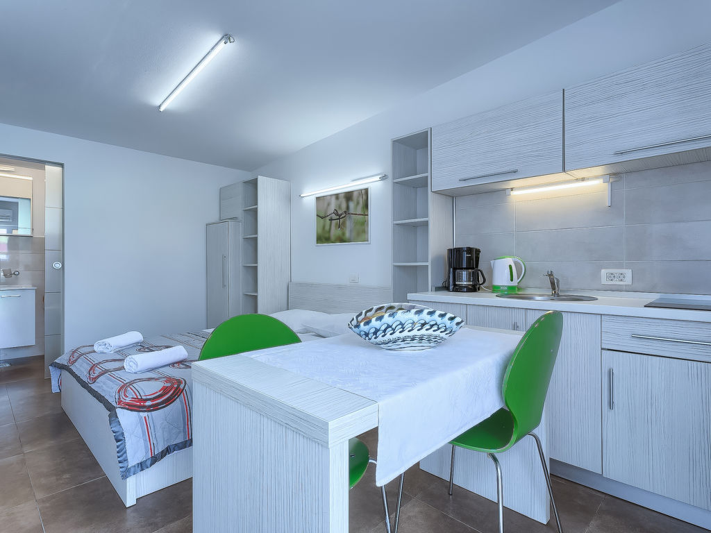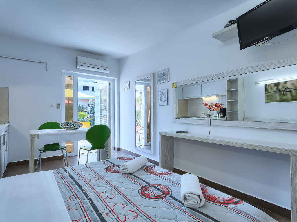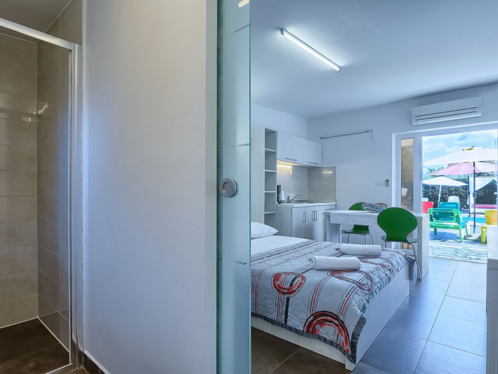 1-Zimmer-Wohnung 18 m2, im Erdgeschoss. Studio mit 1 franz. Bett (160 cm, Länge 200 cm), Sat-TV (Flachbildschirm), Klimaanlage. Ausgang zur Terrasse, zum Schwimmbad. Offene Küche (2 Glaskeramikherd Platten, Mikrowelle) mit Esstisch. Dusche/WC. Terrasse 6 m2, überdacht. Terrassenmöbel. Sicht auf das Schwimmbad. Zur Verfügung: Internet (Wireless LAN, gratis).