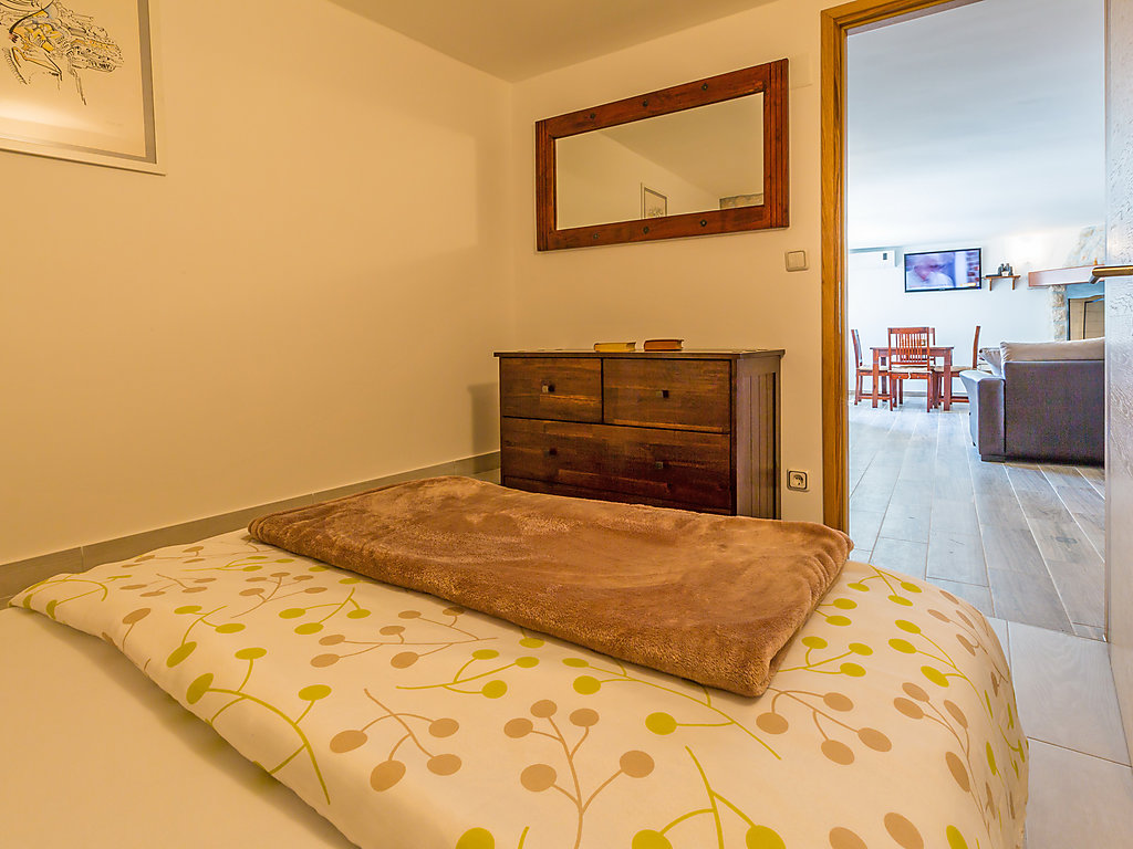 3-Zimmer-Wohnung 50 m2, unteres Geschoss, Südostlage. Wohn-/Esszimmer, Deckenhöhe 220 cm mit offenem Kamin und Sat-TV (Flachbildschirm), Klimaanlage. Ausgang zur Terrasse, zum Schwimmbad. 1 Zimmer, Deckenhöhe 220 cm, ohne Fenster mit 1 franz. Bett (140 cm, Länge 200 cm). 1 Zimmer, Deckenhöhe 220 cm, ohne Fenster mit 2 Betten (90 cm, Länge 200 cm). Offene Küche (4 Kochplatten, Backofen, Mikrowelle, Tiefkühler, elektrische Kaffeemaschine), Deckenhöhe 220 cm. Dusche/WC. Terrassenmöbel. Zur Verfügung: Internet (Wireless LAN, gratis).