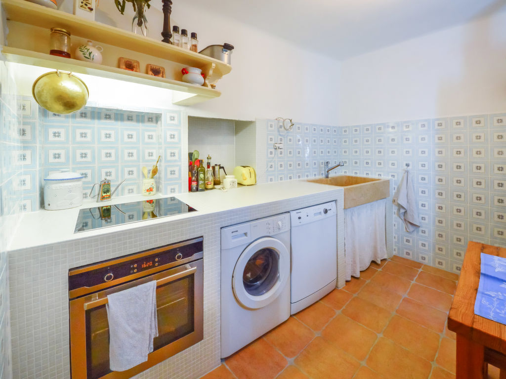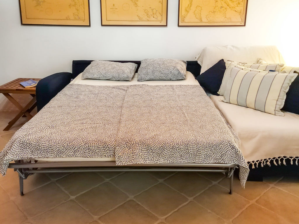 3-Zimmer-Haus 100 m2 auf 2 Stockwerken, Südlage. Wohnzimmer 33 m2 mit 1 Doppeldiwanbett (140 cm, Länge 200 cm), Sat-TV (Flachbildschirm), Klimaanlage. Ausgang zur Terrasse. Esszimmer. Ausgang zur Terrasse. Offene Küche (Backofen, Geschirrspüler, 4 Glaskeramikherd Platten, Mikrowelle, Tiefkühler, elektrische Kaffeemaschine). Dusche/Bidet/WC. Obergeschoss: 1 Zimmer 16 m2 mit 1 Doppelbett (2 x 90 cm, Länge 200 cm), Dusche/Bidet/WC und Klimaanlage. 1 kleines Zimmer mit 1 franz. Bett (140 cm, Länge 200 cm), Klimaanlage. Bodenheizung, Warmluftheizung (extra). Zur Verfügung: Babybett.