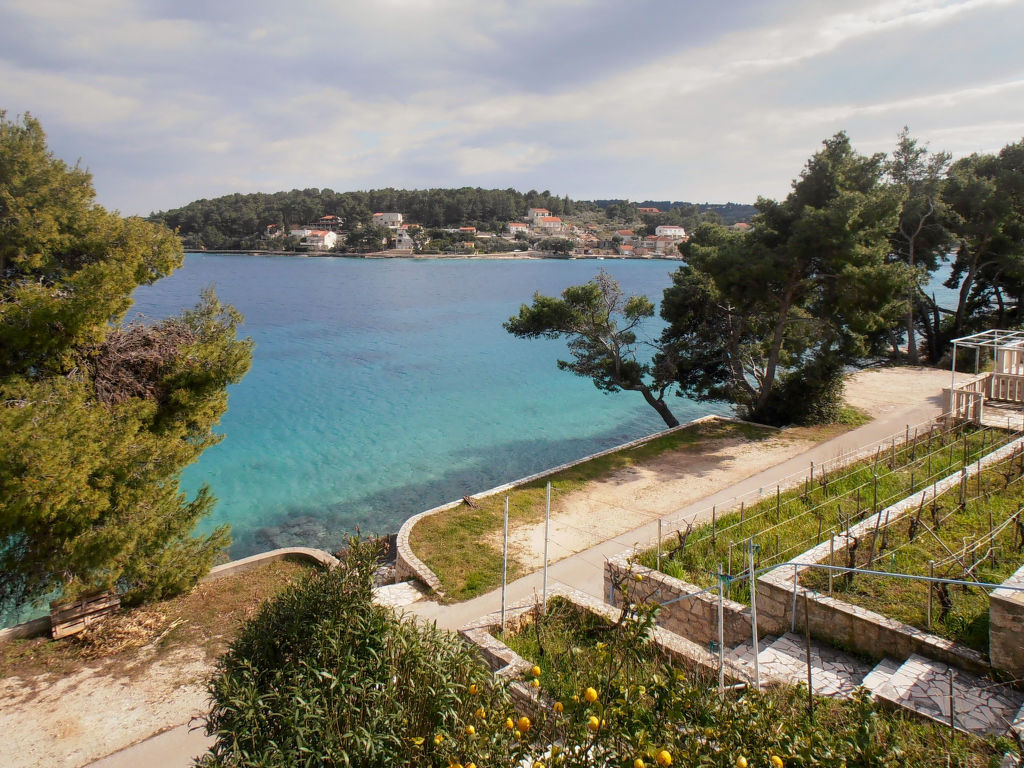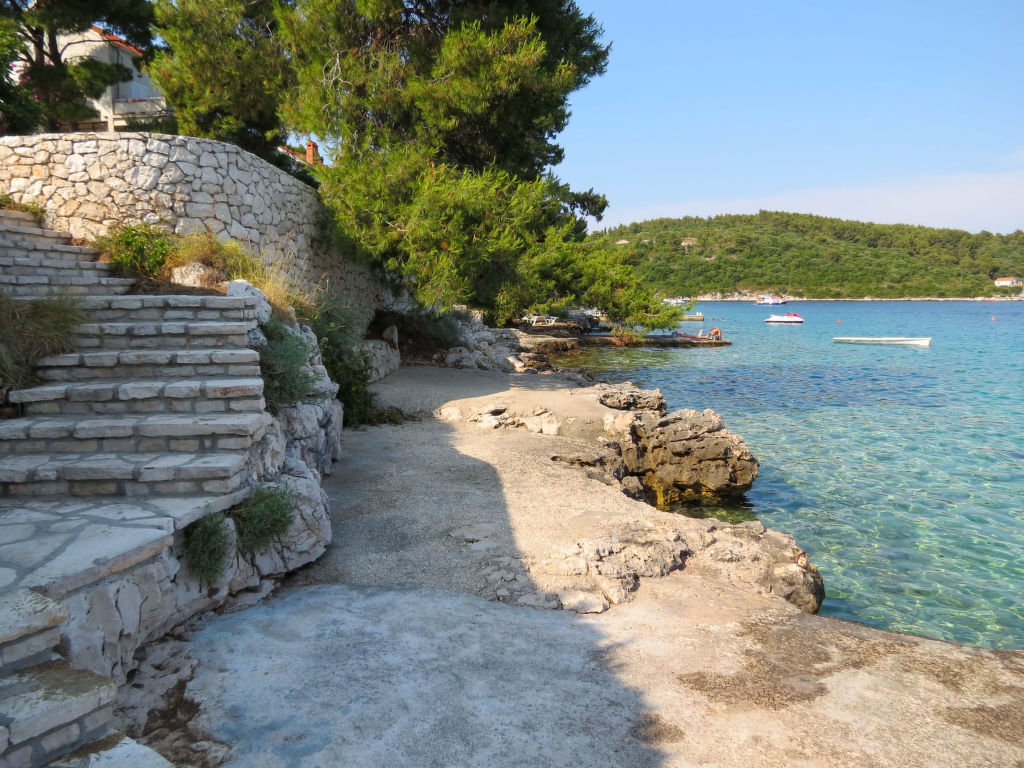 Schönes Einfamilienhaus "Bernardi", auf 2 Stockwerken. Im Ortsteil Lumbardijsko Račišće, 1.5 km vom Zentrum von Lumbarda, sonnige Lage am Hang, 15 m vom Meer, 15 m vom Strand, in einer Sackgasse, im Grünen, Richtung Süden. Zur Alleinbenutzung: Grundstück 550 m2 (eingezäunt). Aussendusche, Grill. Im Hause: Internetzugang. Parkplatz beim Haus auf dem Grundstück. Einkaufsgeschäft 1.5 km, Restaurant 1.5 km, Sandstrand 2 km, Kieselstrand 2 km, betonierter Strand 15 m. Das Haus befindet sich an einer hübschen, ruhigen Bucht. Treppen führen vom Haus über eine kleine Sackgasse zum Betonstrand.