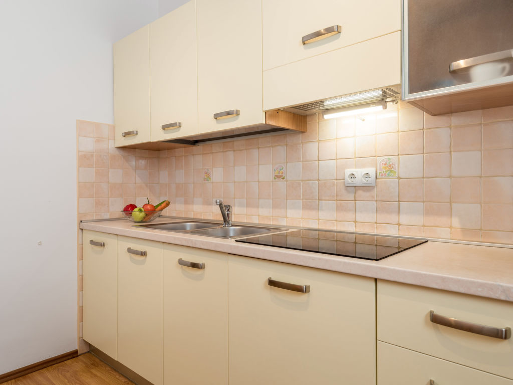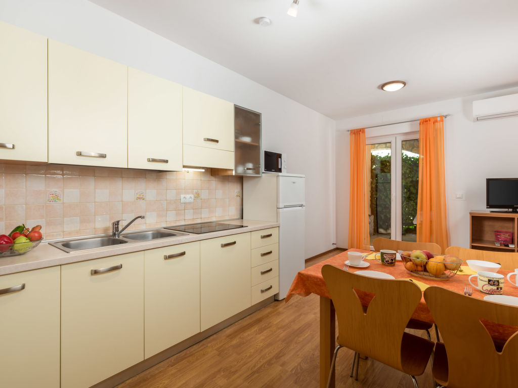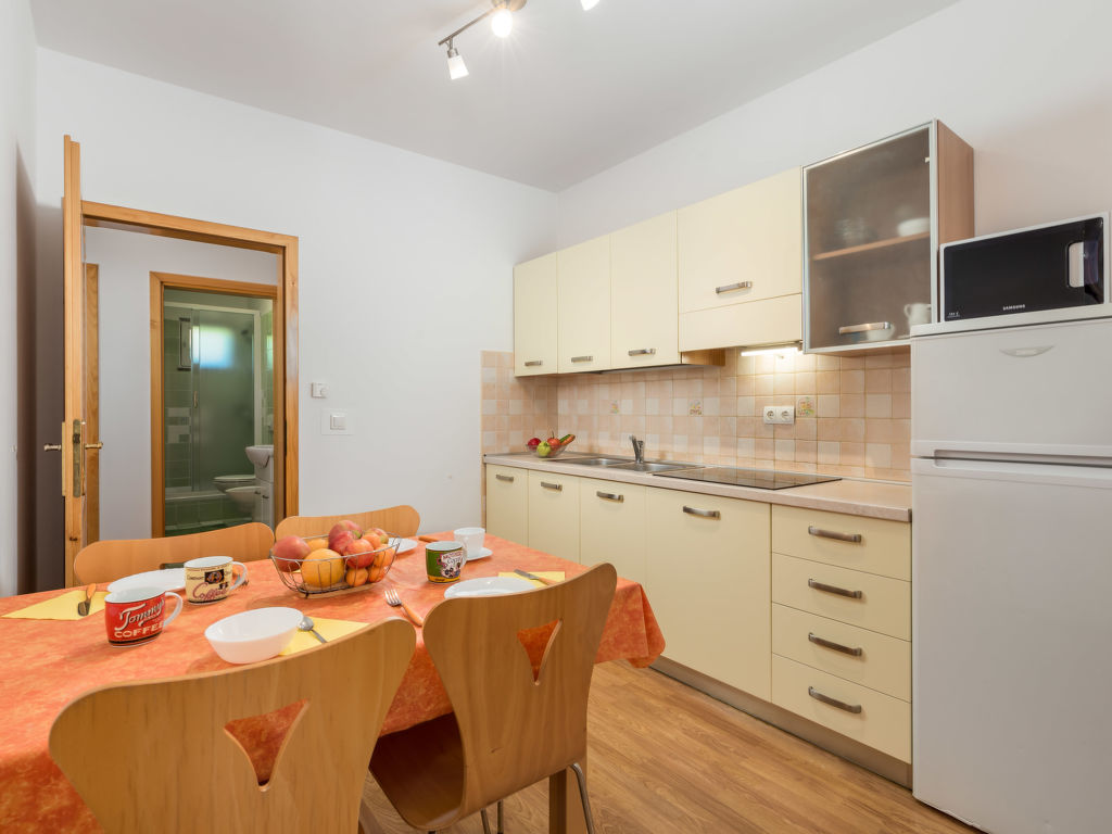 3-Zimmer-Wohnung, Erdgeschoss, ca. 45 m². Wohn-/Schlafraum mit Bettcouch, Essplatz, Küchenzeile (4 Platten, Mikrowelle, Kühl-/Gefrierkombination, Kaffeemaschine, Wasserkocher, Toaster) und Terrassenausgang. Doppelzimmer. Zweibettzimmer. Dusche/WC.