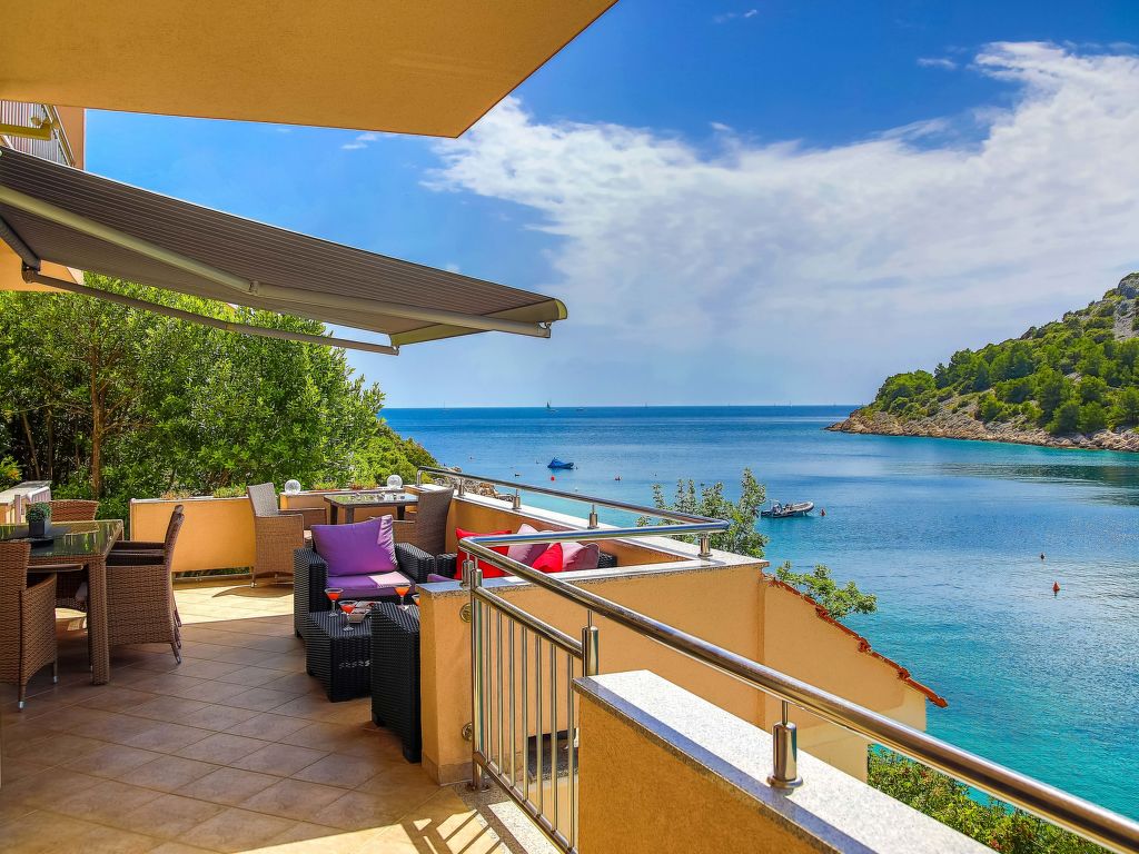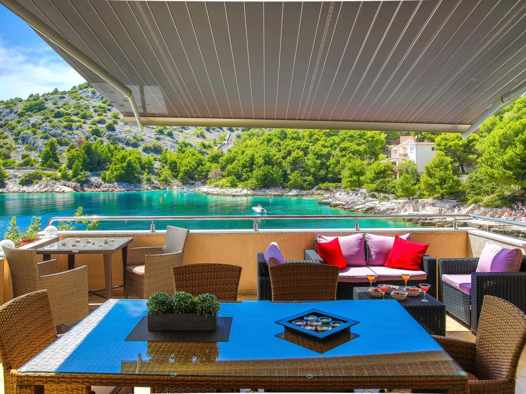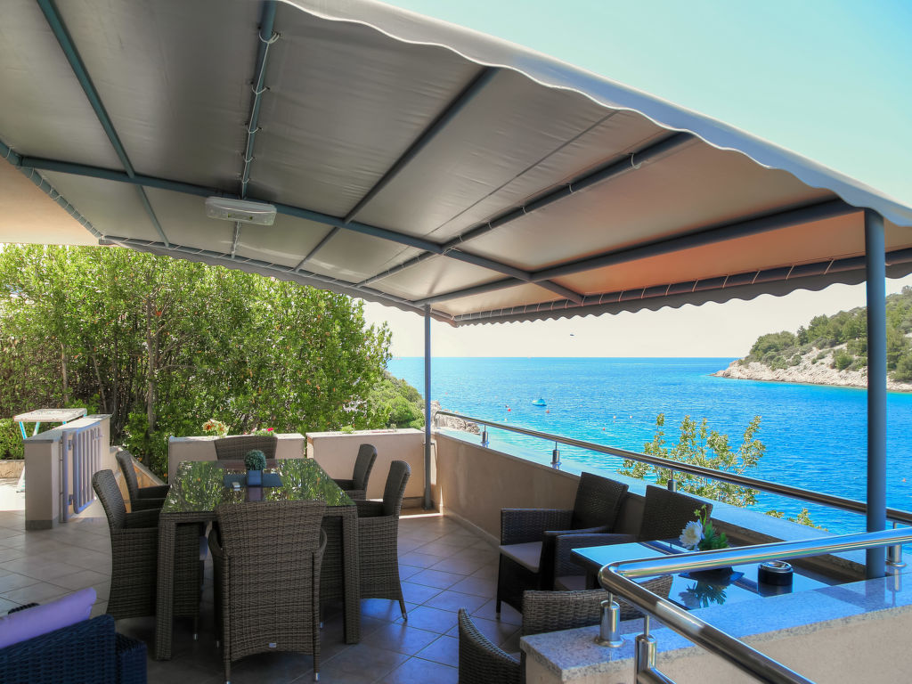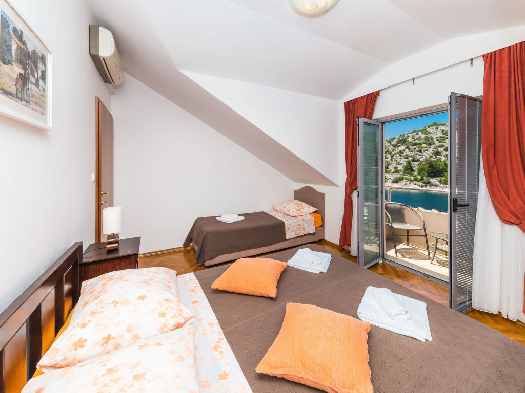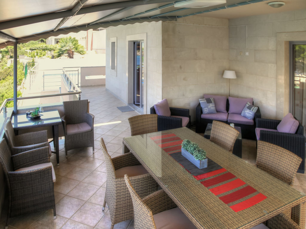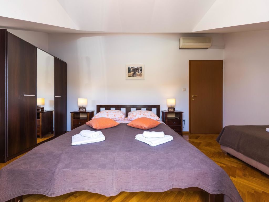 5-Zimmer-Haus 180 m2 auf 3 Stockwerken, Südlage. Geschmackvoll und gemütlich eingerichtet: Wohnzimmer mit Sat-TV (Flachbildschirm), Klimaanlage. Ausgang zur Terrasse. Esszimmer. Offene Küche (4 Kochplatten, Backofen, Geschirrspüler). Sep. WC. Obergeschoss: 2 Zimmer, jedes Zimmer mit 1 Doppelbett (2 x 80 cm, Länge 200 cm). Ausgang zur Terrasse. 1 Zimmer mit 2 Betten (90 cm, Länge 200 cm). Ausgang zur Terrasse. Bad/WC. Dachgeschoss: 1 Zimmer, Deckenhöhe 120 - 370 cm mit 1 Bett (90 cm, Länge 190 cm), 1 franz. Bett (160 cm, Länge 200 cm). Ausgang zum Balkon. Dusche/WC. Balkon 2 m2, Terrasse 40 m2, überdacht, 2 Terrassen 10 m2. Terrassenmöbel. Herrliche Sicht auf das Meer. Zur Verfügung: Waschmaschine, Babybett. Internet (Wireless LAN, gratis). Parkplatz (überdacht, 3 Autos). Bitte beachten: Private Bootsanlegestelle.