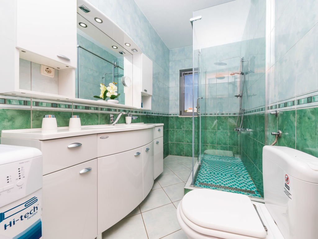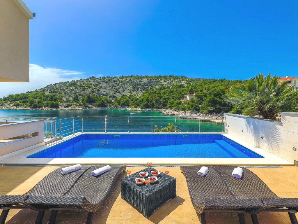 Ražanj 10 km von Rogoznica: Schönes Einfamilienhaus "Villa Silvana", auf 3 Stockwerken. Ruhige, sonnige Lage, direkt am Meer, direkt am Strand, direkter Zugang zum Strand. Zur Alleinbenutzung: Grundstück 300 m2 (eingezäunt), Terrassengarten, Schwimmbad eckig, beheizt (8 x 3 m, 100 - 180 cm tief, 04.04.-10.10.). Grill. Im Hause: Internetzugang. Parkplatz (überdacht) beim Haus auf dem Grundstück. Einkaufsgeschäft, Restaurant 500 m, Felsstrand 10 m.