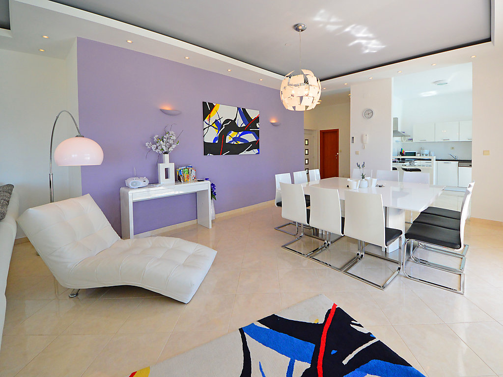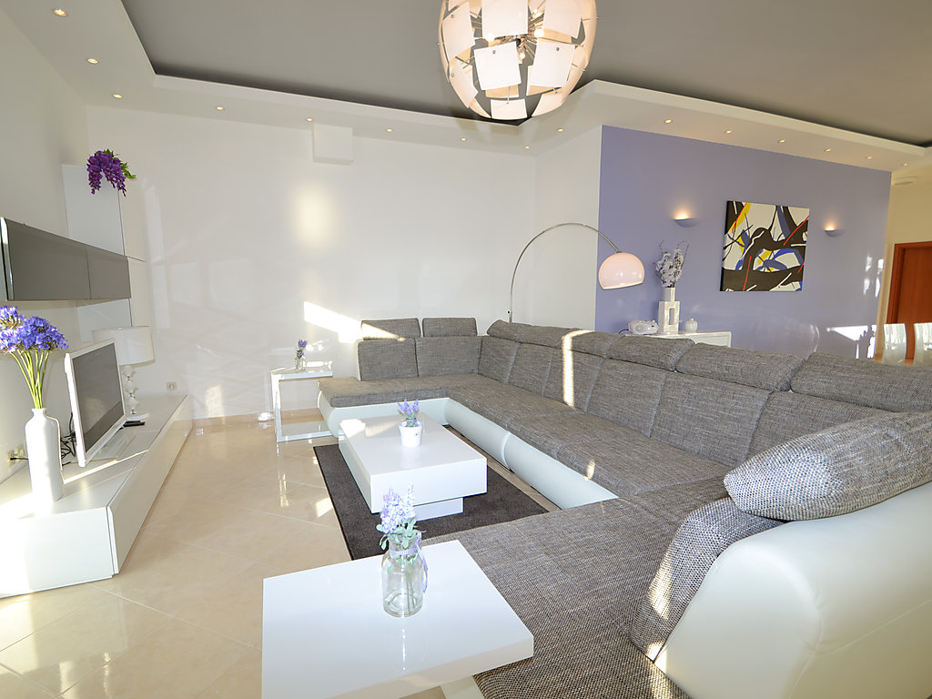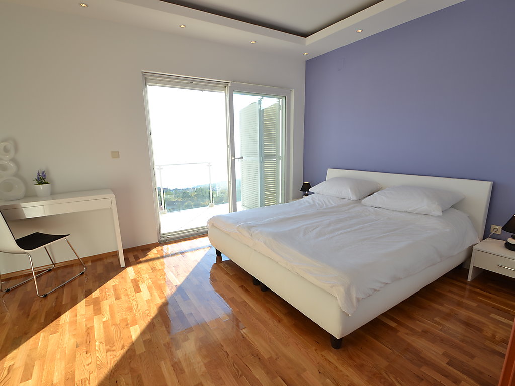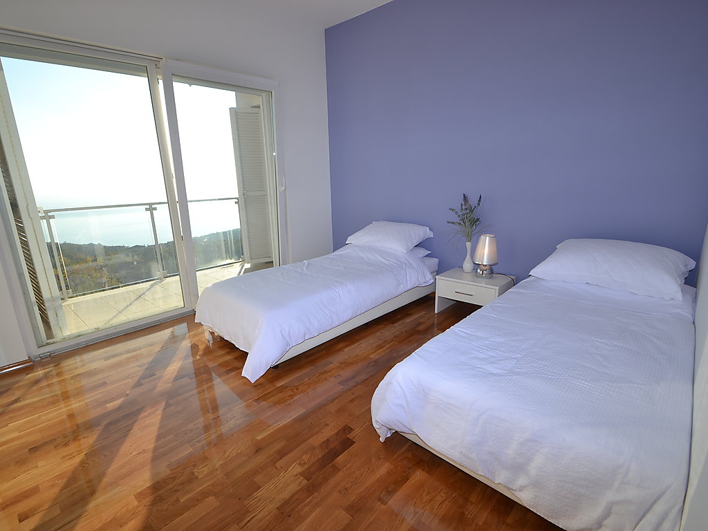 6-Zimmer-Doppelhaushälfte 270 m2 auf 3 Stockwerken, Südostlage. Modern und geschmackvoll eingerichtet: grosses Wohn-/Esszimmer 65 m2 mit Sat-TV (Flachbildschirm), Klimaanlage. Ausgang zur Terrasse, zum Schwimmbad. Offene Küche (Backofen, Geschirrspüler, 4 Glaskeramikherd Platten, Mikrowelle, Tiefkühler). Sep. WC. Obergeschoss: 1 Zimmer mit 1 Doppelbett (2 x 80 cm, Länge 200 cm), Bad/Bidet/WC, Doppelwaschbecken, Sprudelbad und Klimaanlage. Ausgang zum Balkon. 2 Zimmer, jedes Zimmer mit 2 Betten (90 cm, Länge 200 cm), Klimaanlage. Ausgang zum Balkon. Dusche/Bidet/WC, Hydromassage-Dusche. 2. Obergeschoss: Wohn-/Schlafzimmer mit 1 Doppelbett (2 x 80 cm, Länge 200 cm), Sat-TV (Flachbildschirm), Klimaanlage. Ausgang zum Balkon. 1 Zimmer mit 1 Doppelbett (2 x 80 cm, Länge 200 cm), Bad/Dusche/Bidet/WC, Doppelwaschbecken, Hydromassage-Dusche, Sprudelbad und Sat-TV (Flachbildschirm), Klimaanlage. Ausgang zum Balkon. 2 Balkone 12 m2. Abstellkammer. Herrliche Panoramasicht auf das Meer und die Landschaft. Zur Verfügung: Safe, Bügeleisen, Babybett. Internet (Wireless LAN, gratis). Bitte beachten: Nichtraucher-Haus. 1 Haustier/Hund erlaubt.