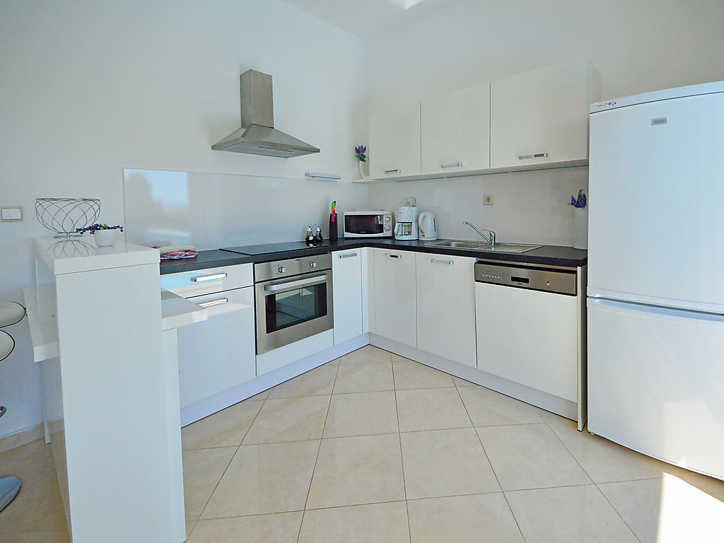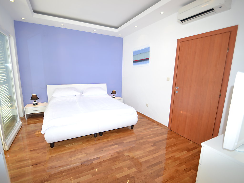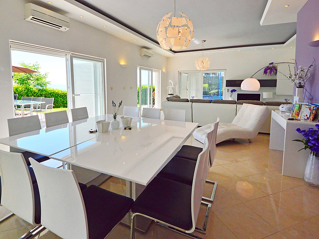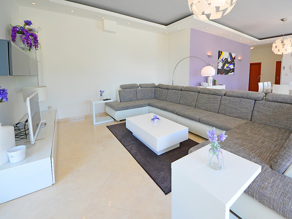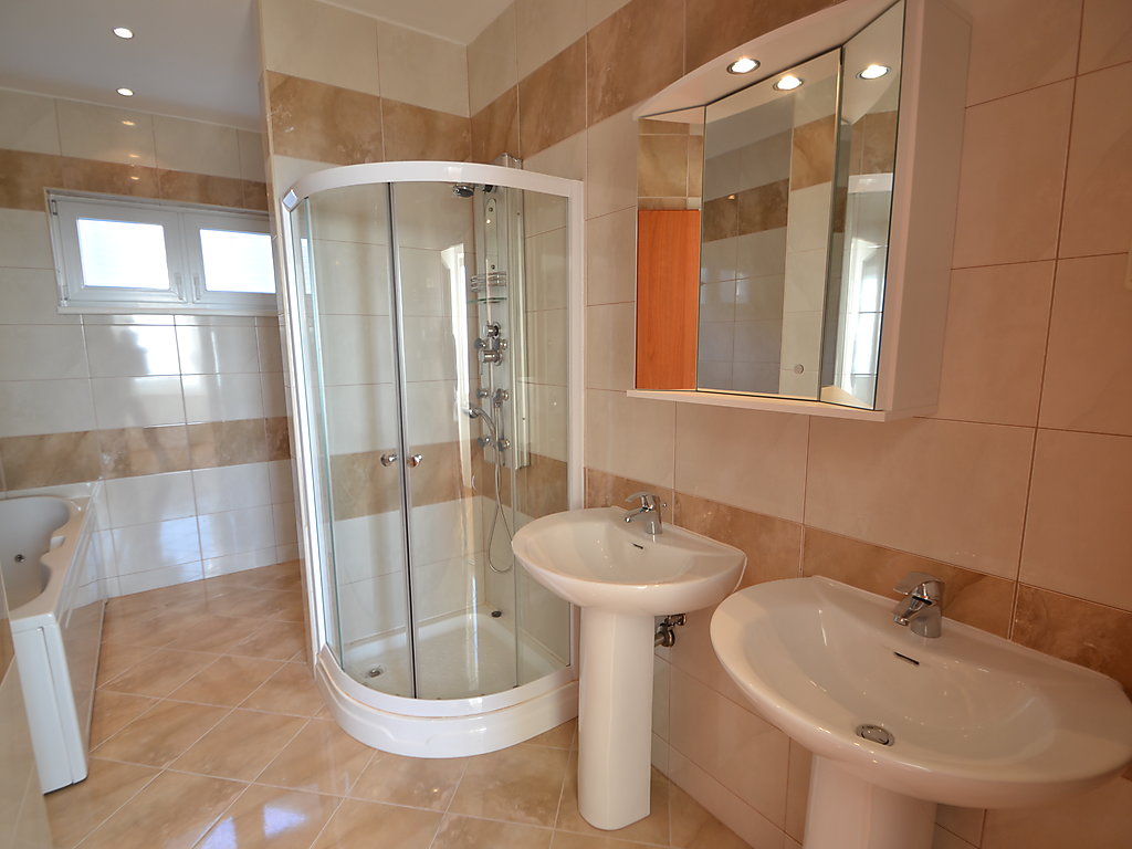 6-Zimmer-Doppelhaushälfte 270 m2 auf 3 Stockwerken, Südostlage. Modern und geschmackvoll eingerichtet: grosses Wohn-/Esszimmer 65 m2 mit Sat-TV (Flachbildschirm), Klimaanlage. Ausgang zur Terrasse, zum Schwimmbad. Offene Küche (Backofen, Geschirrspüler, 4 Glaskeramikherd Platten, Mikrowelle, Tiefkühler). Sep. WC. Obergeschoss: 1 Zimmer mit 1 Doppelbett (2 x 80 cm, Länge 200 cm), Bad/Bidet/WC, Doppelwaschbecken, Sprudelbad und Klimaanlage. Ausgang zum Balkon. 2 Zimmer, jedes Zimmer mit 2 Betten (90 cm, Länge 200 cm), Klimaanlage. Ausgang zum Balkon. Dusche/Bidet/WC, Hydromassage-Dusche. 2. Obergeschoss: Wohn-/Schlafzimmer mit 1 Doppelbett (2 x 80 cm, Länge 200 cm), Sat-TV (Flachbildschirm), Klimaanlage. Ausgang zum Balkon. 1 Zimmer mit 1 Doppelbett (2 x 80 cm, Länge 200 cm), Bad/Dusche/Bidet/WC, Doppelwaschbecken, Hydromassage-Dusche, Sprudelbad und Sat-TV (Flachbildschirm), Klimaanlage. Ausgang zum Balkon. 2 Balkone 12 m2. Abstellkammer. Herrliche Panoramasicht auf das Meer und die Landschaft. Zur Verfügung: Safe, Bügeleisen, Babybett. Internet (Wireless LAN, gratis). Bitte beachten: Nichtraucher-Haus. 1 Haustier/Hund erlaubt.