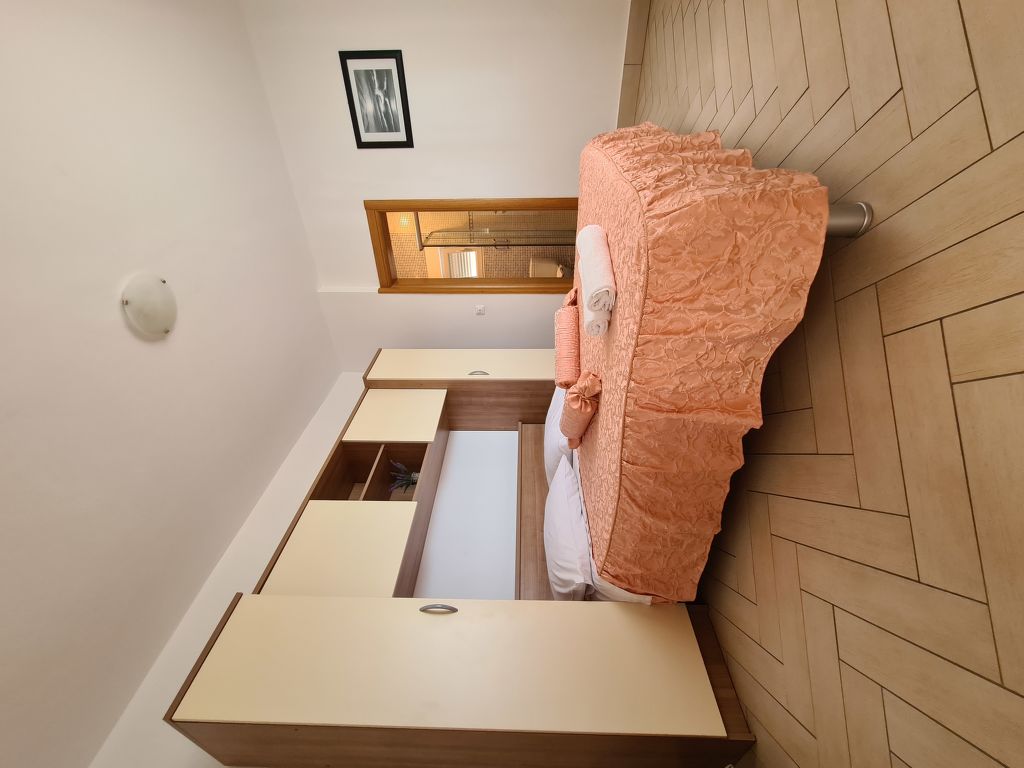 5-Zimmer-Wohnung, 2. Etage, ca. 130 m². Zugang über Außentreppe. Wohnraum mit Sitzcouch, Essplatz, Küche (2 Ceranfelder, 2 Flammen, Backofen, Geschirrspüler, Kühl-/Gefrierkombination, Kaffeemaschine, Wasserkocher, Toaster), Balkonausgang. Schlafzimmer mit franz. Bett, Balkonausgang. Schlafzimmer mit franz. Bett, Dusche/WC. Zweibettzimmer, Balkonausgang, Dusche/WC. Zweibettzimmer mit Balkonausgang. Dusche/WC.