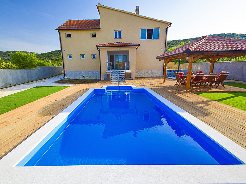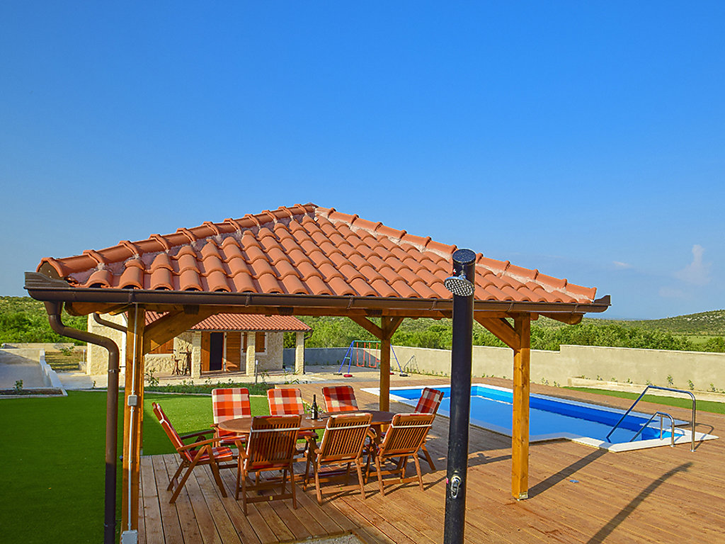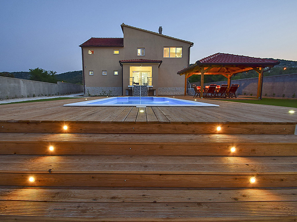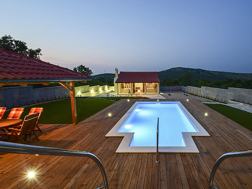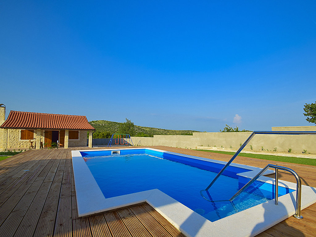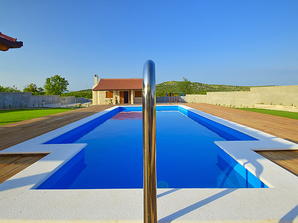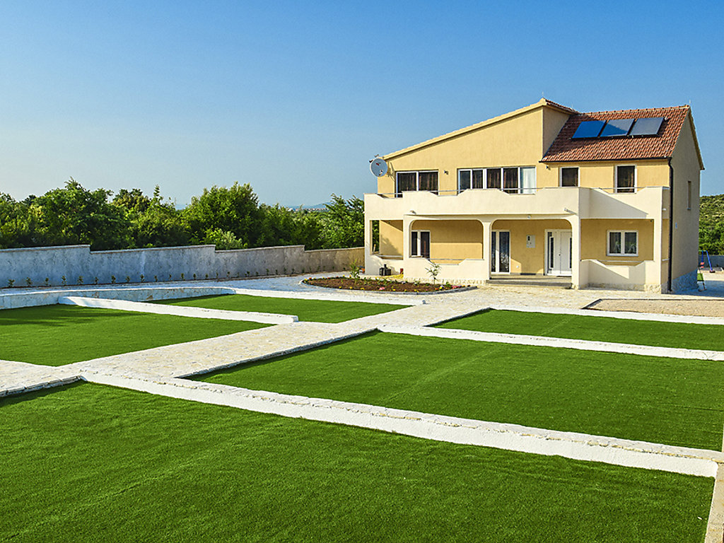 Einfamilienhaus "Julija", auf 2 Stockwerken. Im Weiler Grabovci, 11 km vom Zentrum von Vodice, sonnige Lage, 8 km vom Meer, an einer Strasse. Zur Alleinbenutzung: Grundstück 3'500 m2 (eingezäunt) mit Rasen 100 m2, Schwimmbad eckig (25 m2, 140 cm tief, 01.04.-15.10.). Aussendusche, Poolhaus mit Kühlschrank, WC und Kochherd, Tischtennis, Boccia, Laube (20 m2), Terrasse (80 m2), Gartenmöbel, Grill, Kinderspielplatz (Rutschbahn, Schaukel). Im Hause: Internetzugang, Sauna, Sprudelbad, Tischfussball, Zentralheizung, Waschmaschine. Zur Verfügung: Boot (extra). Wohnungsreinigung möglich (extra). Abholservice vom Flughafen (extra). Parkplatz (für 3 Autos, überdacht) beim Haus auf dem Grundstück. Einkaufsgeschäft 10 km, Restaurant 8 km, Kieselstrand 12 km, Strandbad 12 km. Radweg 6 km. Nahe gelegene Sehenswürdigkeiten: NP Krka 30 km. Bekannte Seen in der Umgebung sind gut erreichbar: Vransko jezero 20 km. Es kann auf Anfrage ein Transfer ab Flughafen zum Ferienobjekt organisiert werden.